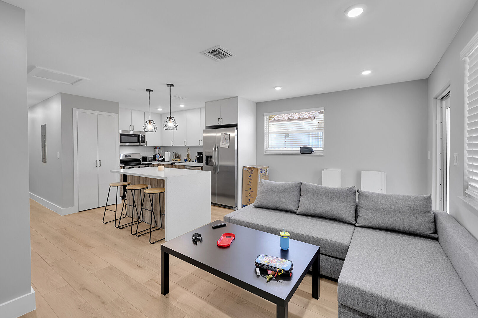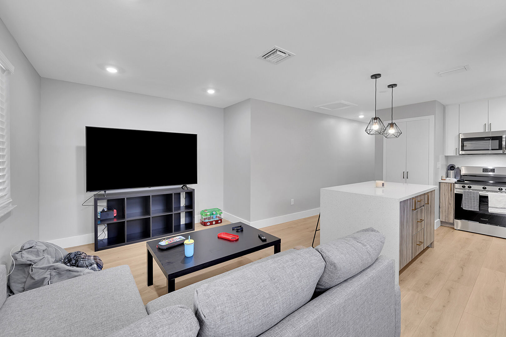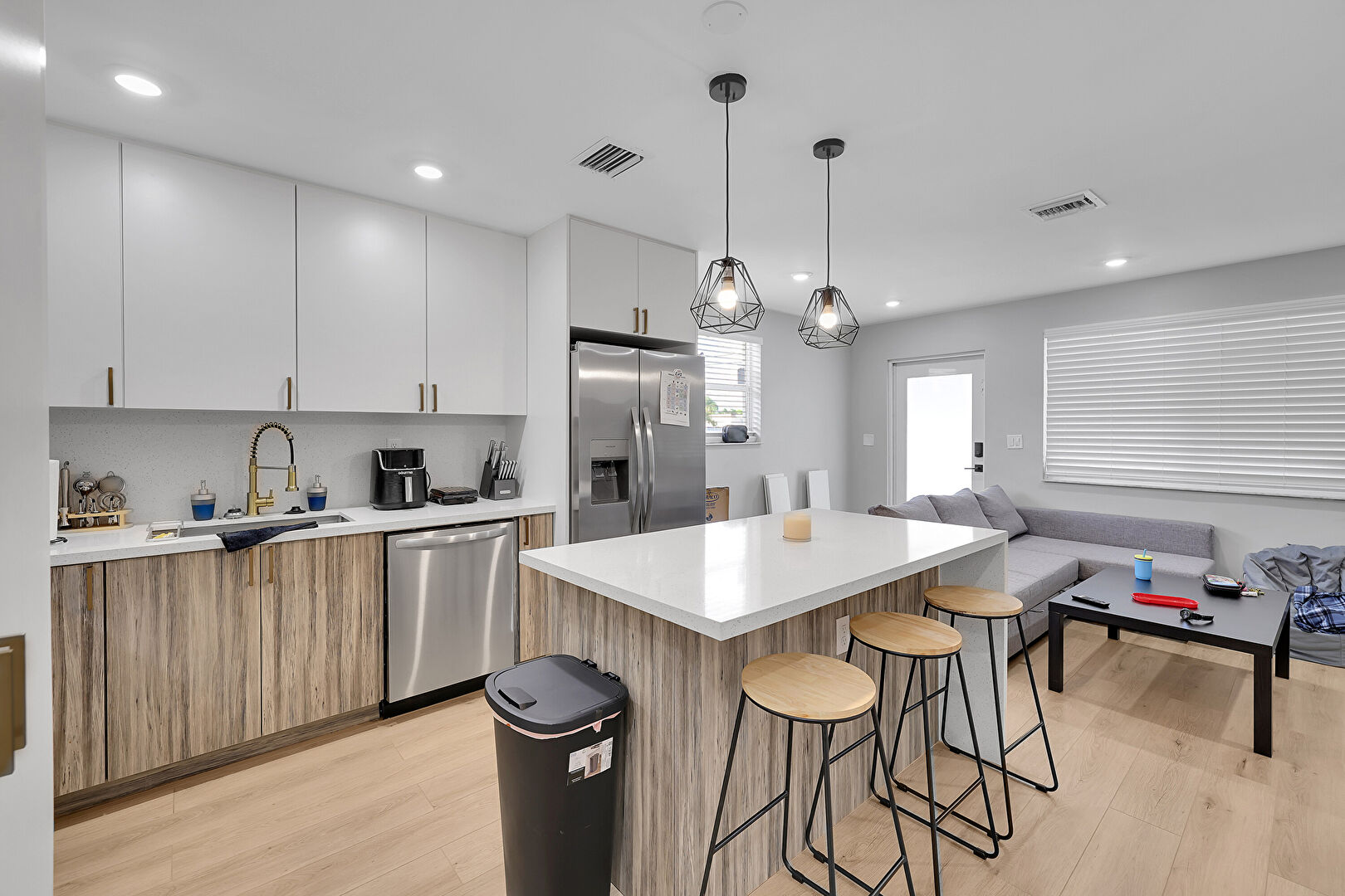 Baseboards Wall, Ceiling Fan, Drywall, Electric Panel, Flat Panel Cabinets, Galley Kitchen, Kitchen Bar, Kitchen Island, L Shaped Kitchen, Natural Light, Opens To Living Area, Pendant Lighting, Recessed Lighting, Stone Countertops, Vent, Wood Finish Floor, Flat Panel Cabinets, Kitchen Island, Natural Light, Recessed Lighting, Vent, Wood Finish Floor