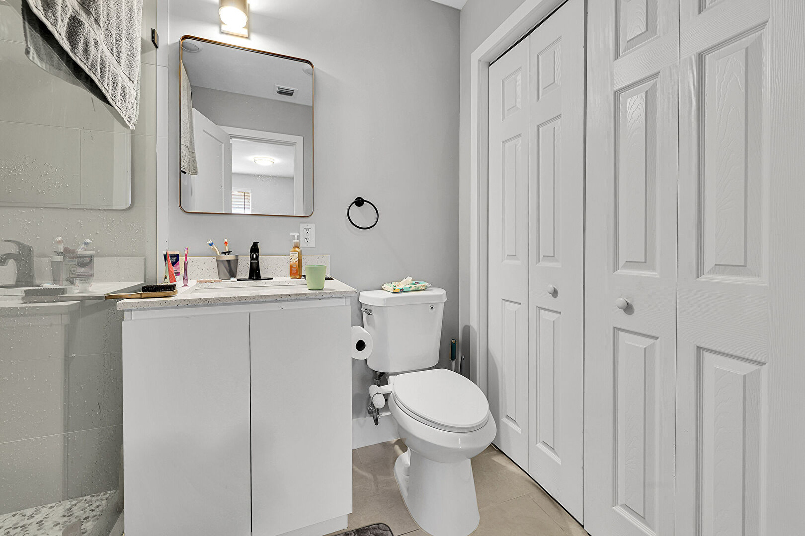 Closet, Drywall, Full Bathroom, Tile Floor, Vanity, Vent, Wood Finish Floor, Combined Bath Shower, Drywall, Full Bathroom