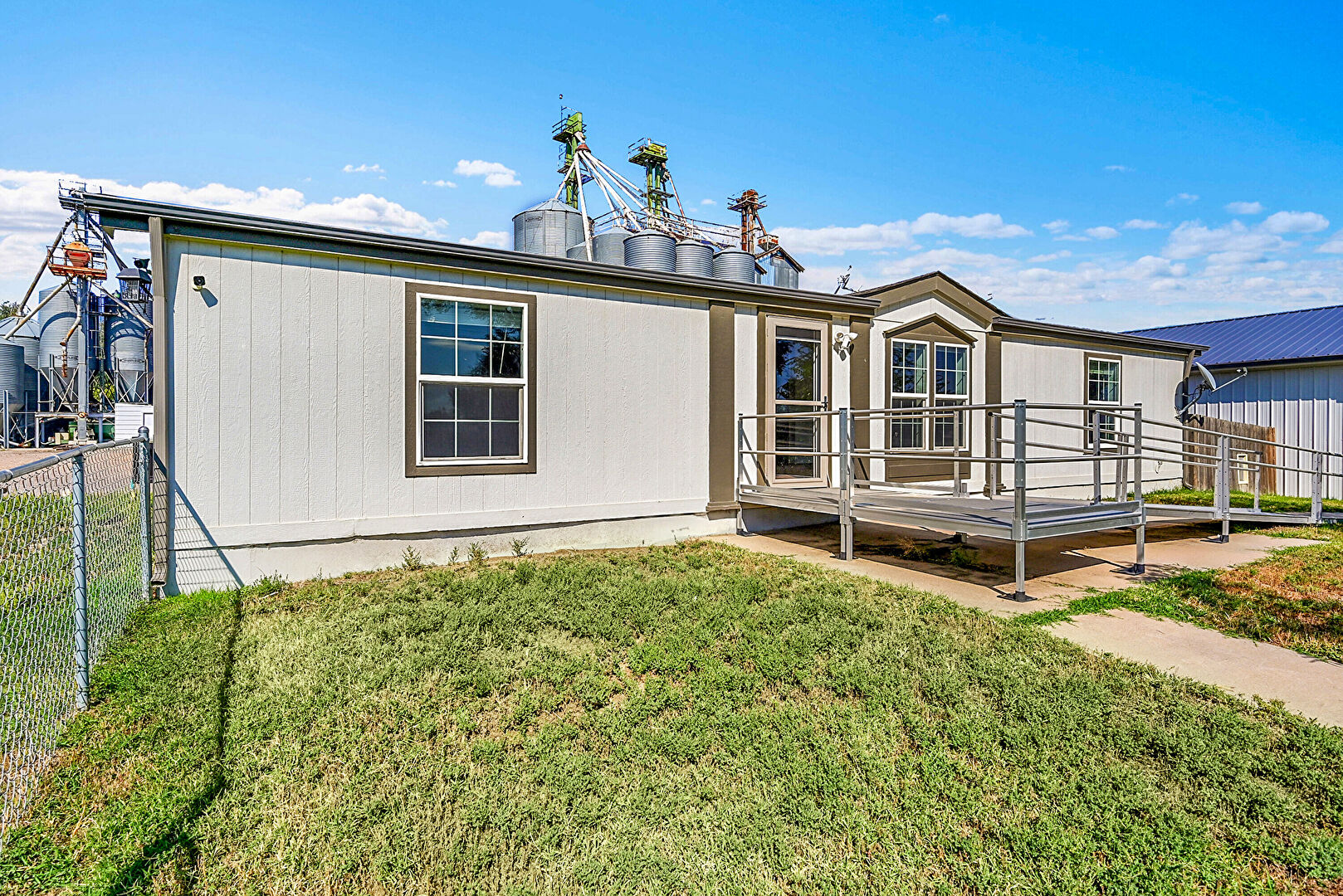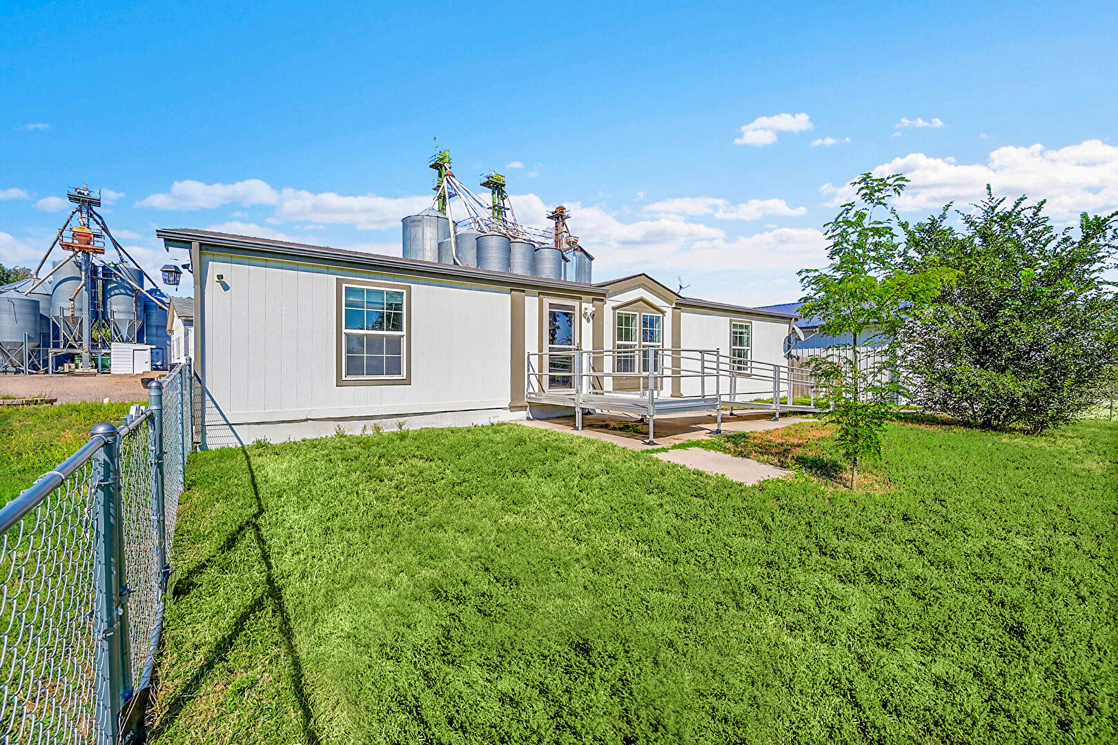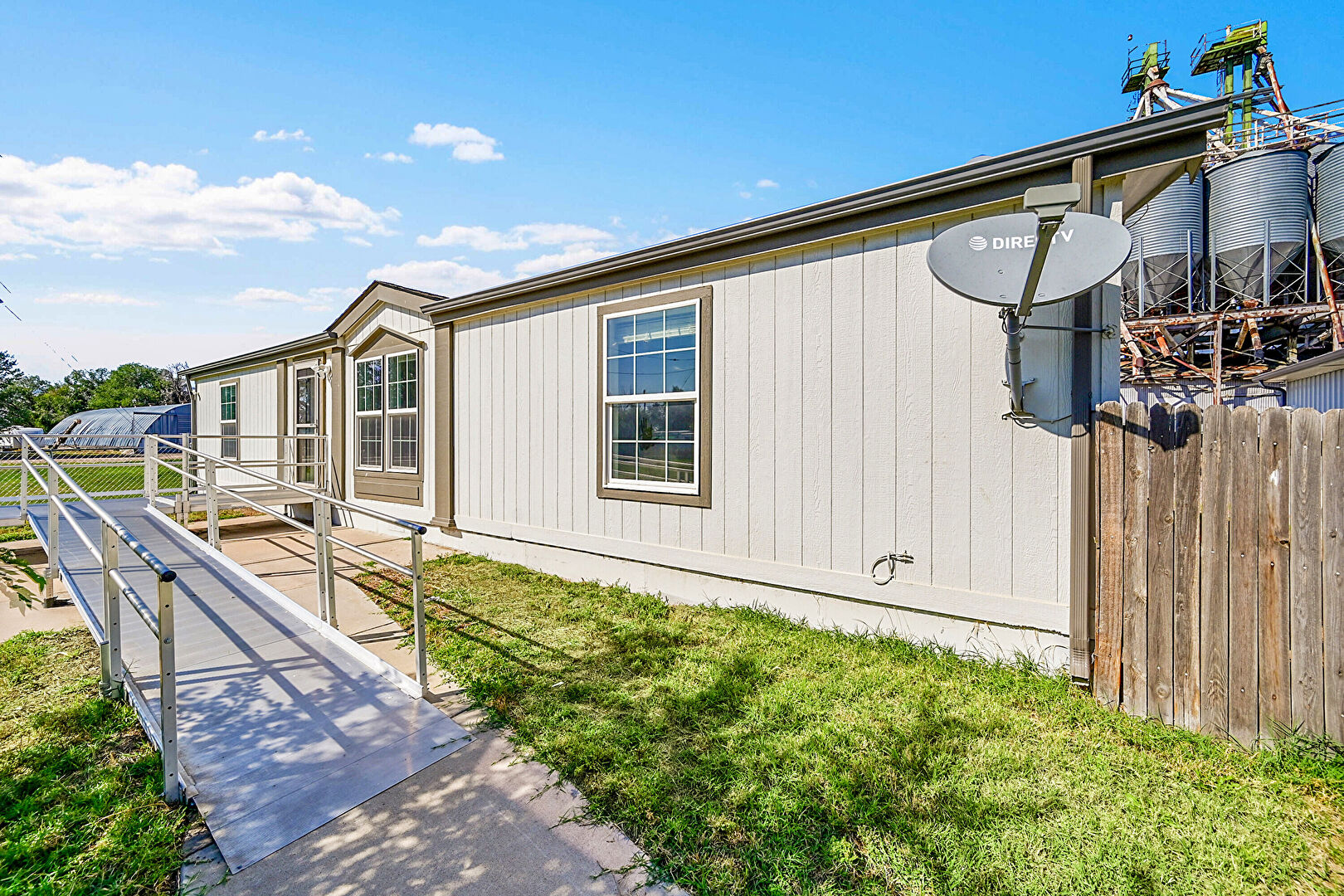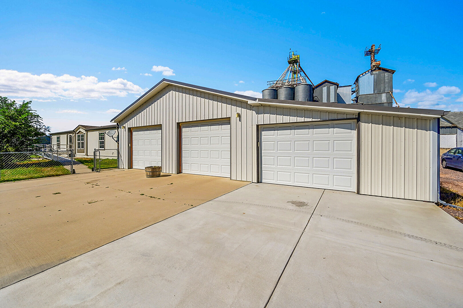 Chimney, Concrete Foundation, Detached Garage, Downspout, Fence, Garage, Gutters, Lawn, Outdoor Structure, Rural View, Satellite Dish, Skirt, Vertical Siding, Deck, Fence, Industrial View, Outdoor Structure, Stoop