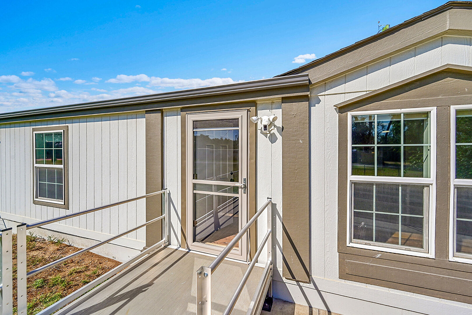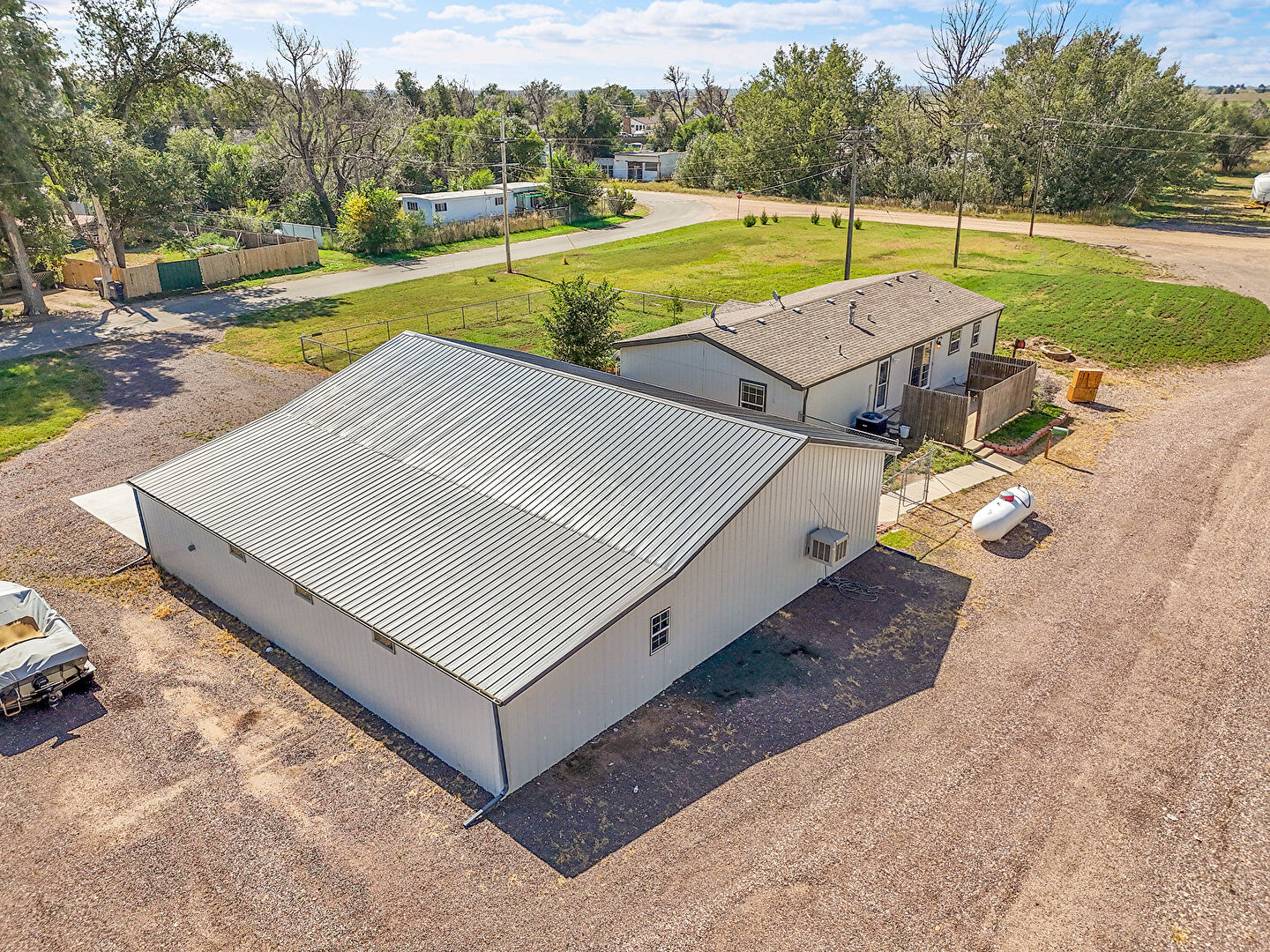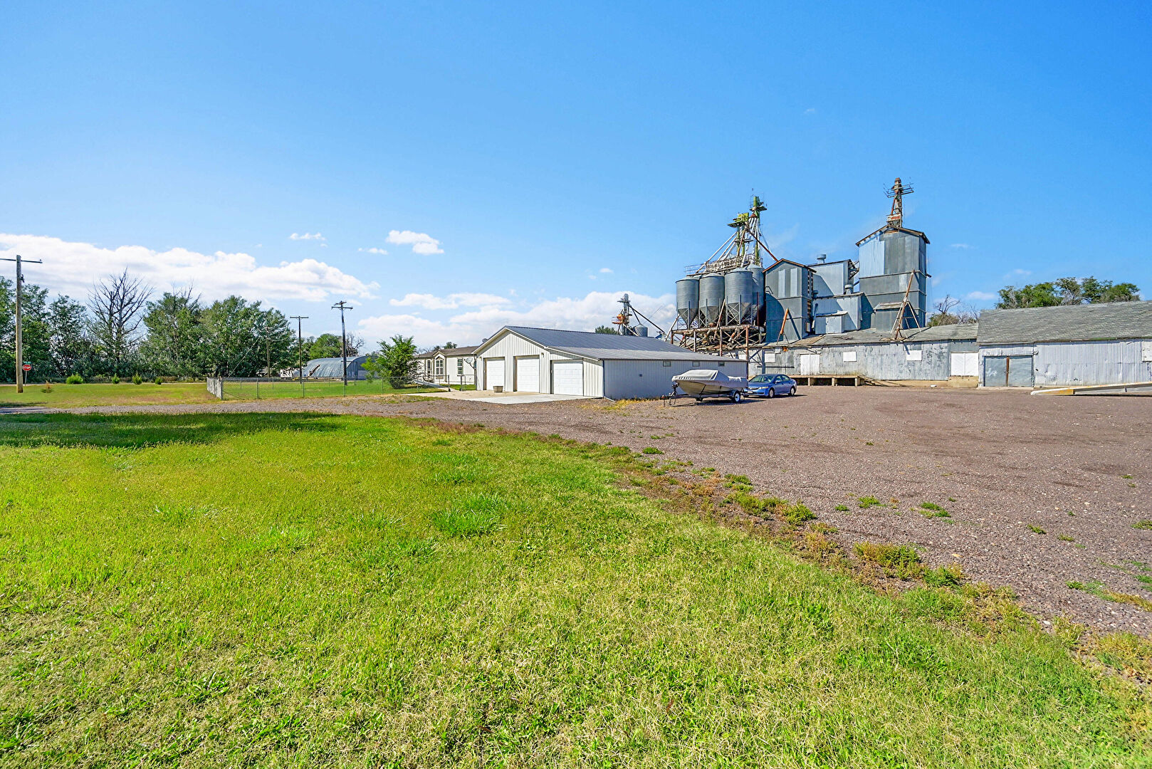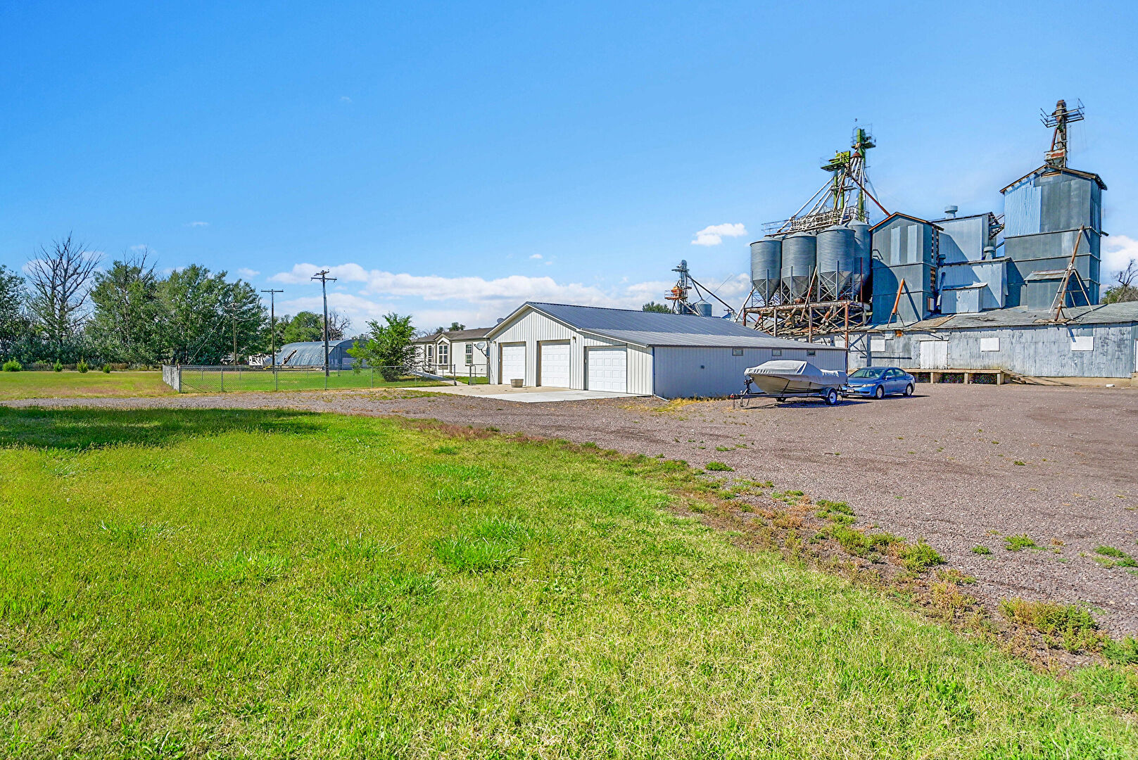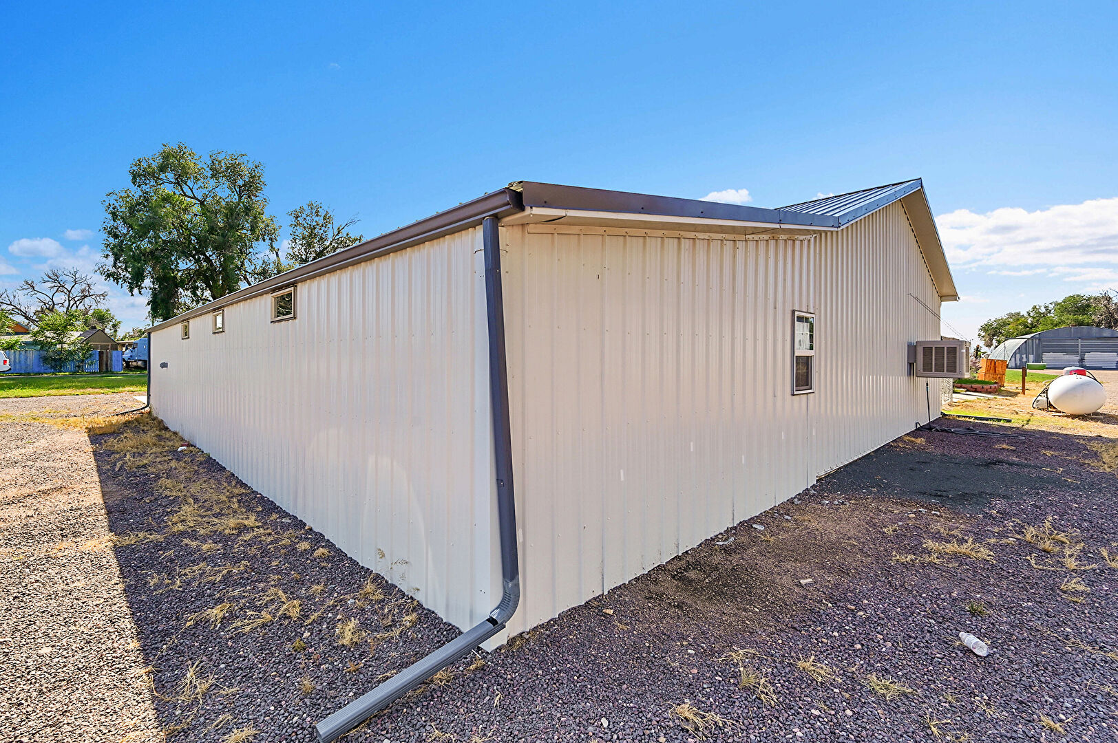 Chimney, Concrete Foundation, Detached Garage, Downspout, Fence, Garage, Gutters, Lawn, Outdoor Structure, Rural View, Satellite Dish, Skirt, Vertical Siding, Deck, Fence, Industrial View, Outdoor Structure, Stoop