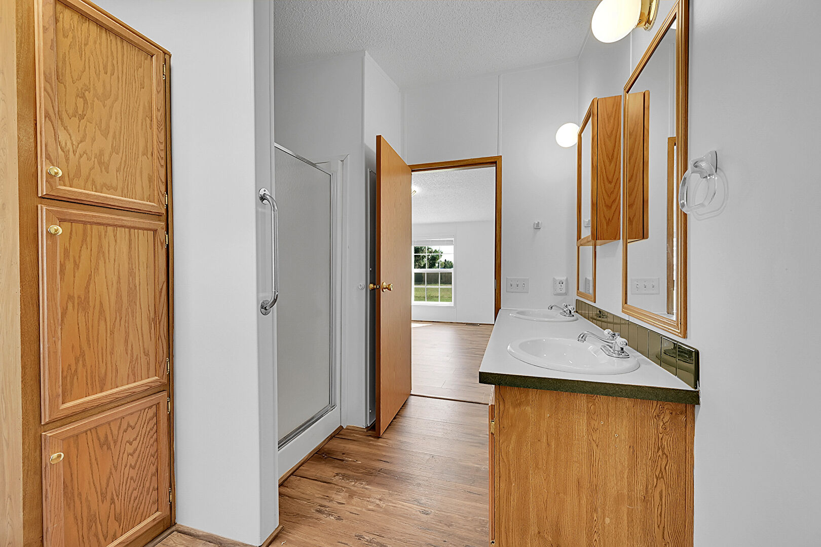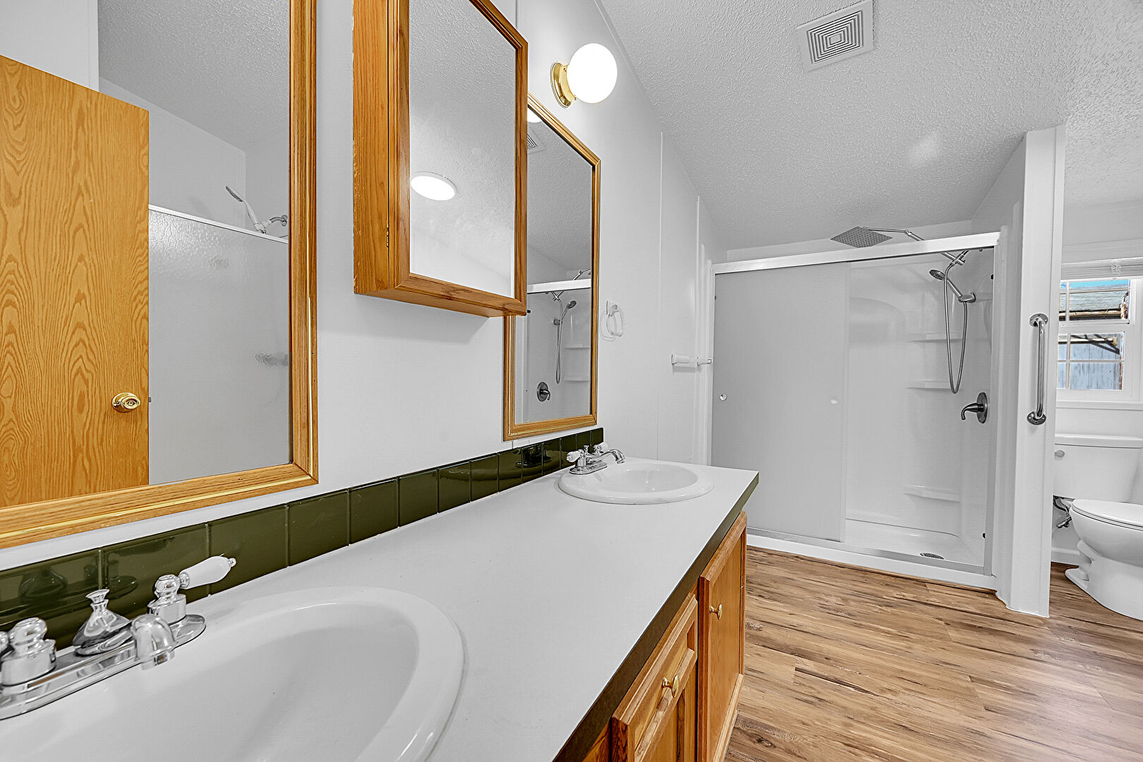 Double Vanity, Full Bathroom, Natural Light, Textured Ceiling, Vent, Wood Finish Floor, Drywall