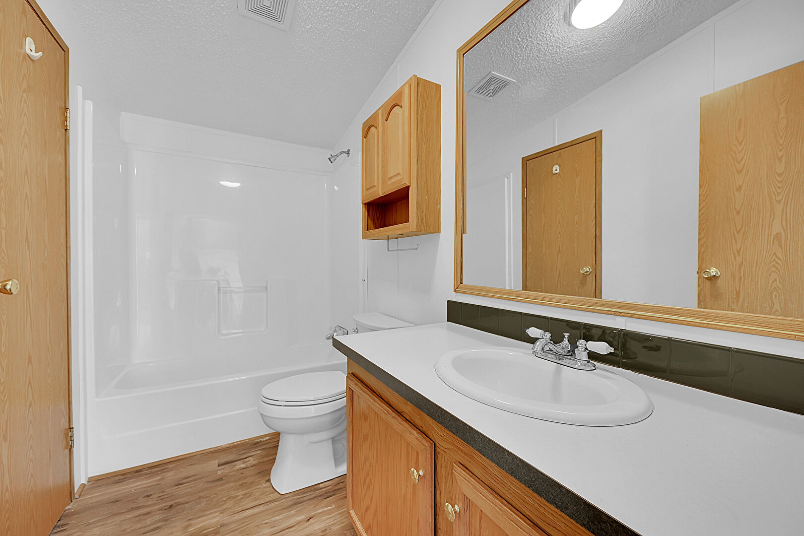 Combined Bath Shower, Drywall, Textured Ceiling, Vanity, Vent, Wood Finish Floor, Full Bathroom
