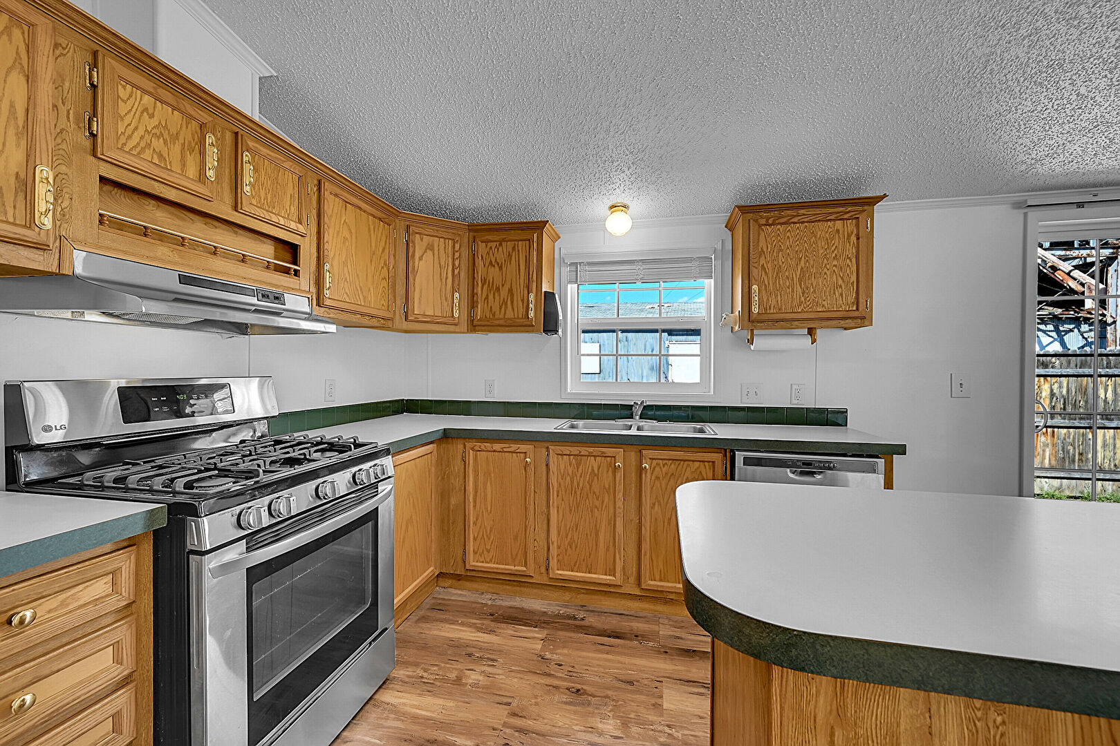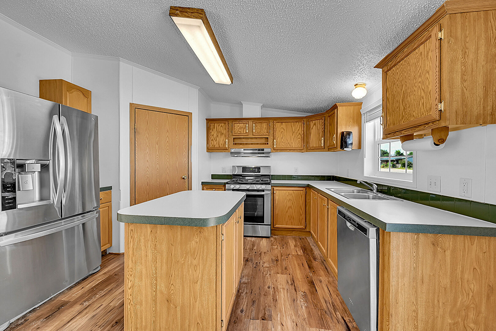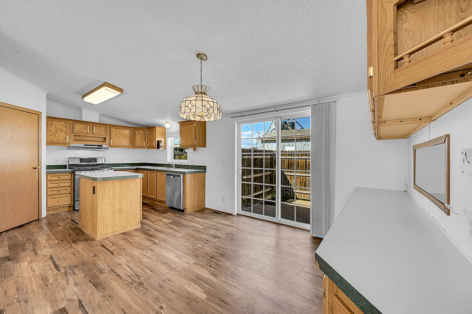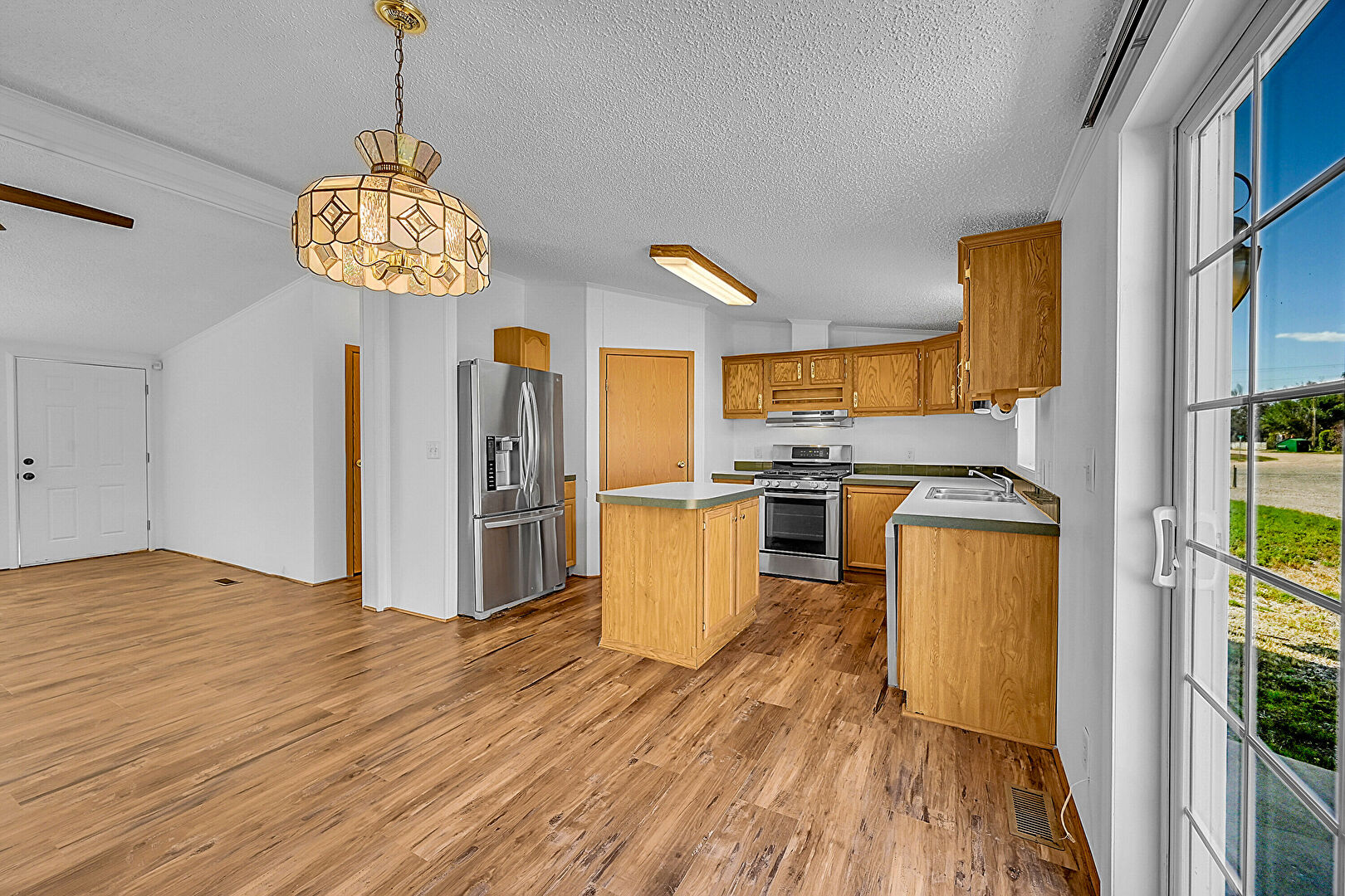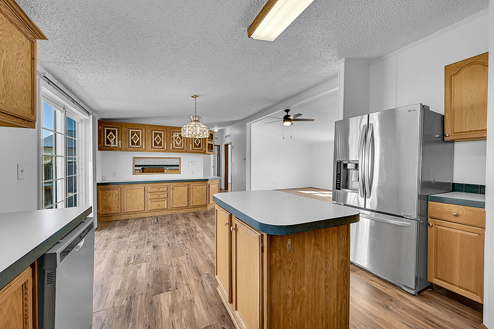 Arched Cabinets, Ceiling Fan, Crown Molding, Crown Molding Cabinets, Drywall, Kitchen Island, Medium Brown Cabinets, Natural Light, Notable Chandelier, Opens To Living Area, Pendant Lighting, Raised Cabinets, Shaker Cabinets, Textured Ceiling, U Shaped Kitchen, Vaulted Ceiling, Vent, Visible Hinge Cabinets, Wood Finish Floor, Crown Molding Cabinets, Drywall, Kitchen Island, Medium Brown Cabinets, Natural Light