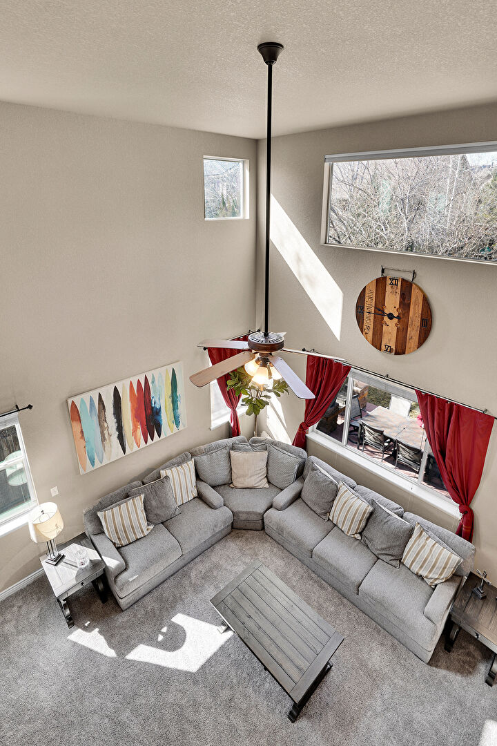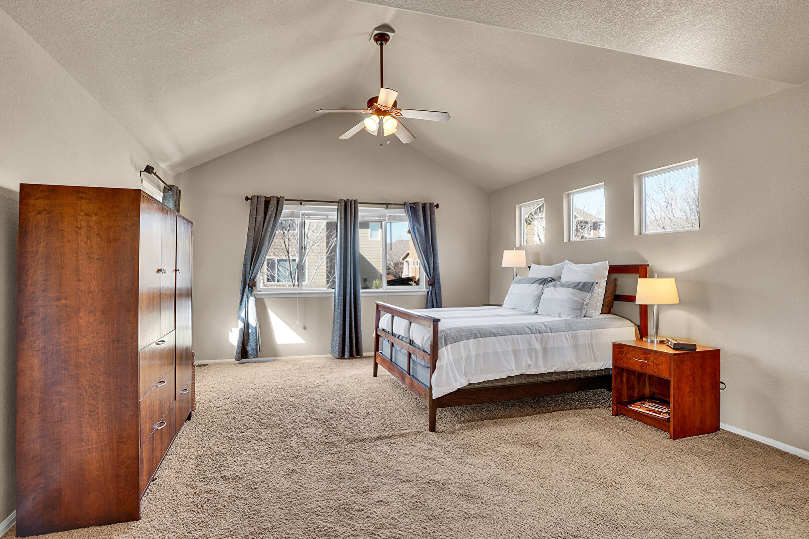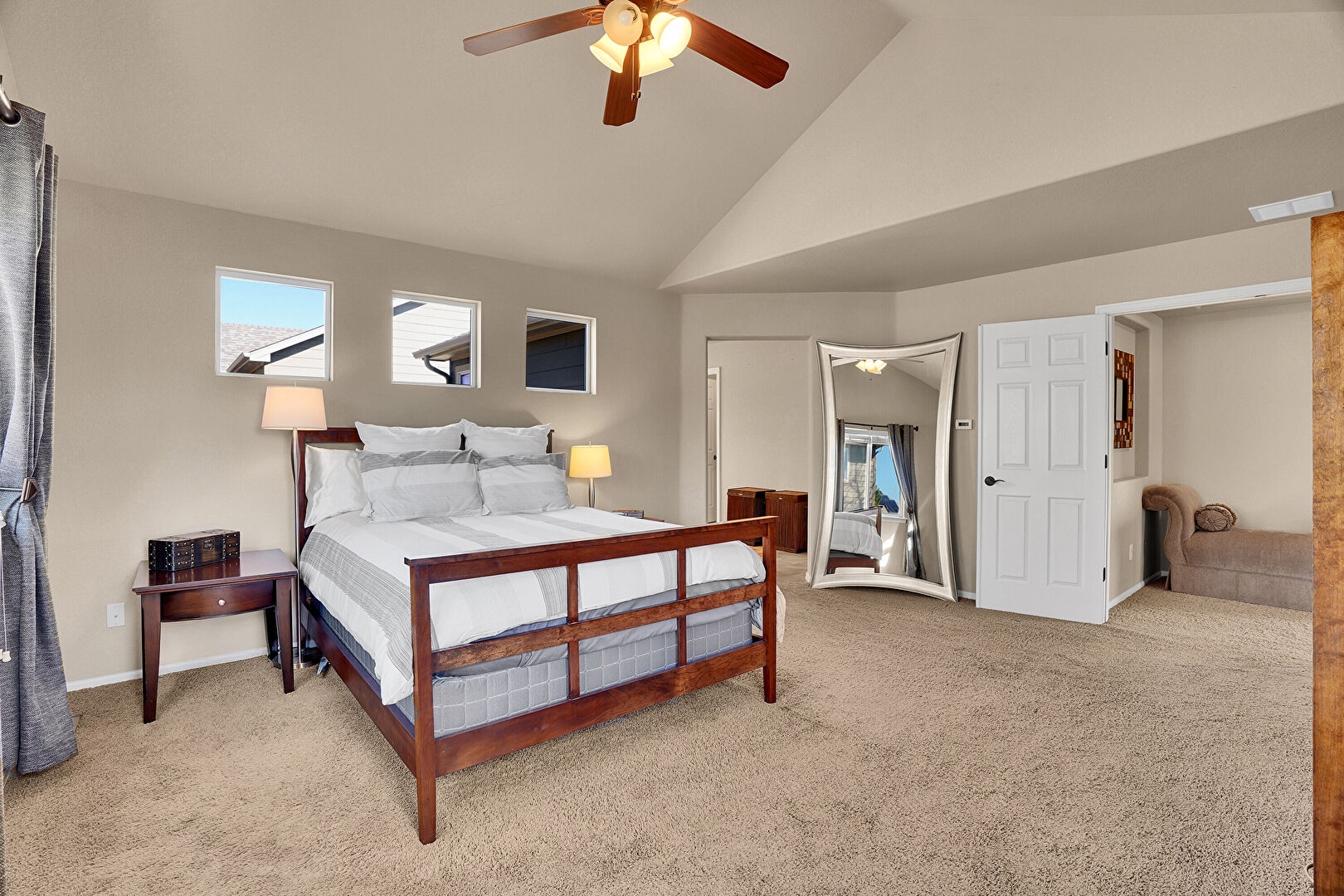 Baseboards Wall, Carpet, Cathedral Ceiling, Ceiling Fan, Drywall, High Ceiling, Natural Light, Textured Ceiling, Vaulted Ceiling, Vent, Ceiling Fan, Natural Light, Vaulted Ceiling