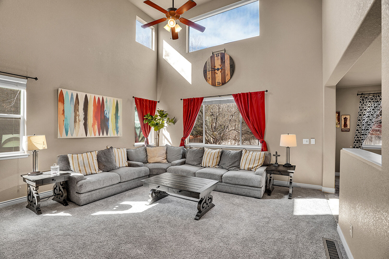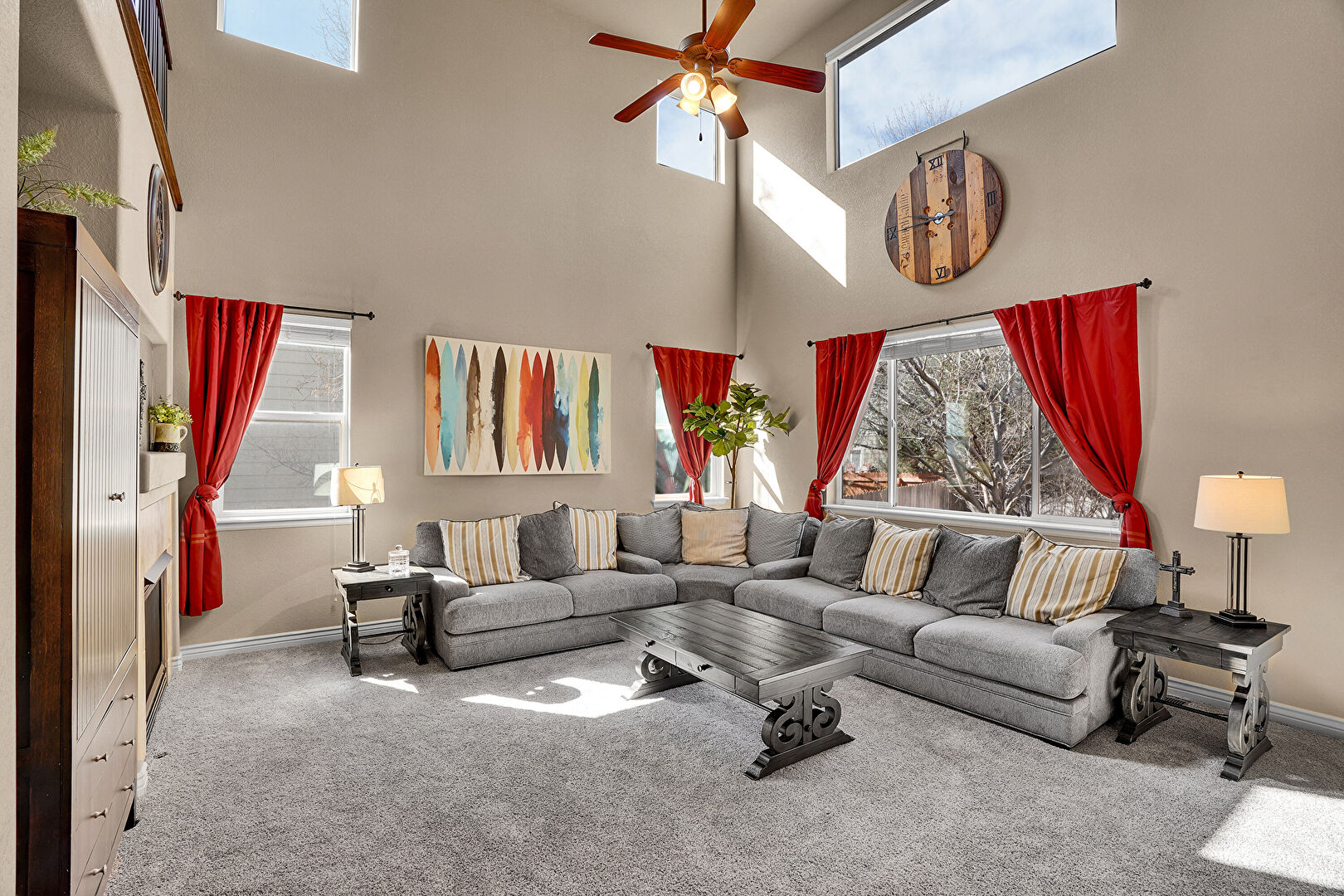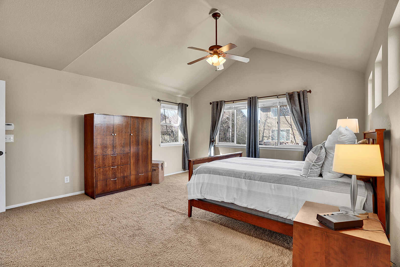 Baseboards Wall, Carpet, Cathedral Ceiling, Ceiling Fan, Drywall, High Ceiling, Natural Light, Textured Ceiling, Vaulted Ceiling, Vent, Ceiling Fan, Natural Light, Vaulted Ceiling