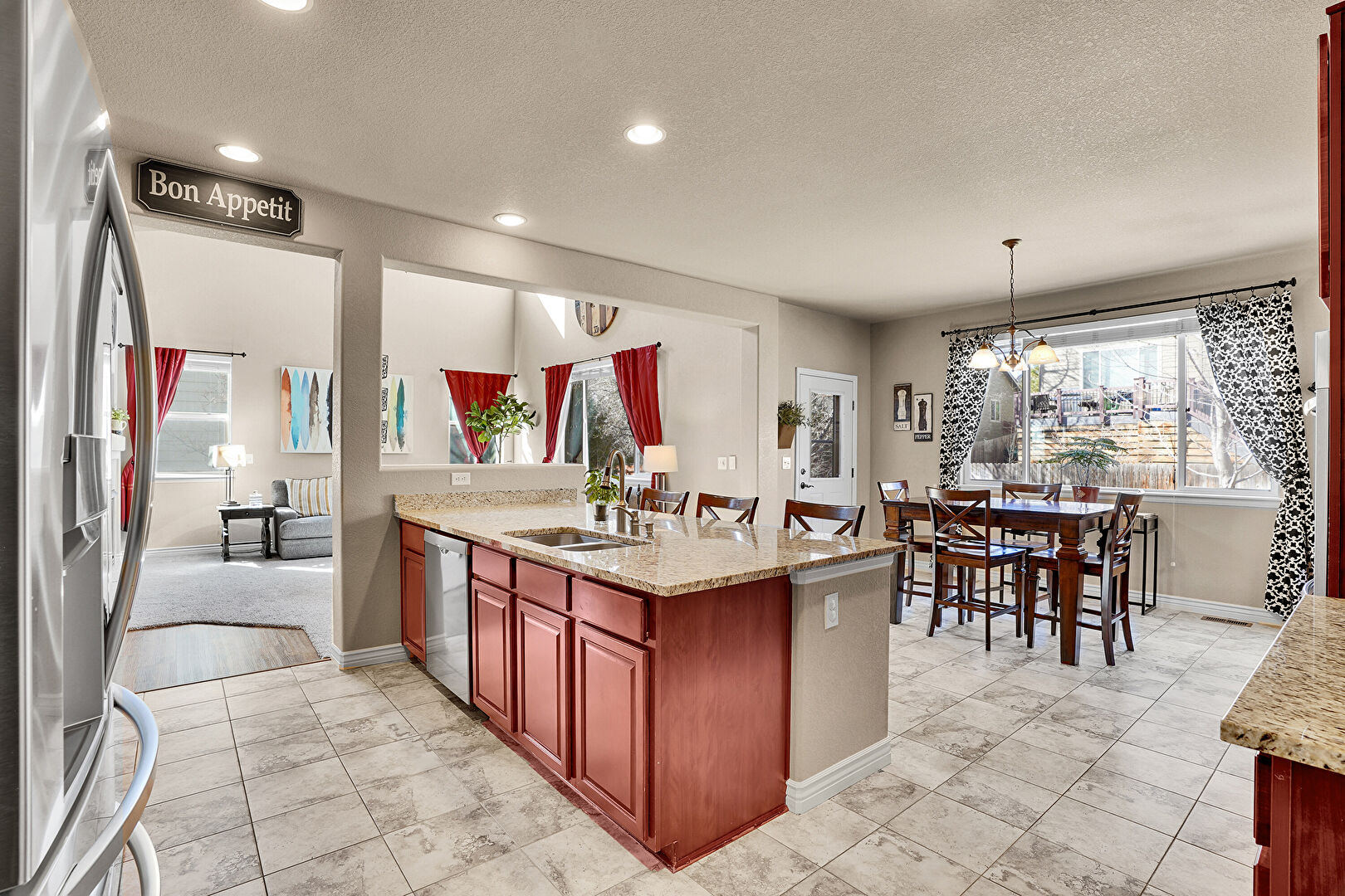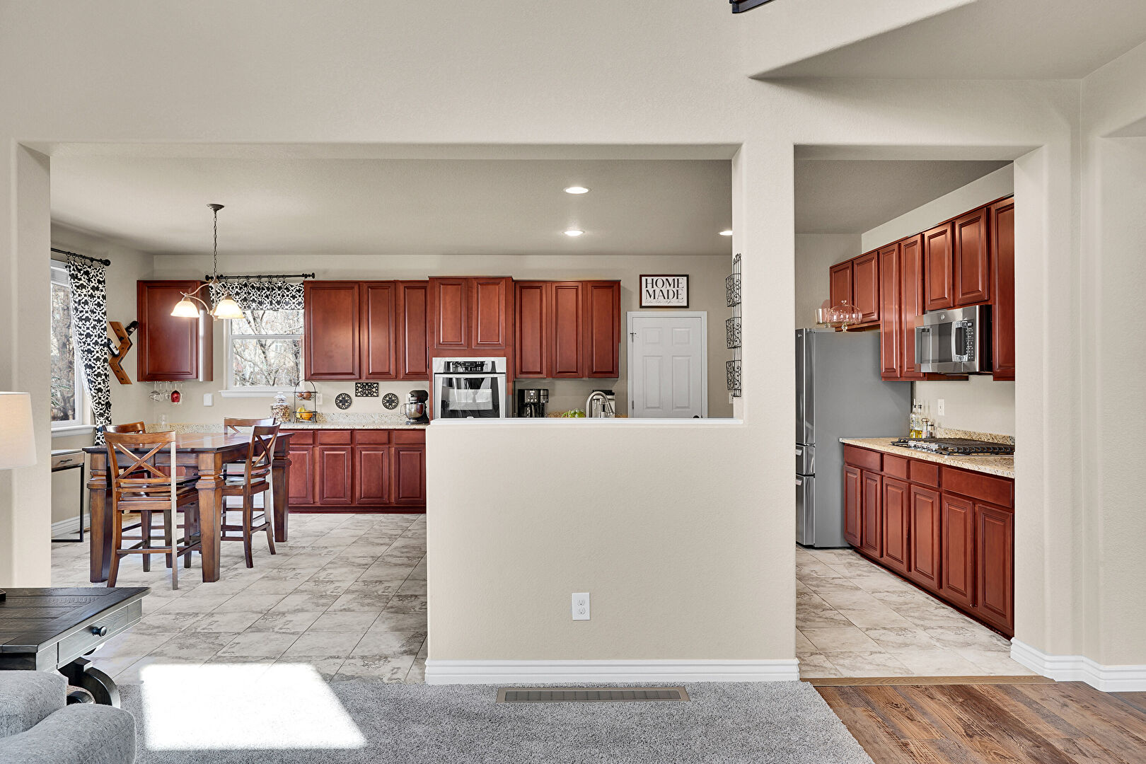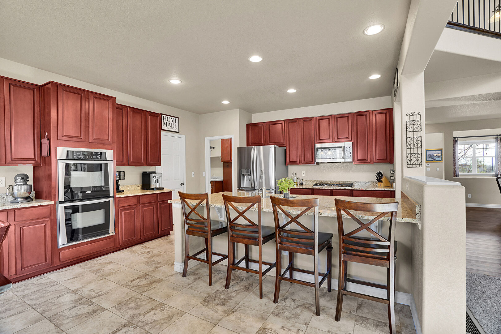 Baseboards Wall, Double Oven, Drywall, Kitchen Bar, Kitchen Peninsula, L Shaped Kitchen, Laundry, Marble Finish Floor, Medium Brown Cabinets, Natural Light, Notable Chandelier, Opens To Living Area, Pass Through Window, Pendant Lighting, Raised Cabinets, Recessed Lighting, Reddish Brown Cabinets, Stone Countertops, Textured Ceiling, Vent, Baseboards Wall, Drywall, Recessed Lighting, Vent