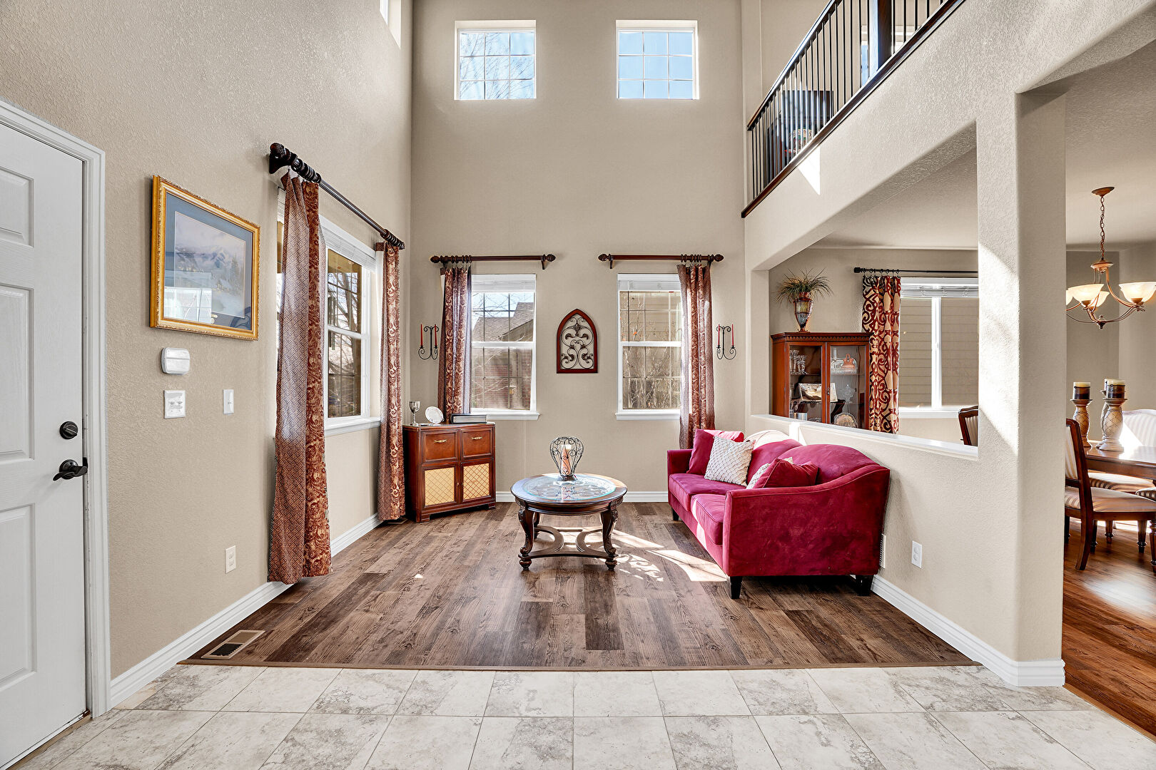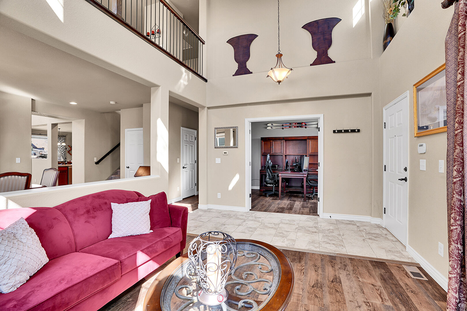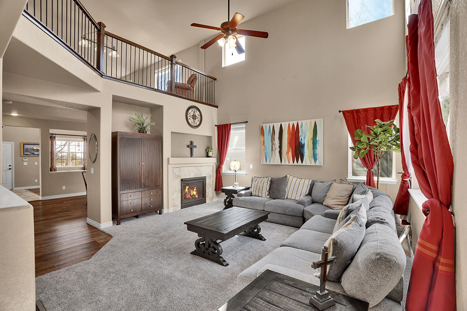 Baseboards Wall, Carpet, Ceiling Fan, Drywall, Fireplace, High Ceiling, Natural Light, Notable Chandelier, Recessed Lighting, Stairs, Sunken Living Room, Textured Ceiling, Textured Wall, Vent, Wood Finish Floor, Baseboards Wall, Ceiling Fan, Drywall, High Ceiling, Notable Chandelier, Office Area, Tile Floor, Vent, Wood Finish Floor