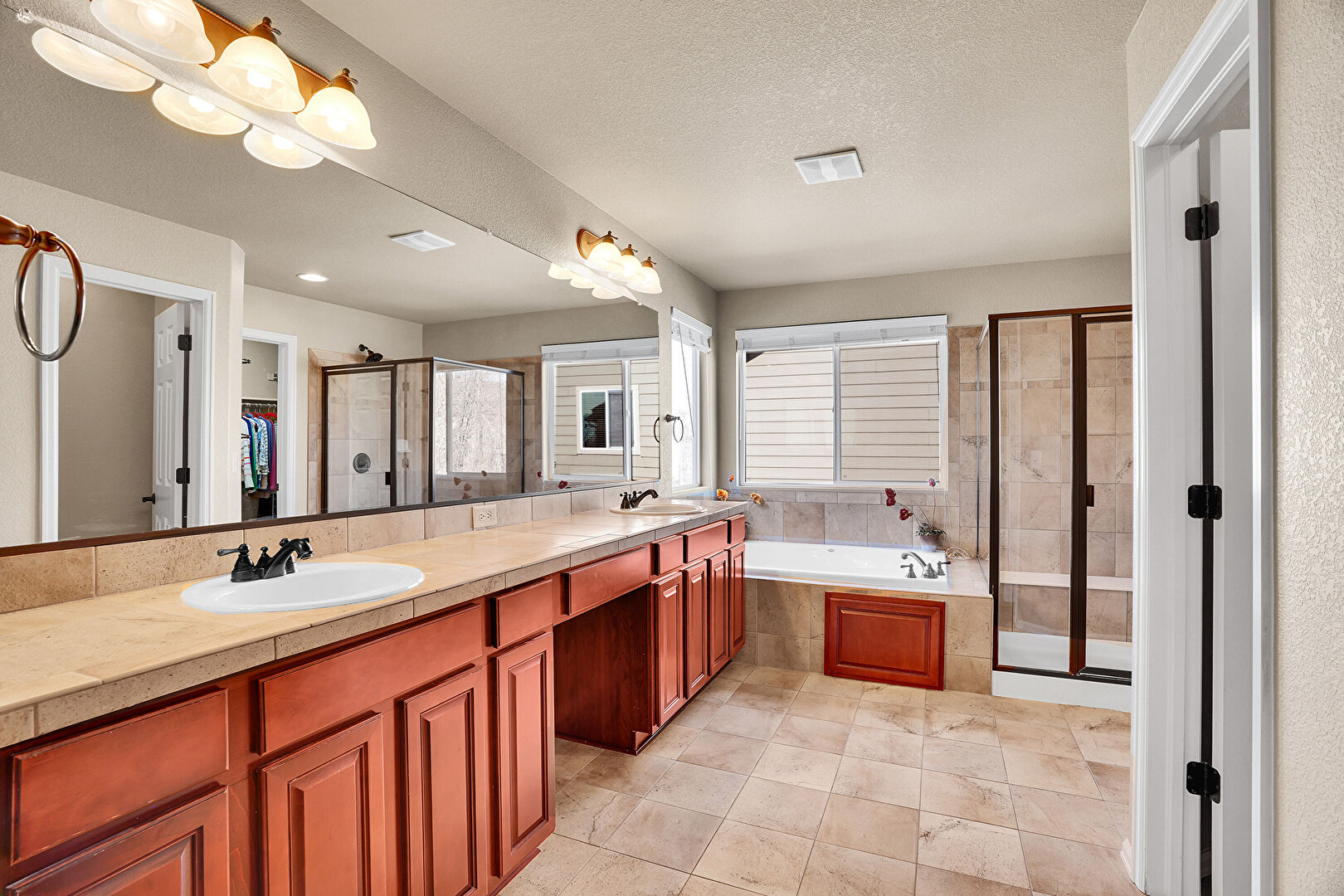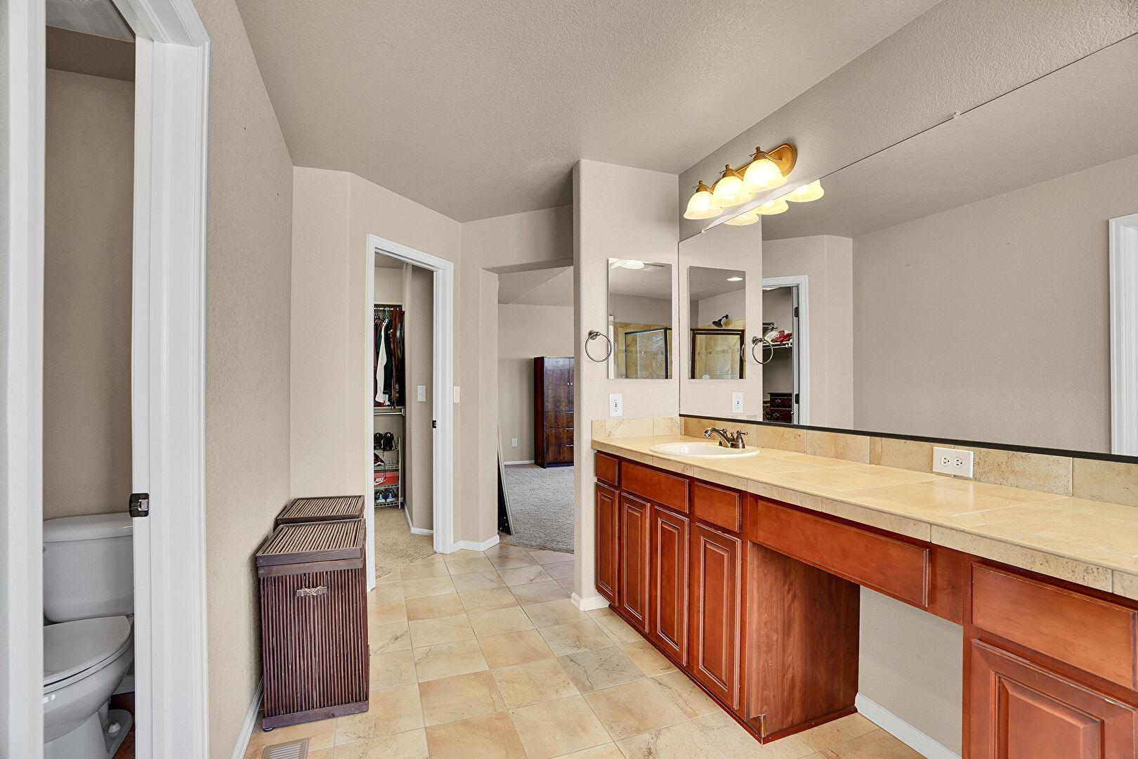 Baseboards Wall, Double Vanity, Drywall, Full Bathroom, Natural Light, Textured Ceiling, Tile Floor, Vanity, Walk In Closet, Water Closet, Full Bathroom, Recessed Lighting, Vent
