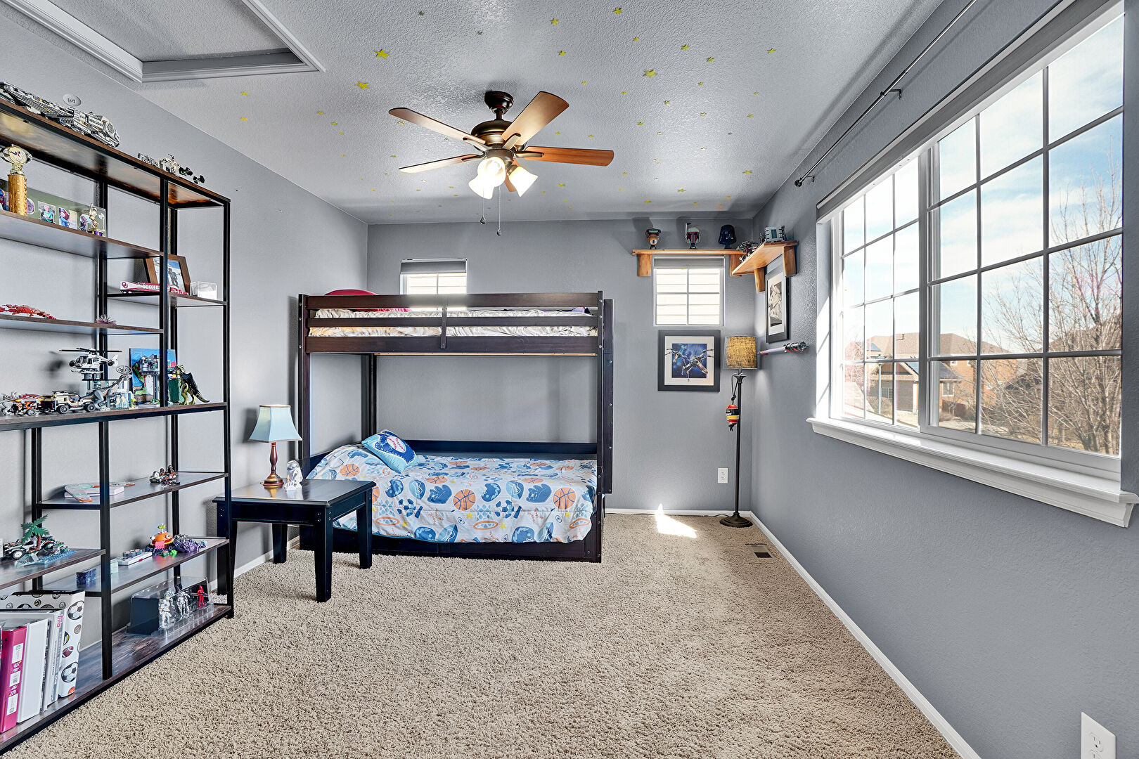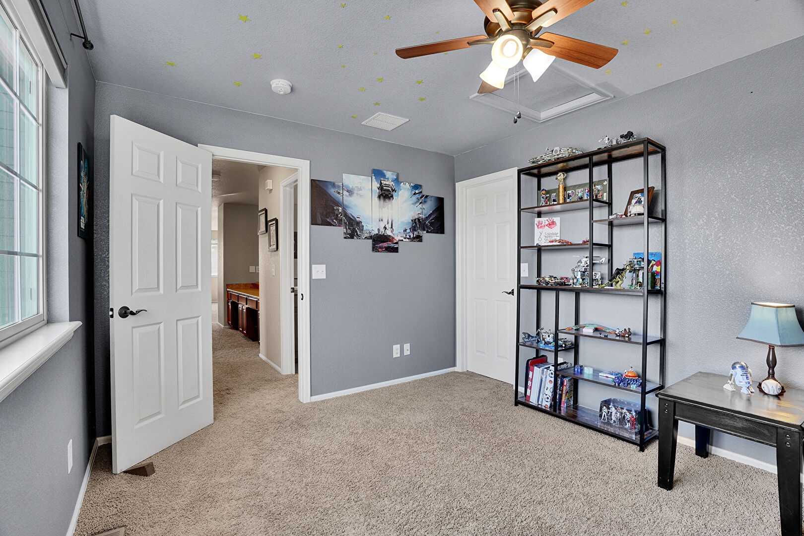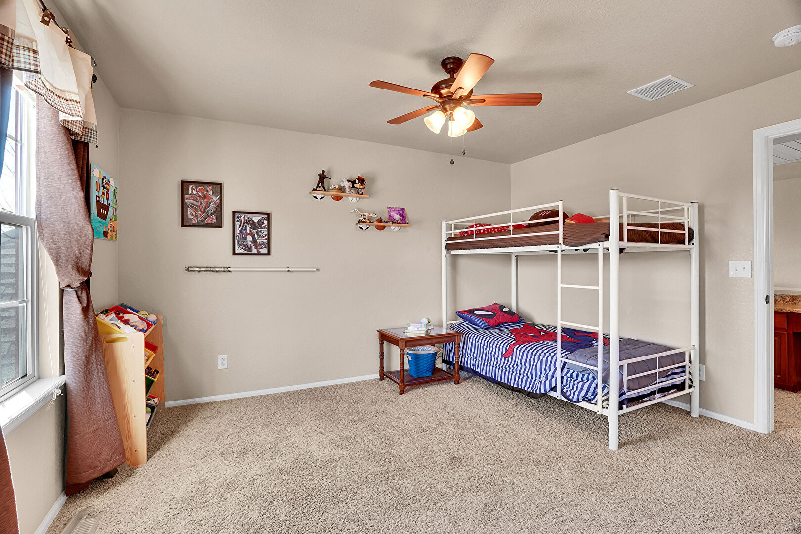 Baseboards Wall, Carpet, Ceiling Fan, Drywall, Natural Light, Smoke Carbon Monoxide Detector, Textured Ceiling, Vent, Ceiling Fan, Scuttle