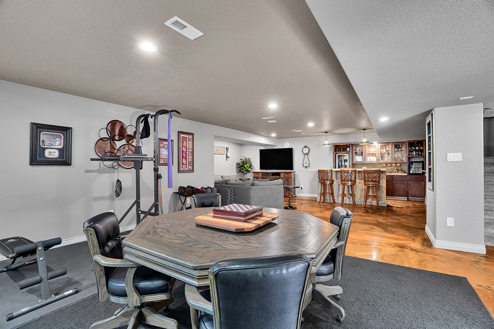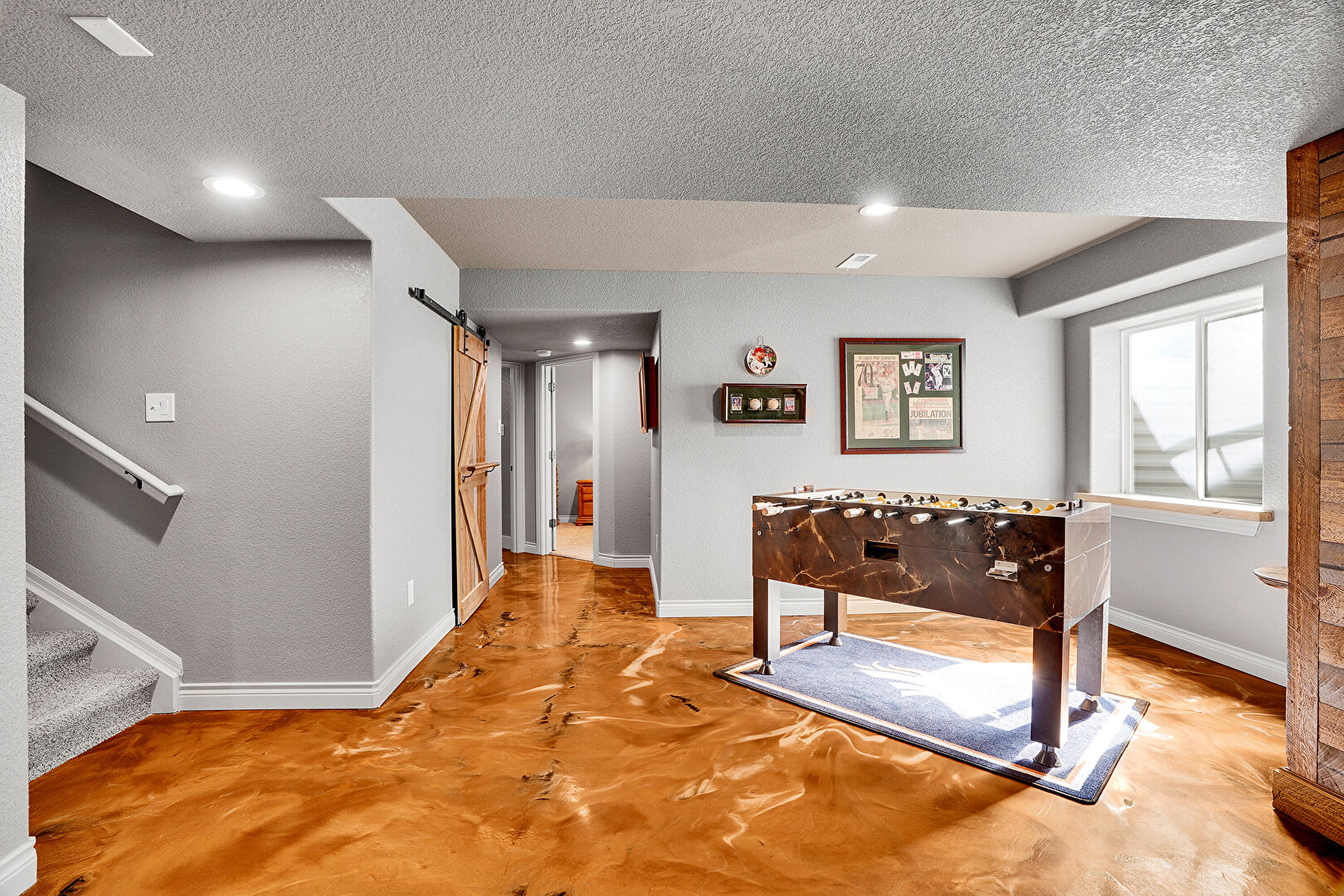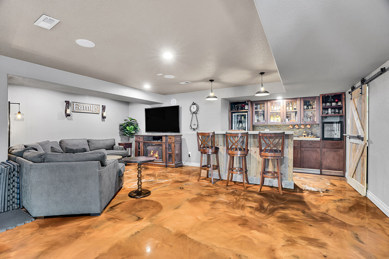 Barn Door, Baseboards Wall, Basement, Concrete Floor, Drywall, Fireplace, Indoor Bar, Natural Light, Recessed Lighting, Stairs, Textured Ceiling, Vent, Wood Finish Floor, Barn Door, Baseboards Wall, Drywall, Fireplace, Recessed Lighting, Textured Ceiling, Textured Wall