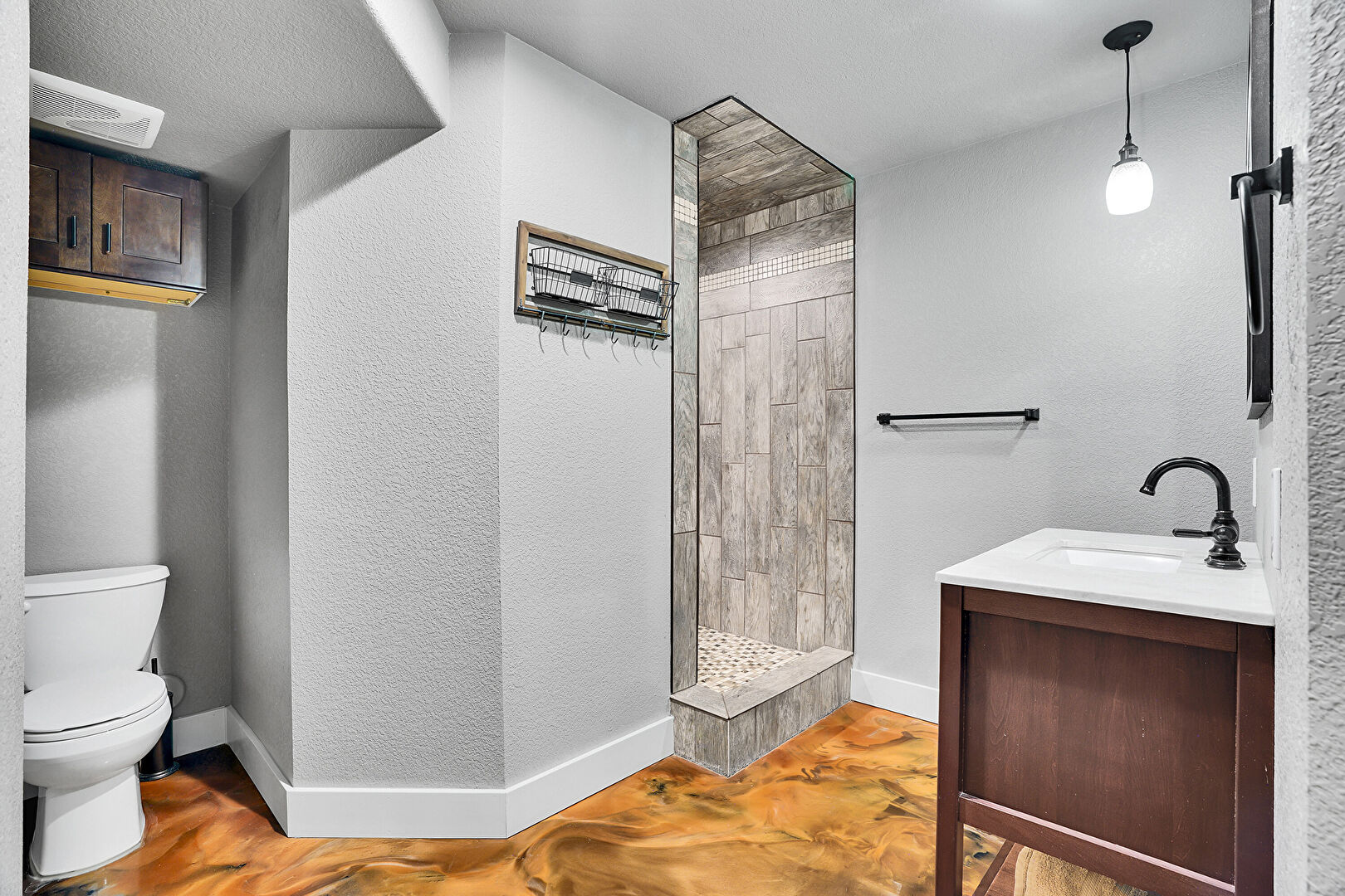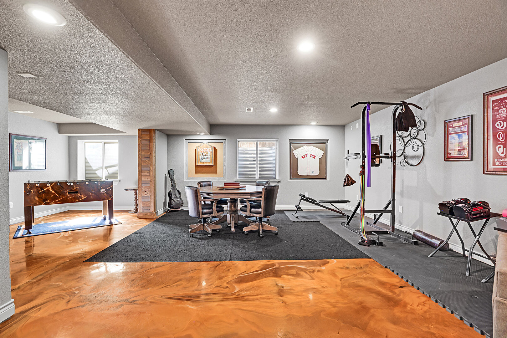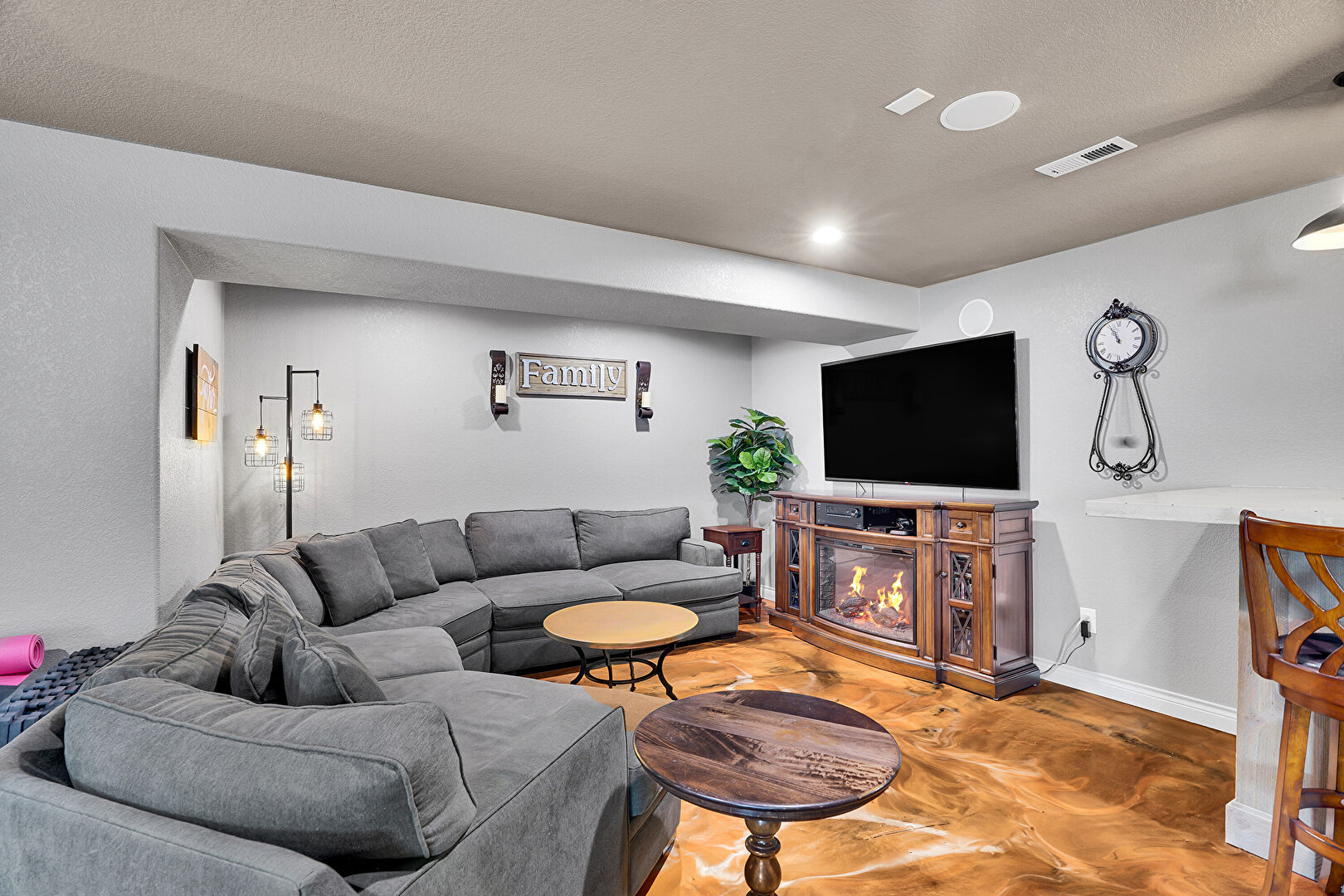 Barn Door, Baseboards Wall, Basement, Concrete Floor, Drywall, Fireplace, Indoor Bar, Natural Light, Recessed Lighting, Stairs, Textured Ceiling, Vent, Wood Finish Floor, Barn Door, Baseboards Wall, Drywall, Fireplace, Recessed Lighting, Textured Ceiling, Textured Wall