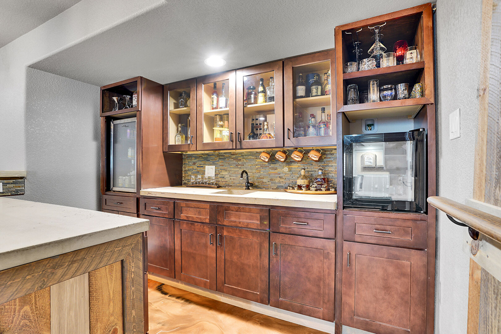 Barn Door, Baseboards Wall, Concrete Floor, Dark Brown Cabinets, Drywall, Glass Insert Cabinets, Indoor Bar, Open Shelves, Pendant Lighting, Shaker Cabinets, Textured Wall, Vent, Wood Finish Floor, Medium Brown Cabinets, Wine Cooler