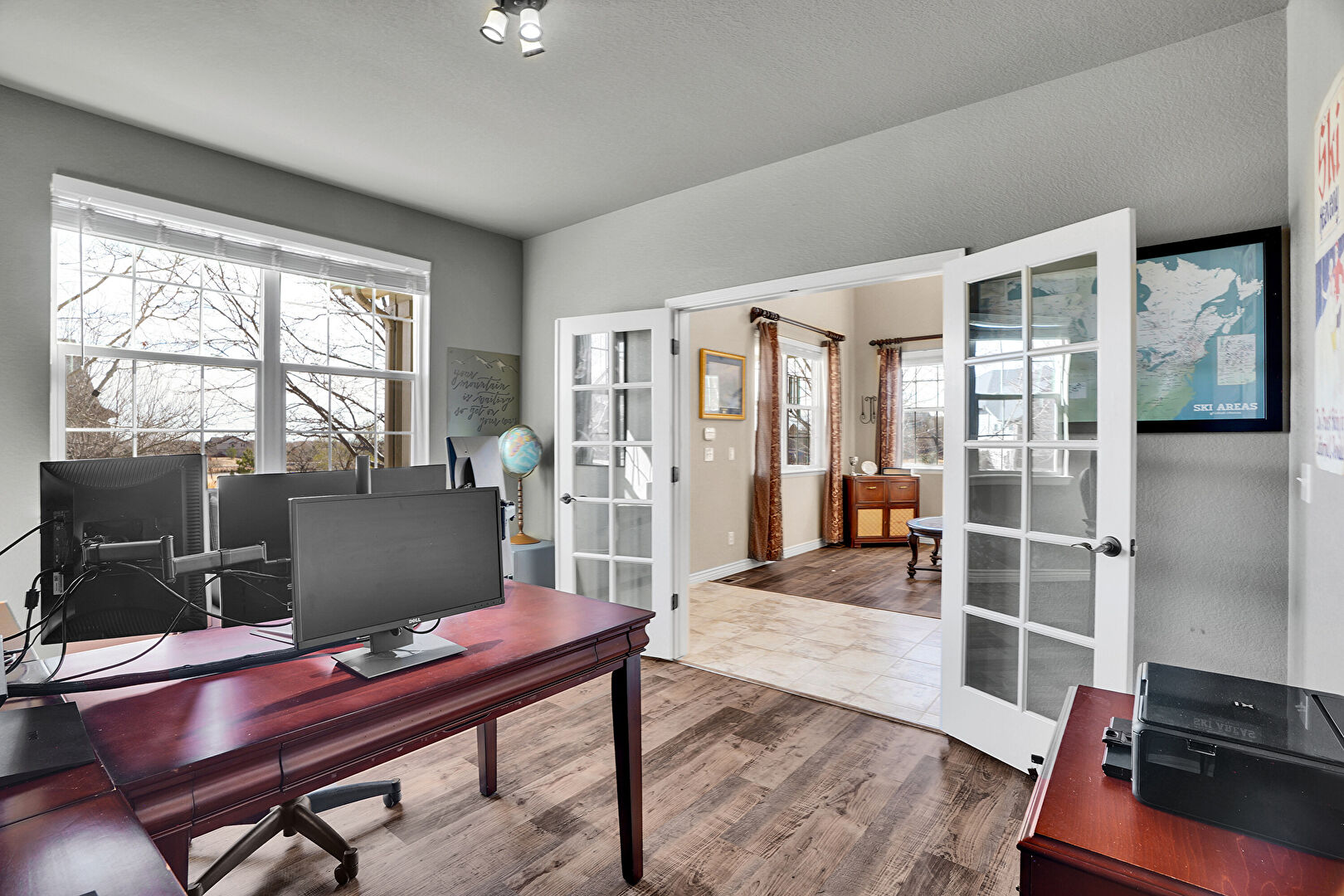 Baseboards Wall, Drywall, French Doors, Natural Light, Office Area, Textured Ceiling, Vent, Wood Finish Floor, Baseboards Wall, Textured Wall