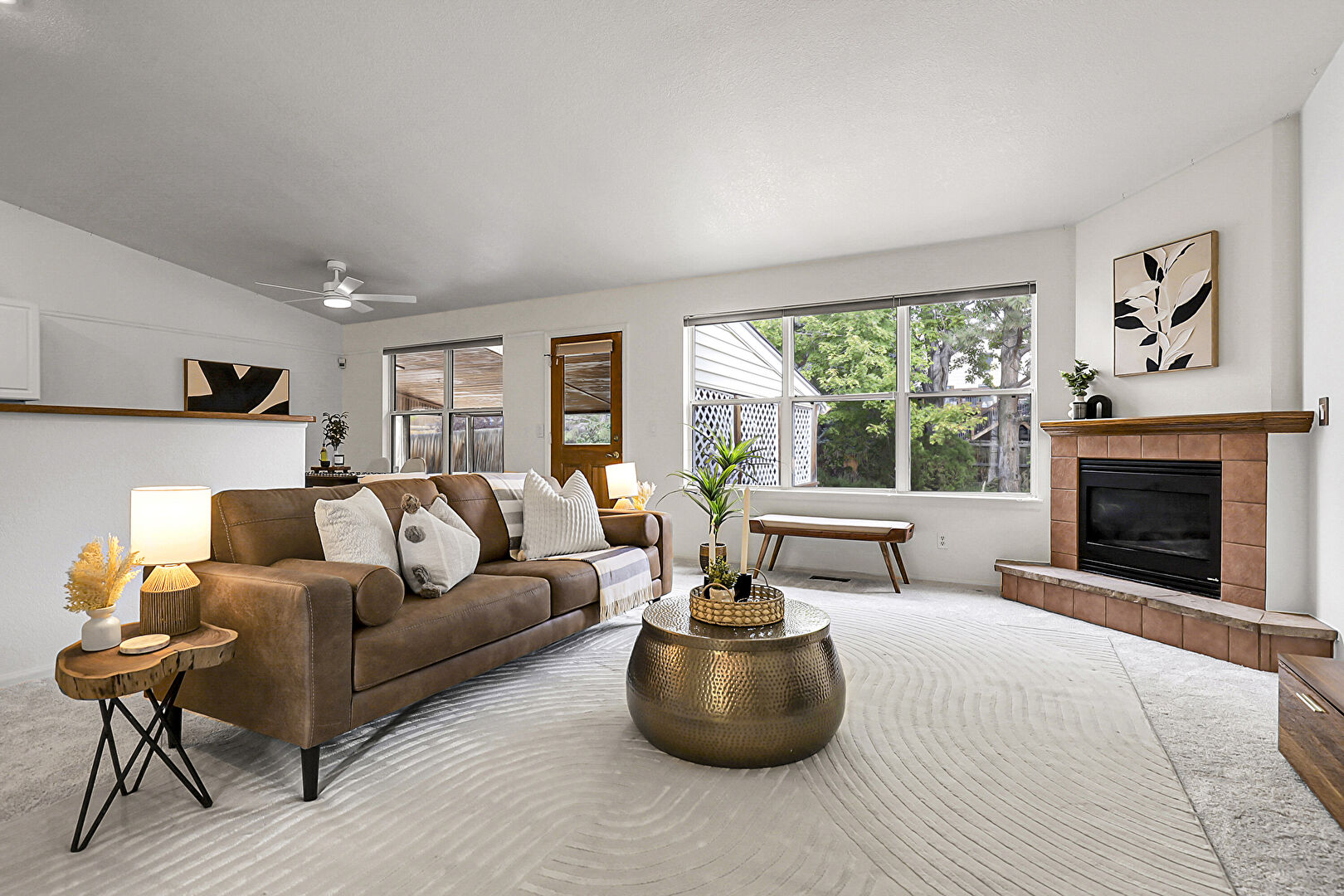 Baseboards Wall, Ceiling Fan, Drywall, Fireplace, Natural Light, Vaulted Ceiling, Wood Finish Floor, Carpet, Vent