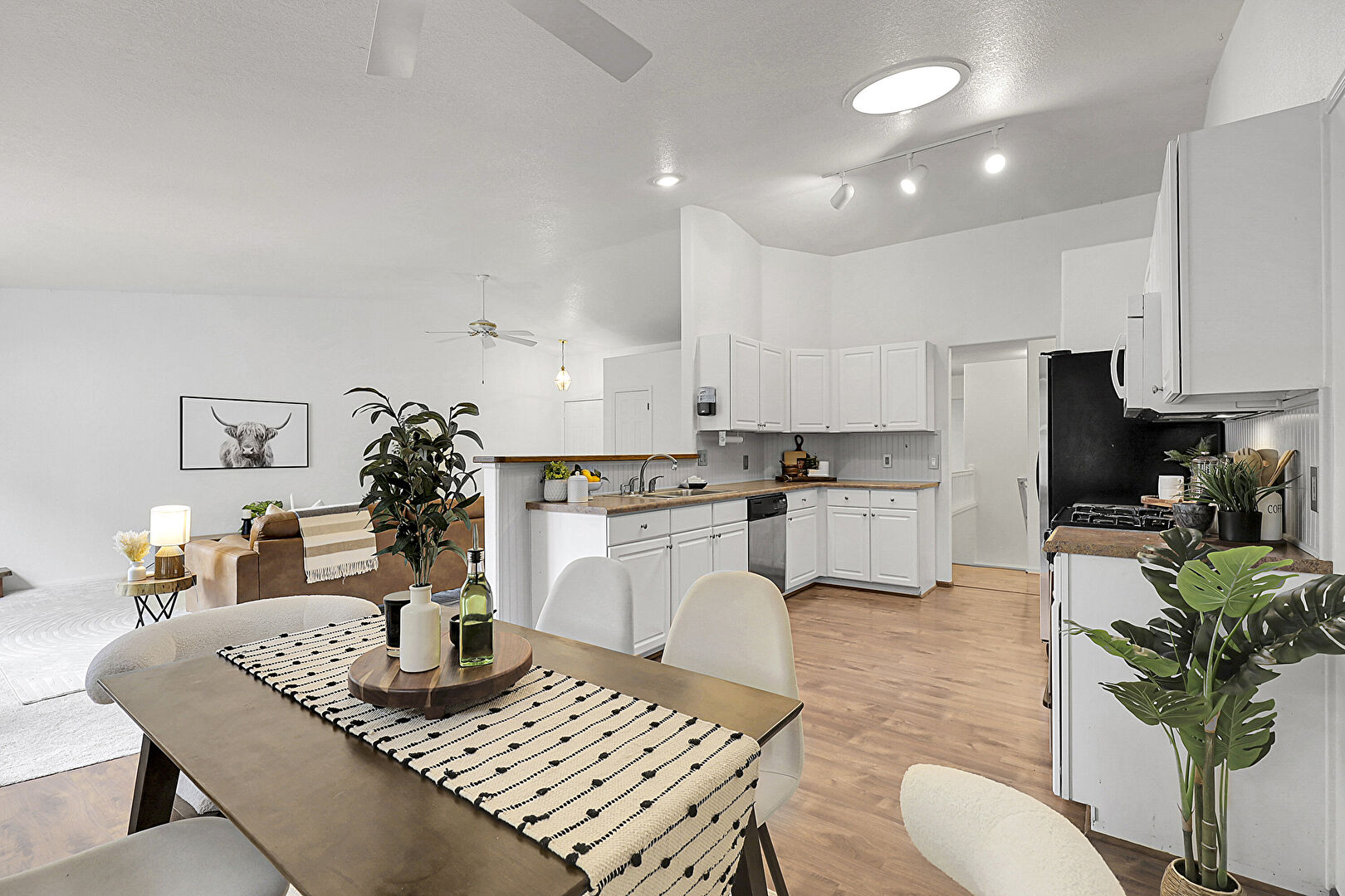 Drywall, Kitchen Peninsula, Raised Cabinets, Textured Ceiling, U Shaped Kitchen, Wood Finish Floor, Ceiling Fan