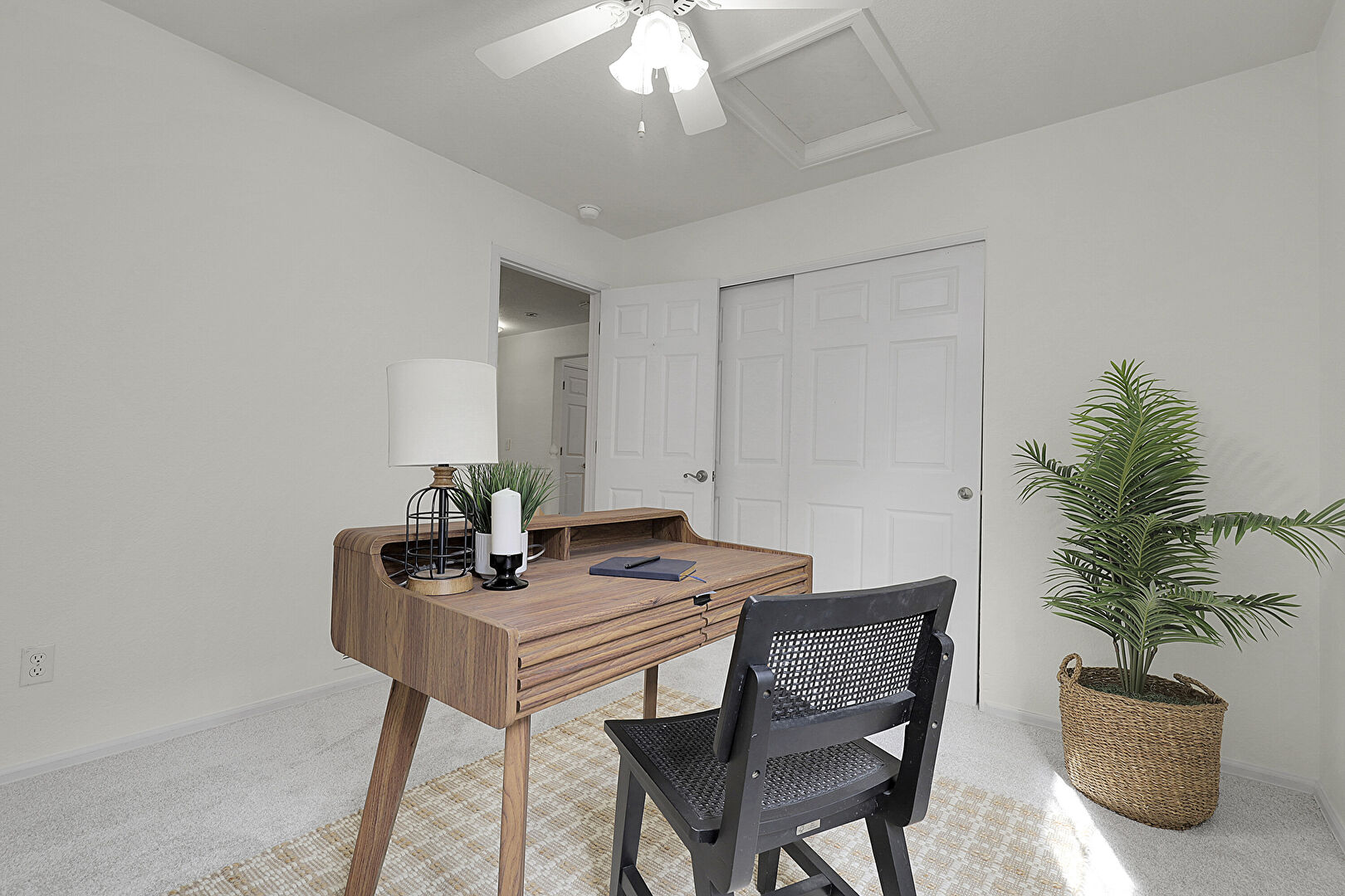 Baseboards Wall, Carpet, Ceiling Fan, Drywall, Office Area, Scuttle