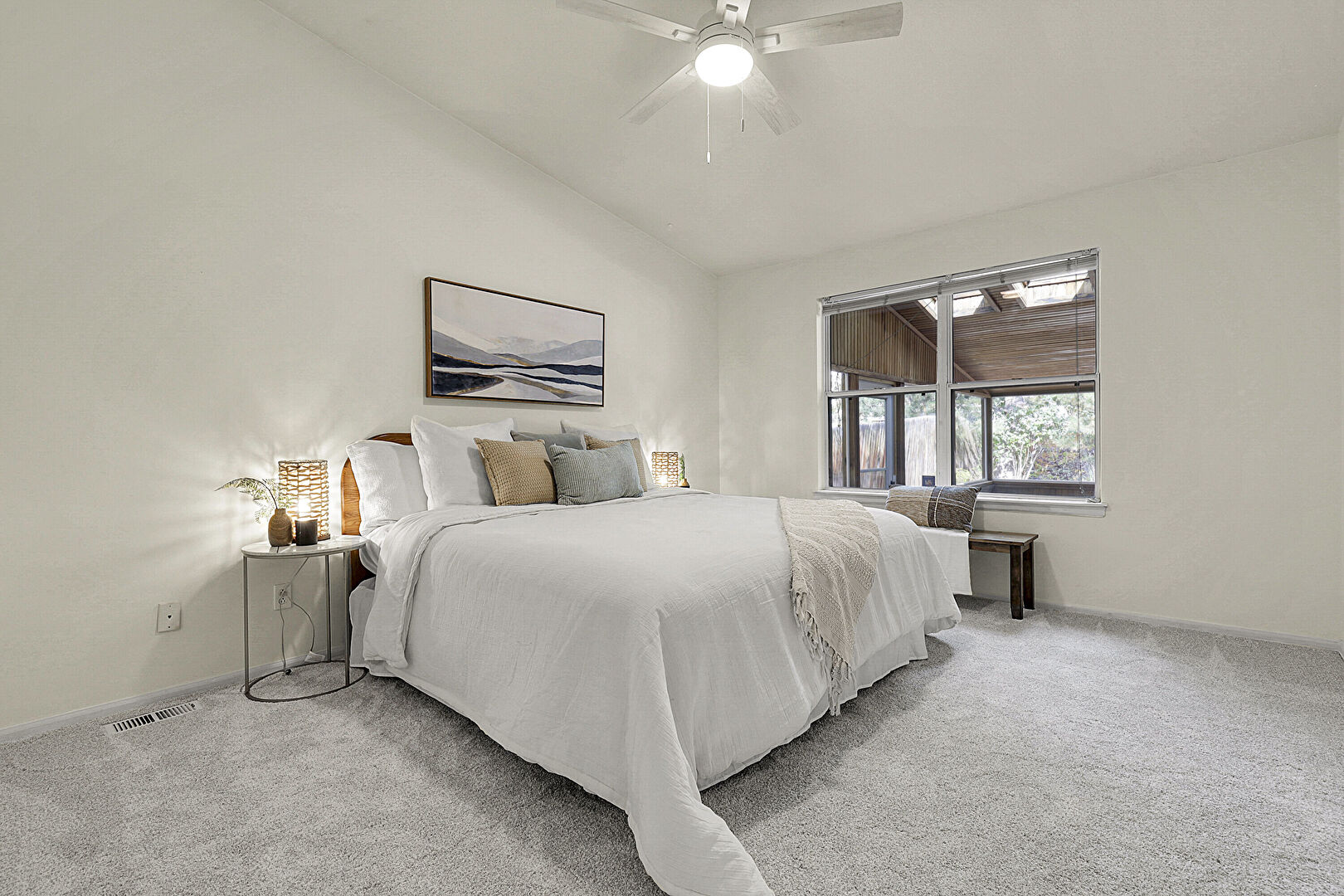 Carpet, Ceiling Fan, Drywall, Natural Light, Vaulted Ceiling, Vent, Baseboards Wall