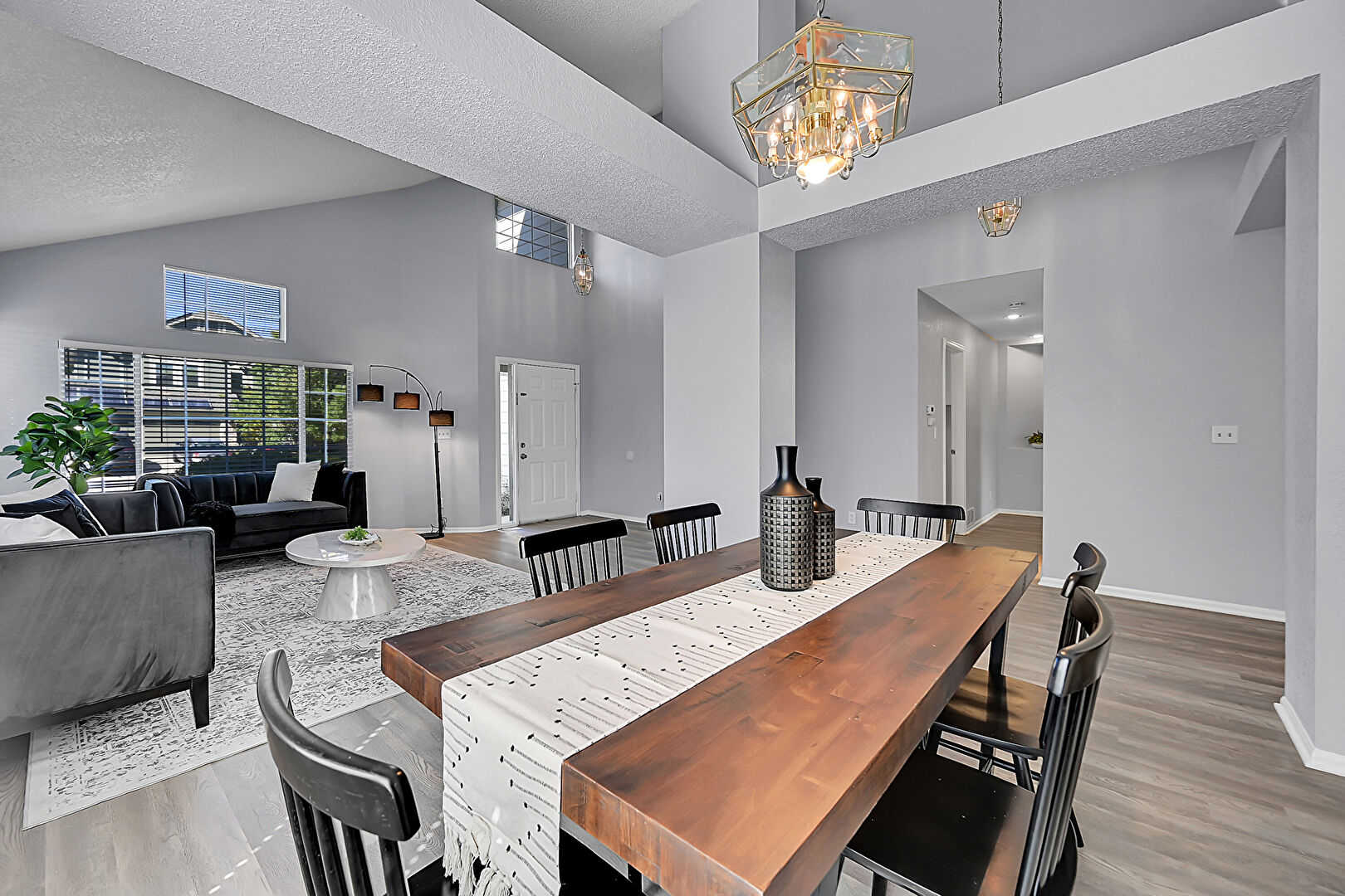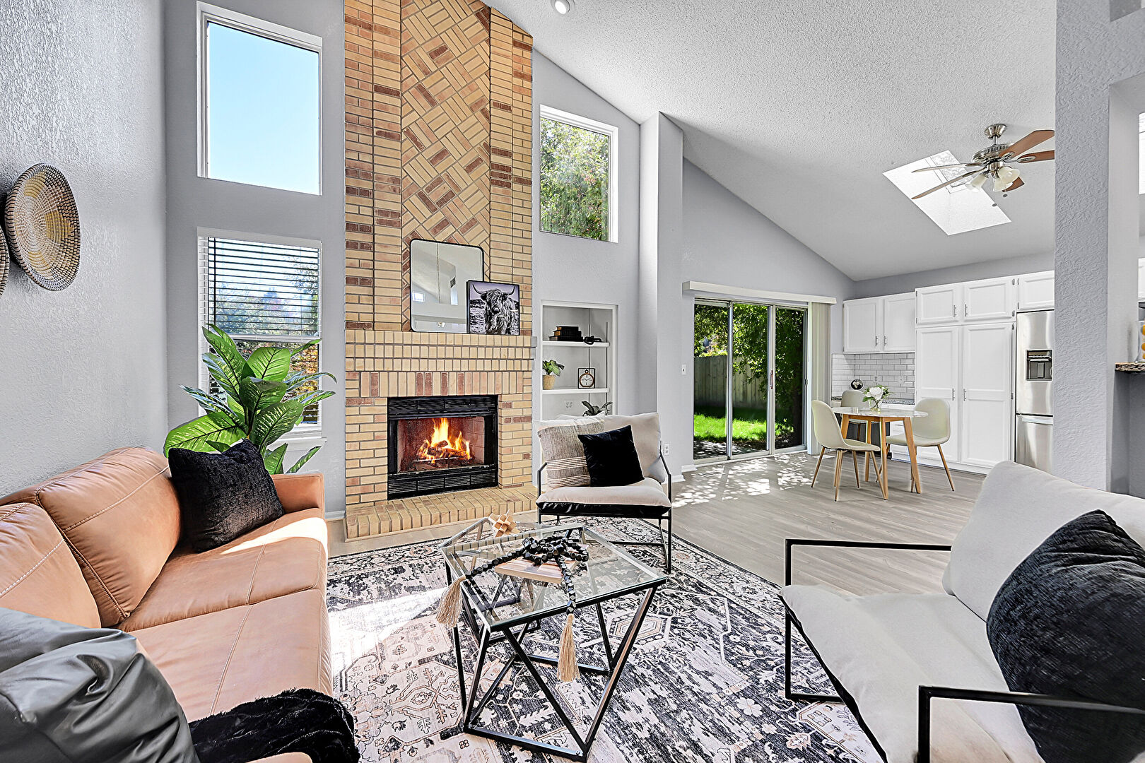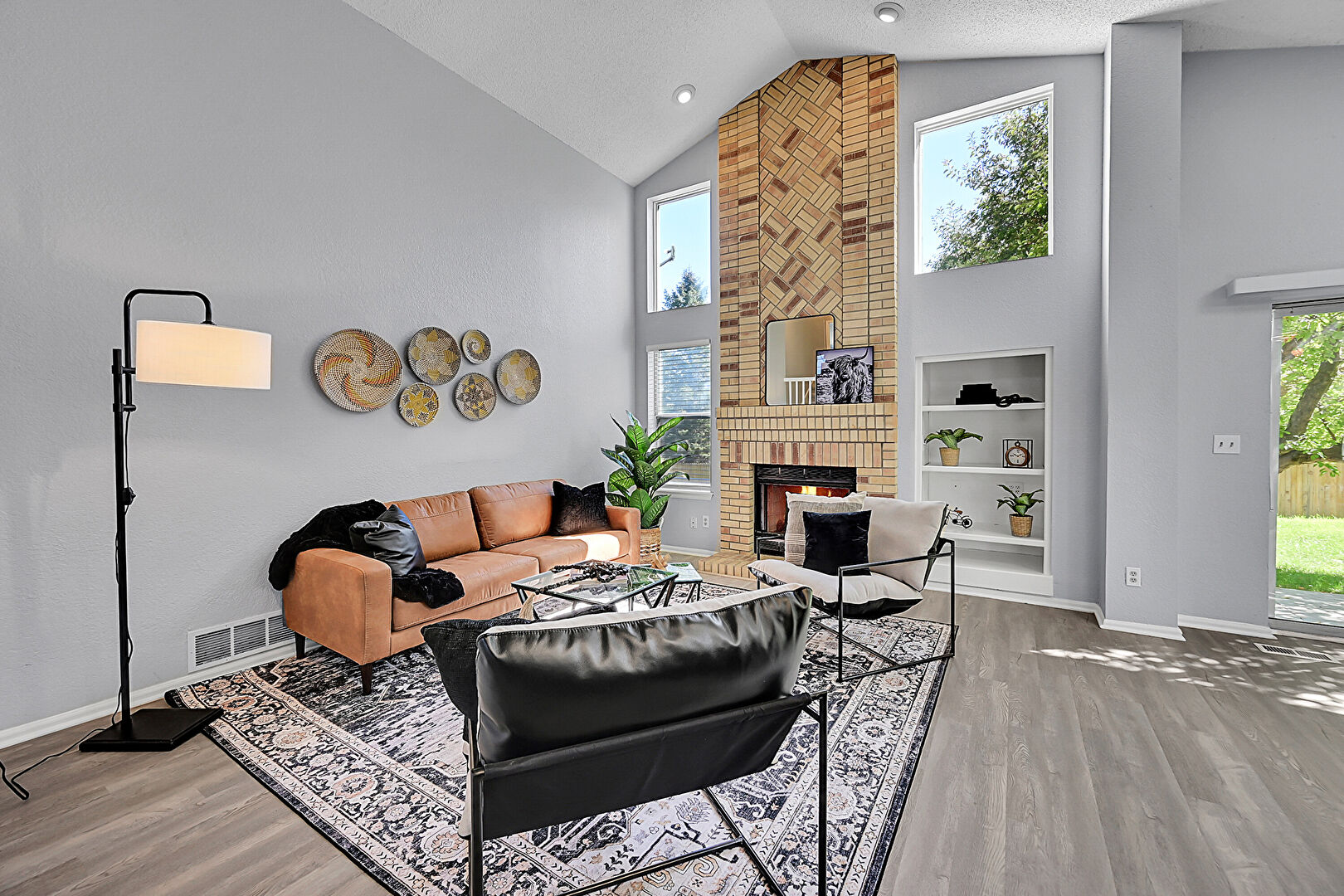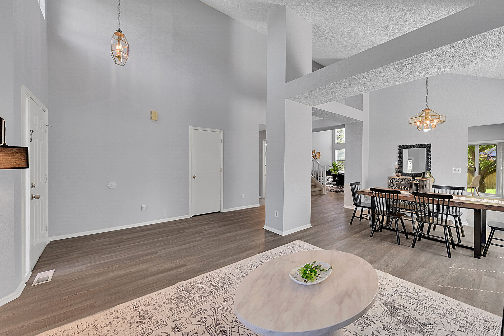 Baseboards Wall, Drywall, Fireplace, High Ceiling, Natural Light, Notable Chandelier, Textured Ceiling, Vaulted Ceiling, Wood Finish Floor, Baseboards Wall, Notable Chandelier