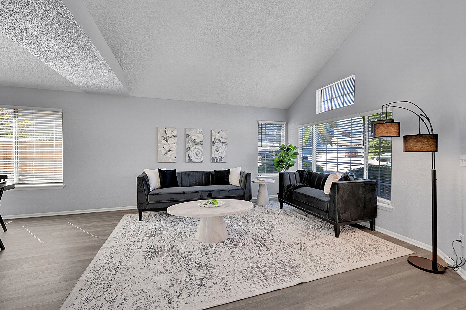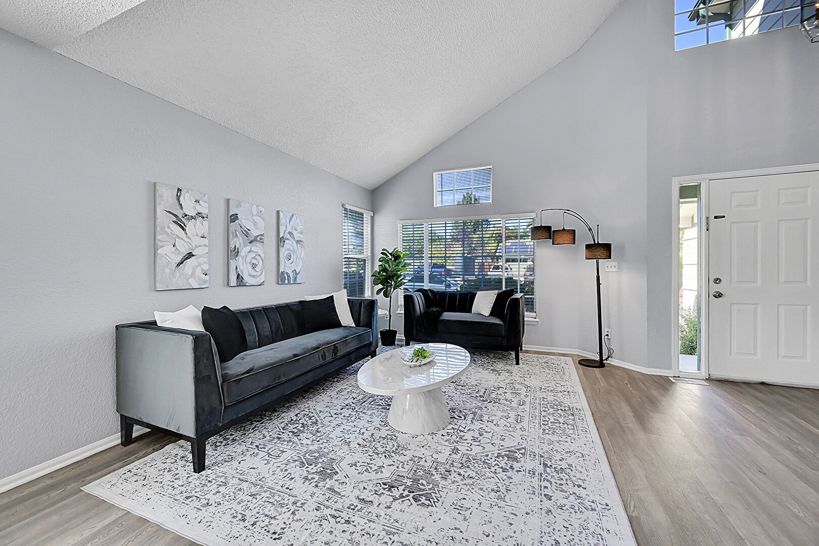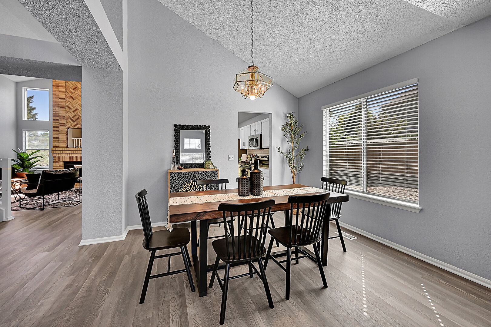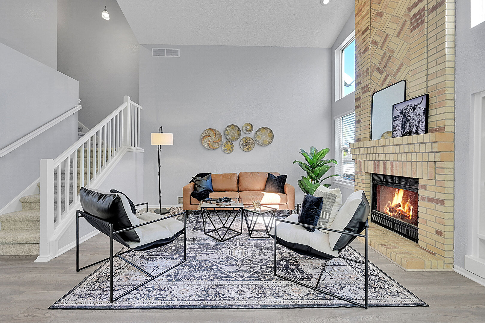 Baseboards Wall, Drywall, Fireplace, High Ceiling, Natural Light, Notable Chandelier, Textured Ceiling, Vaulted Ceiling, Wood Finish Floor, Baseboards Wall, Notable Chandelier