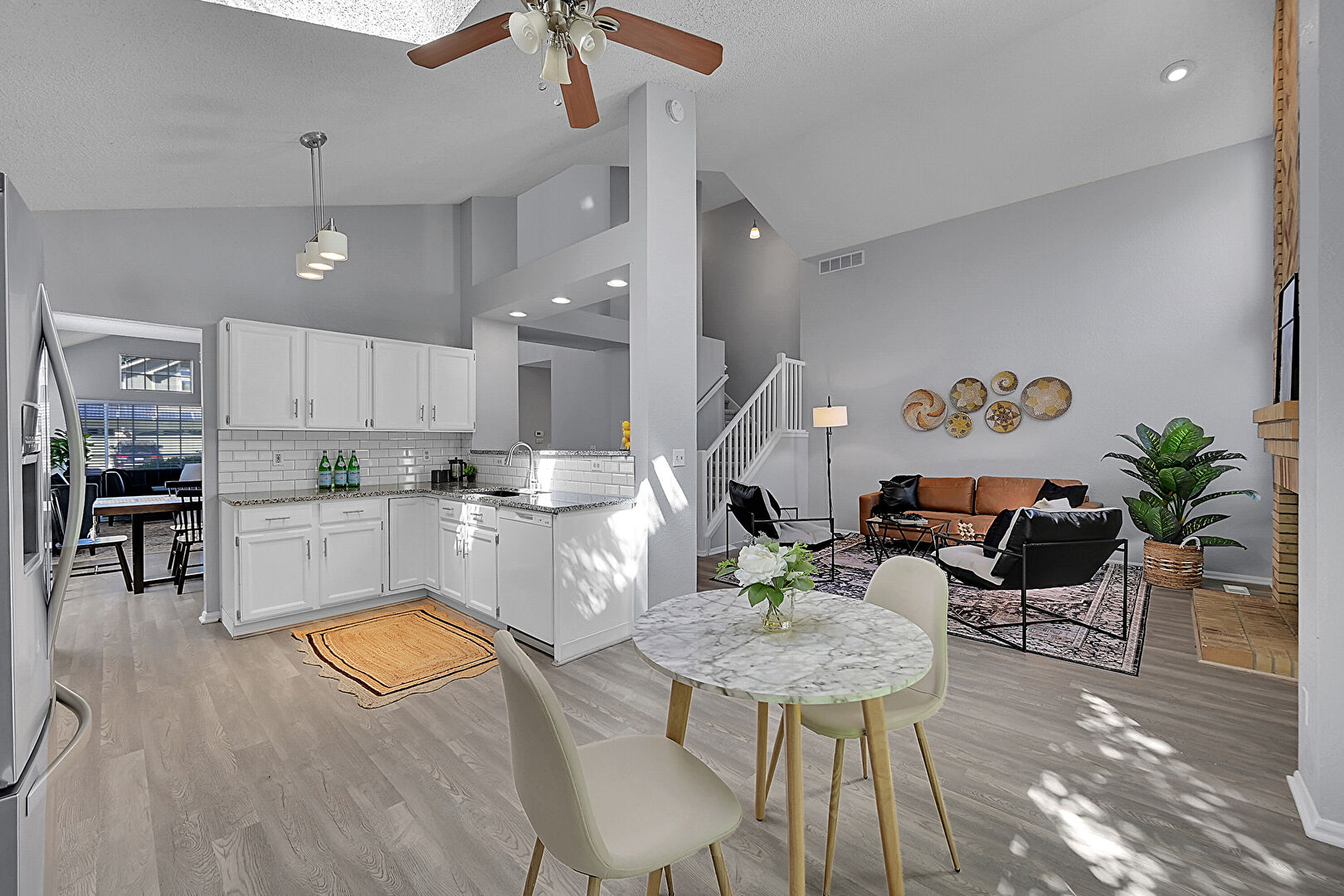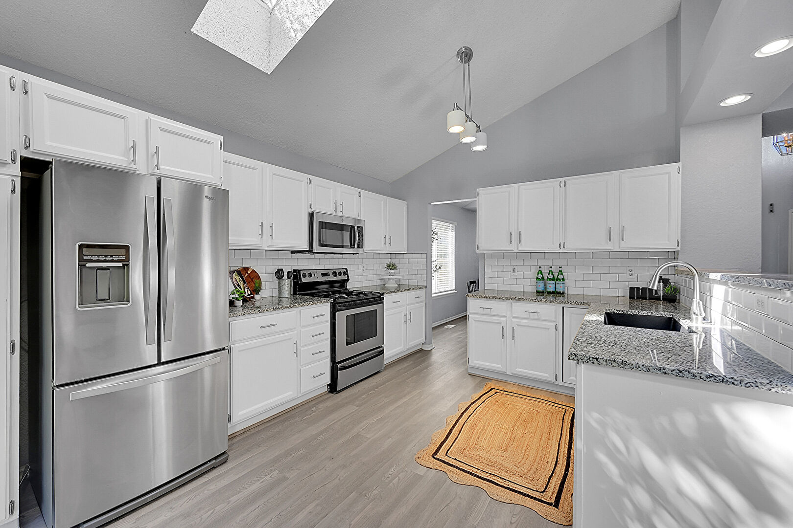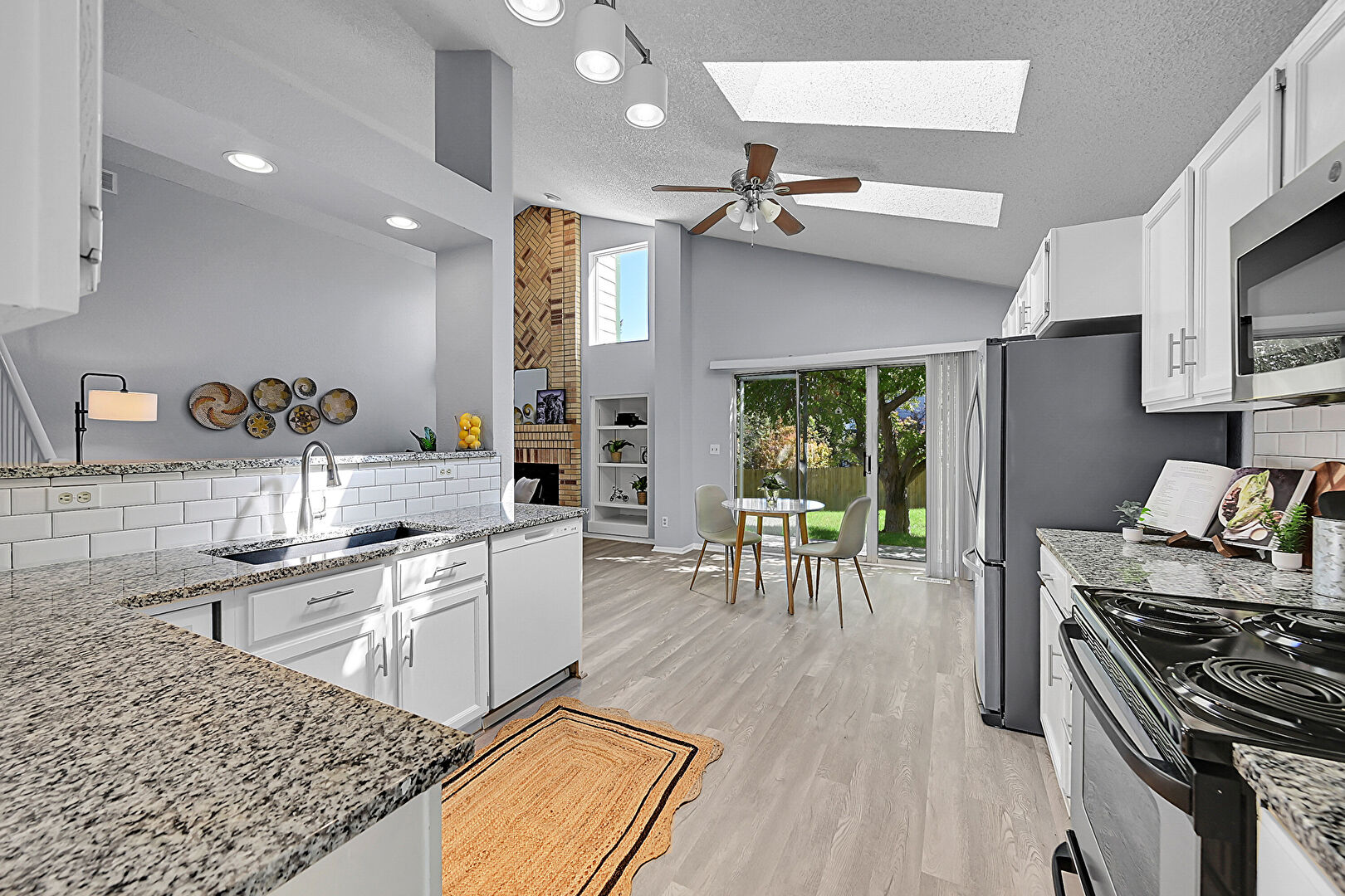 Baseboards Wall, Ceiling Fan, Drywall, Fireplace, High Ceiling, Kitchen Peninsula, Natural Light, Opens To Living Area, Pass Through Window, Pendant Lighting, Recessed Lighting, Shaker Cabinets, Skylight, Stone Countertops, Textured Ceiling, Textured Wall, U Shaped Kitchen, Vaulted Ceiling, Vent, Visible Hinge Cabinets, Wood Finish Floor, Recessed Lighting, Shaker Cabinets, Stone Countertops, Textured Ceiling, Wood Finish Floor