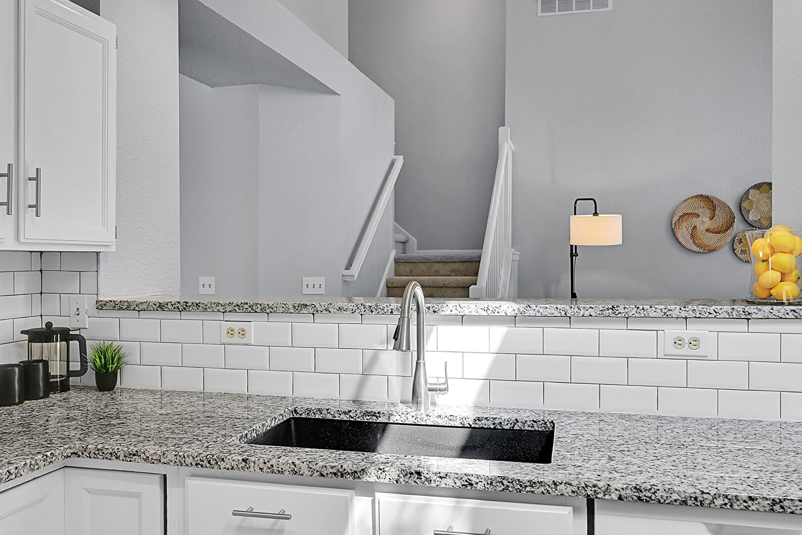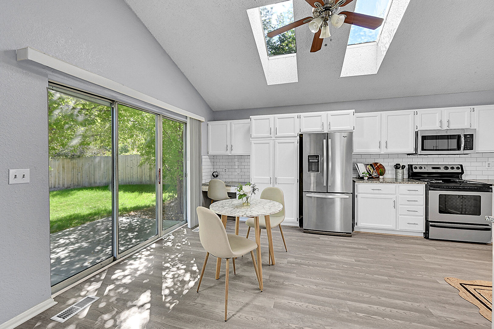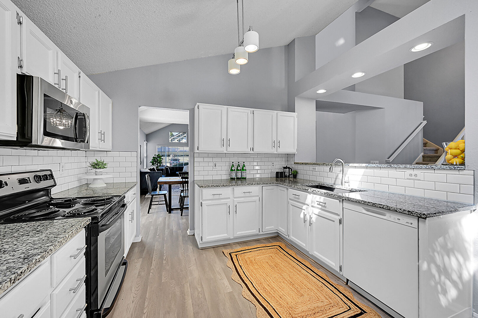 Baseboards Wall, Ceiling Fan, Drywall, Fireplace, High Ceiling, Kitchen Peninsula, Natural Light, Opens To Living Area, Pass Through Window, Pendant Lighting, Recessed Lighting, Shaker Cabinets, Skylight, Stone Countertops, Textured Ceiling, Textured Wall, U Shaped Kitchen, Vaulted Ceiling, Vent, Visible Hinge Cabinets, Wood Finish Floor, Recessed Lighting, Shaker Cabinets, Stone Countertops, Textured Ceiling, Wood Finish Floor