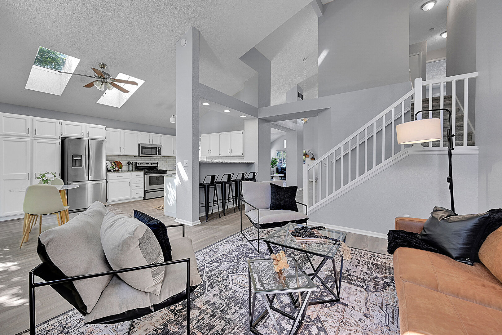 Baseboards Wall, Built In Shelves, Ceiling Fan, Drywall, Fireplace, High Ceiling, Natural Light, Notable Chandelier, Recessed Lighting, Skylight, Stairs, Textured Ceiling, Vaulted Ceiling, Vent, Wood Finish Floor, Baseboards Wall, Drywall, High Ceiling, Textured Ceiling, Vaulted Ceiling, Vent, Wood Finish Floor