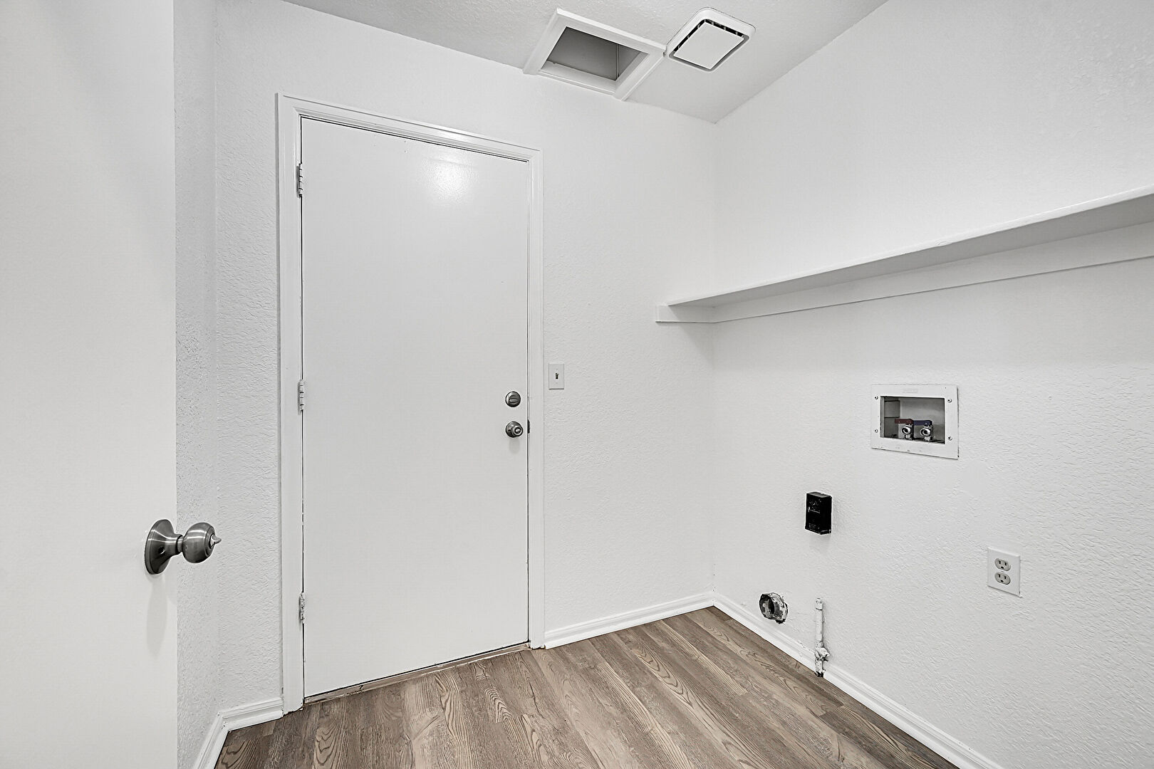 Baseboards Wall, Laundry, Scuttle, Textured Wall, Vent, Washer Hookup, Wood Finish Floor, Gas Dryer Hookup