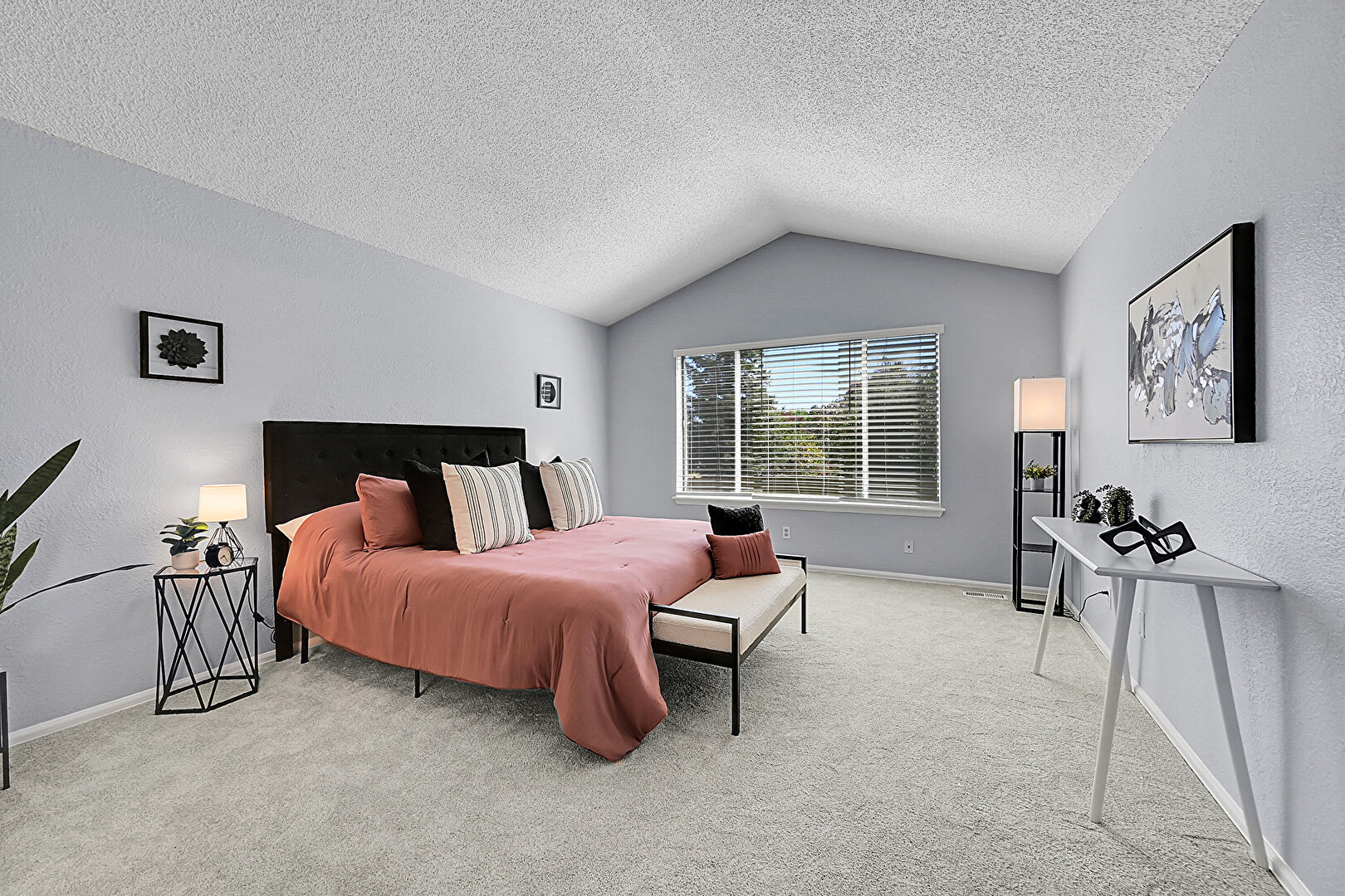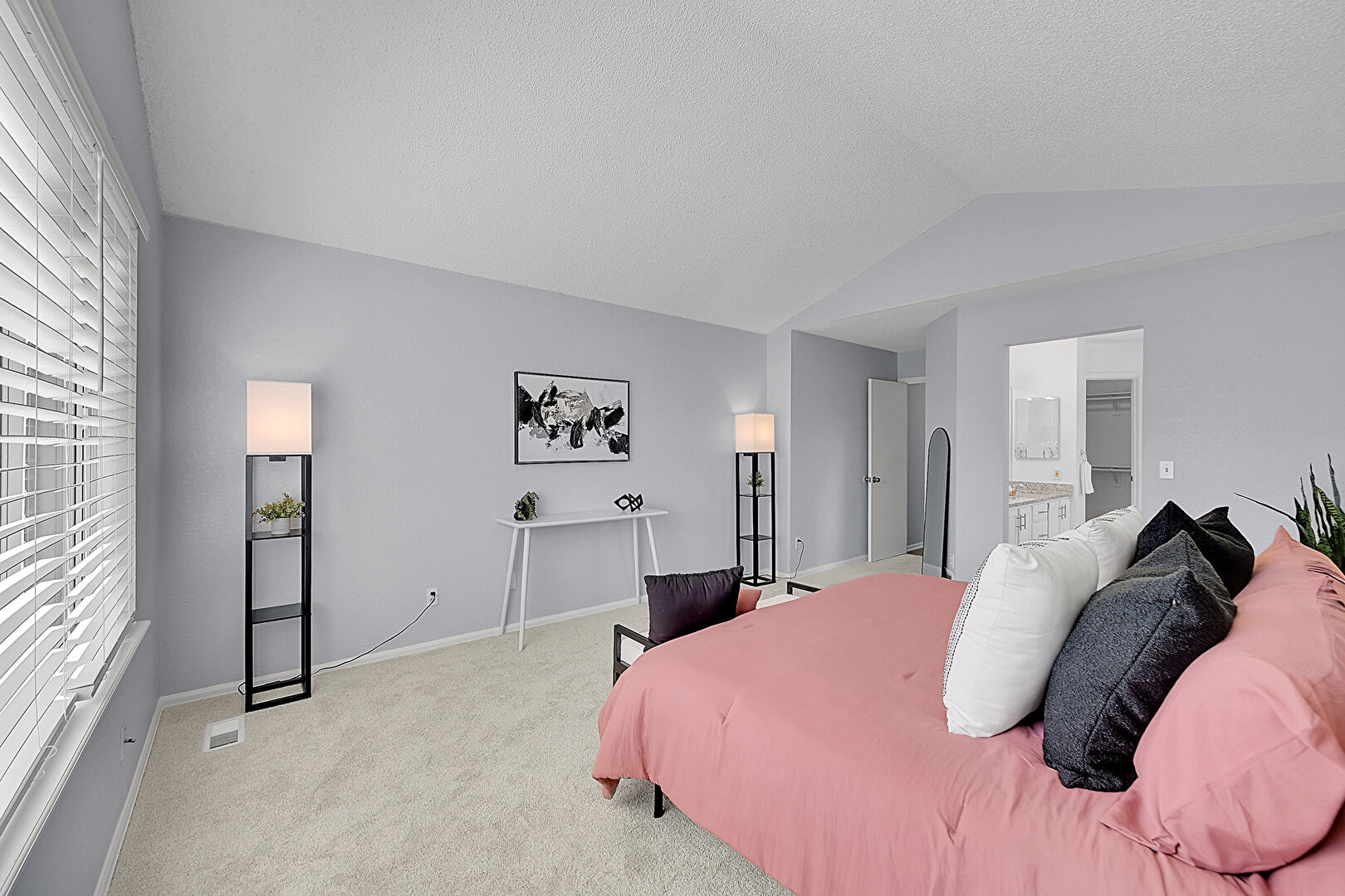 Arched Walkways, Baseboards Wall, Carpet, Cathedral Ceiling, Drywall, Ensuite Bathroom, Natural Light, Textured Ceiling, Textured Wall, Vaulted Ceiling, Vent, Walk In Closet, Baseboards Wall, Natural Light, Textured Ceiling