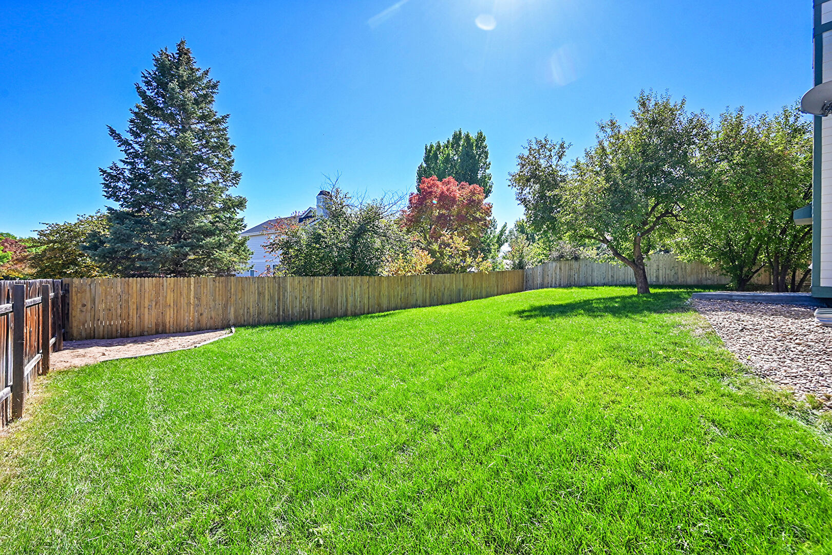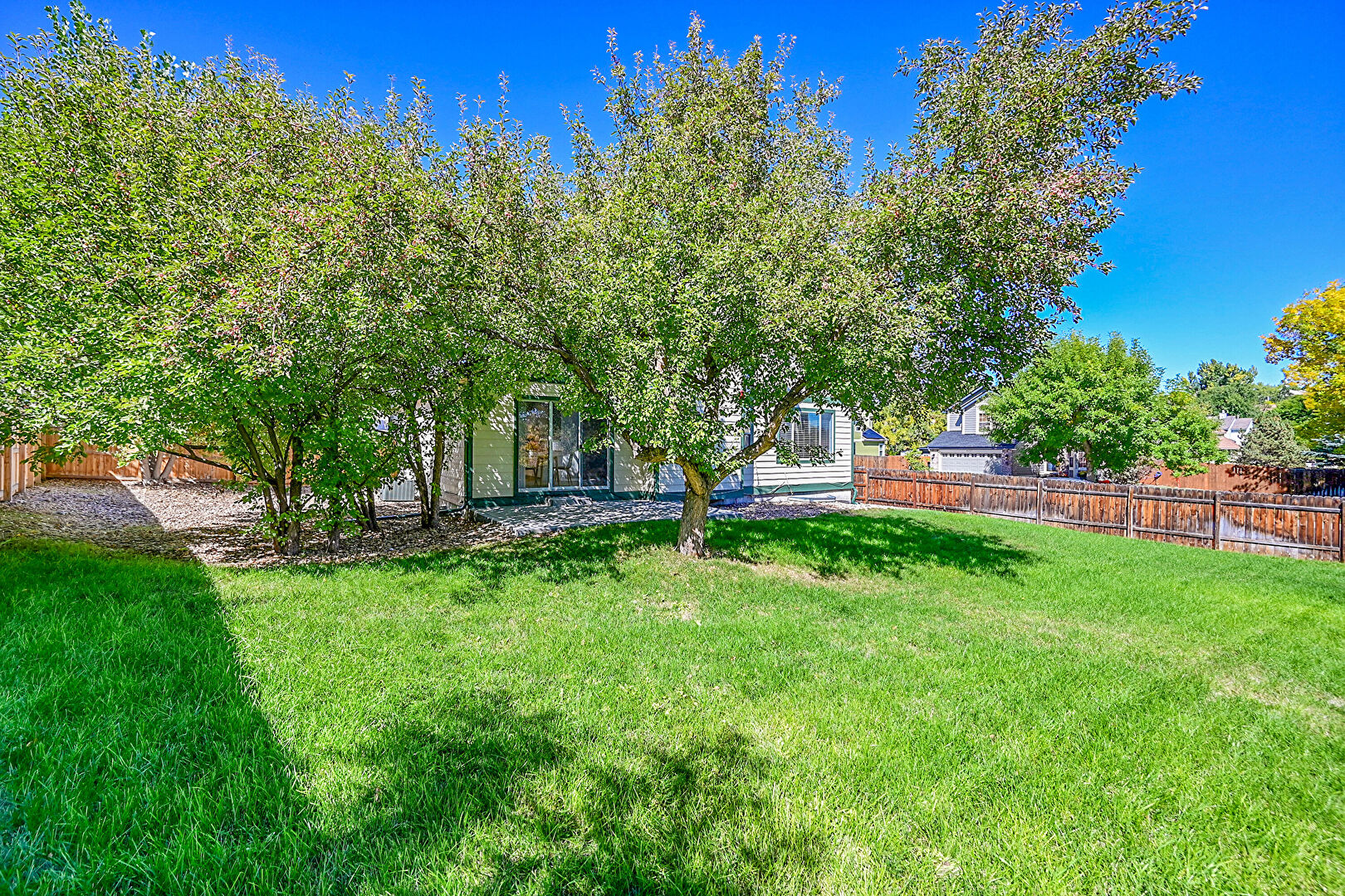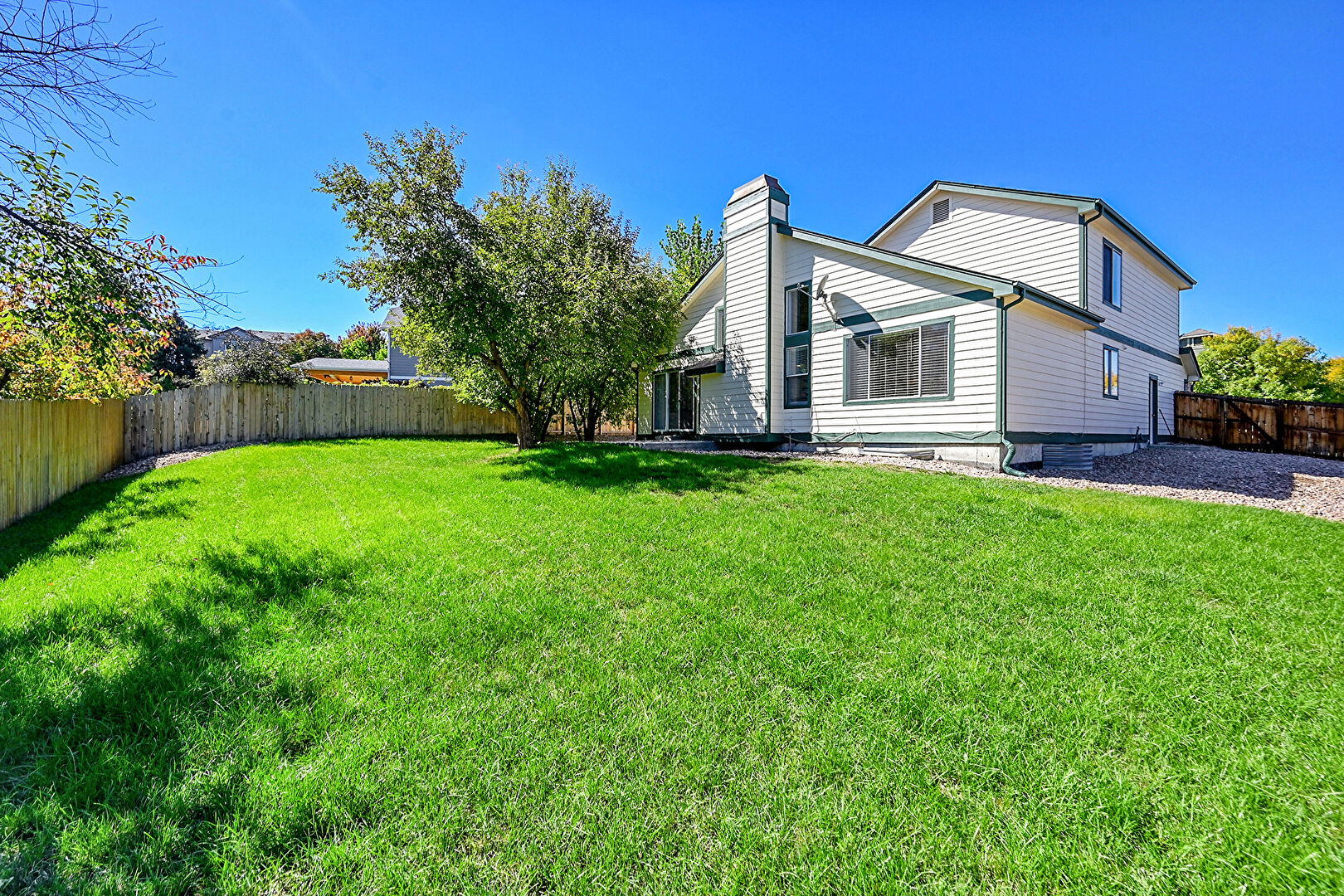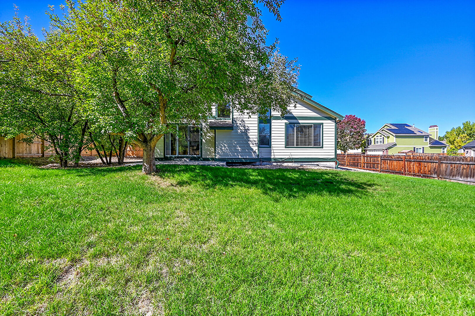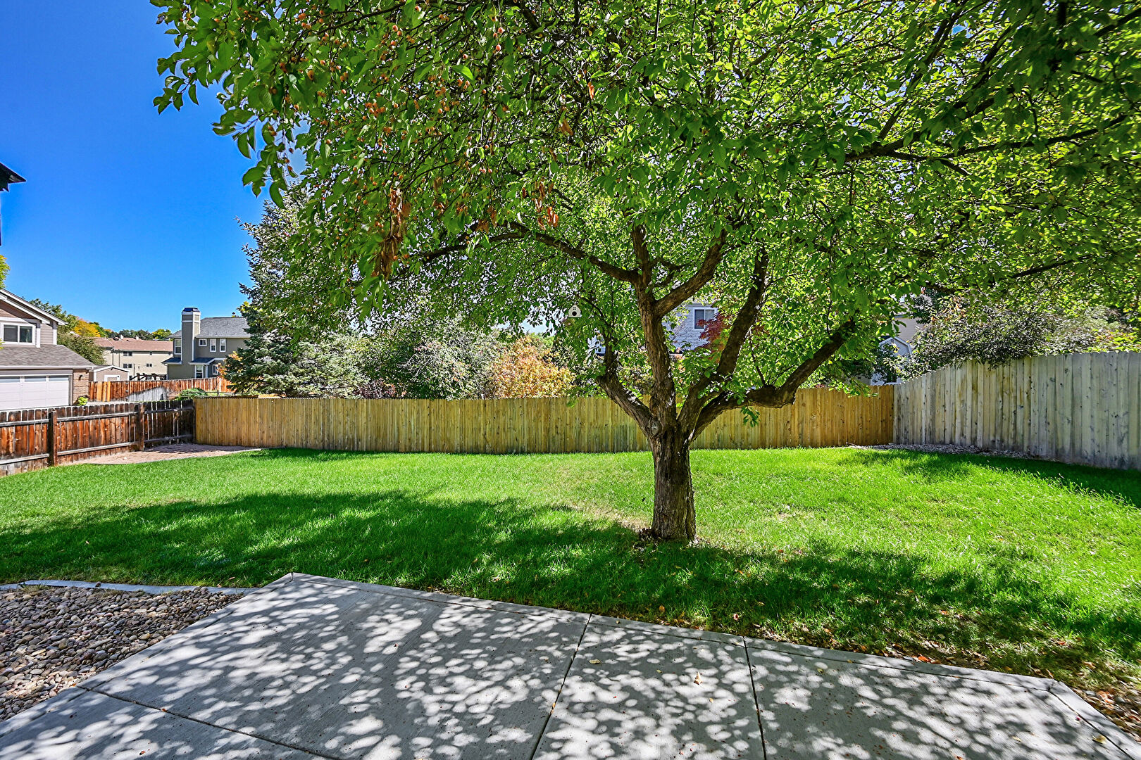 Chimney, Concrete Foundation, Downspout, Fence, Gutters, Horizontal Siding, Lawn, Patio, Awning, Lawn