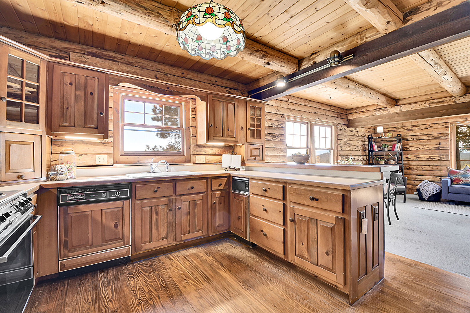 Baseboards Wall, Beamed Ceiling, Crown Molding Cabinets, Glass Insert Cabinets, Kitchen Bar, Kitchen Peninsula, Log Wall, Medium Brown Cabinets, Natural Light, Opens To Living Area, Pendant Lighting, Raised Cabinets, Stone Wall, Trash Compactor, U Shaped Kitchen, Wood Ceiling, Wood Finish Floor, Drywall, Raised Cabinets, Wood Ceiling