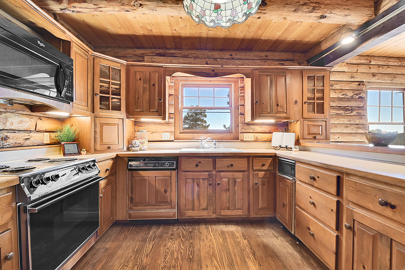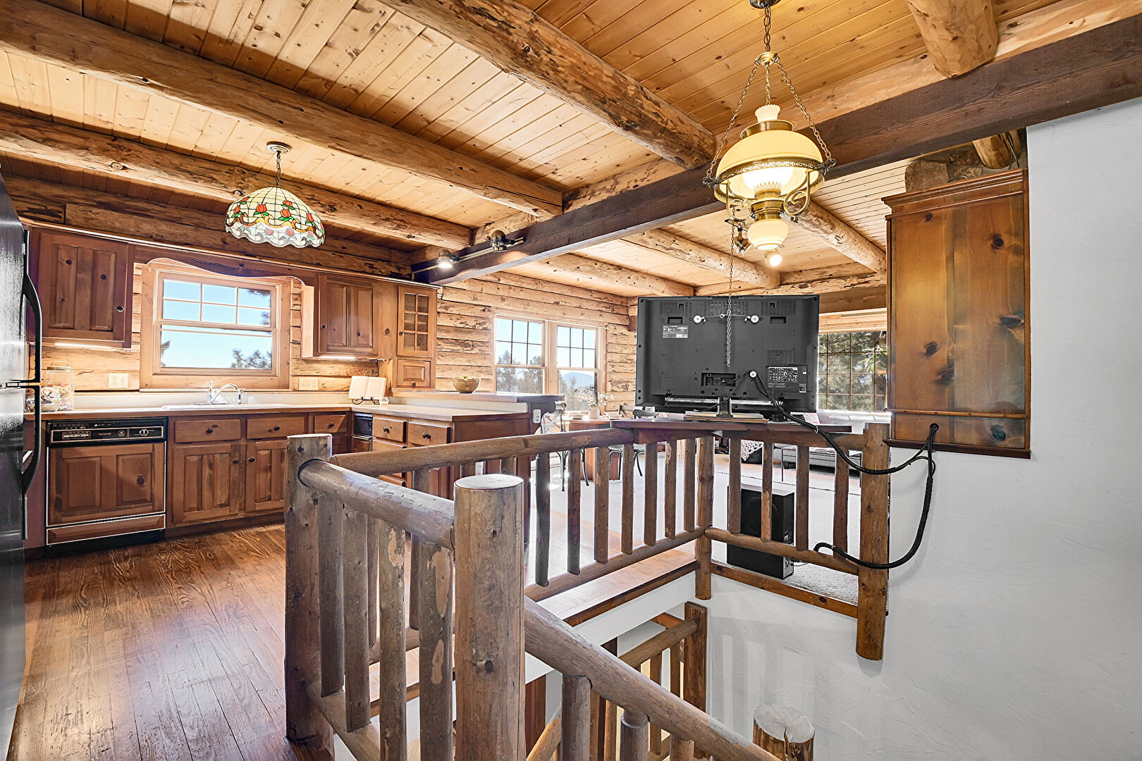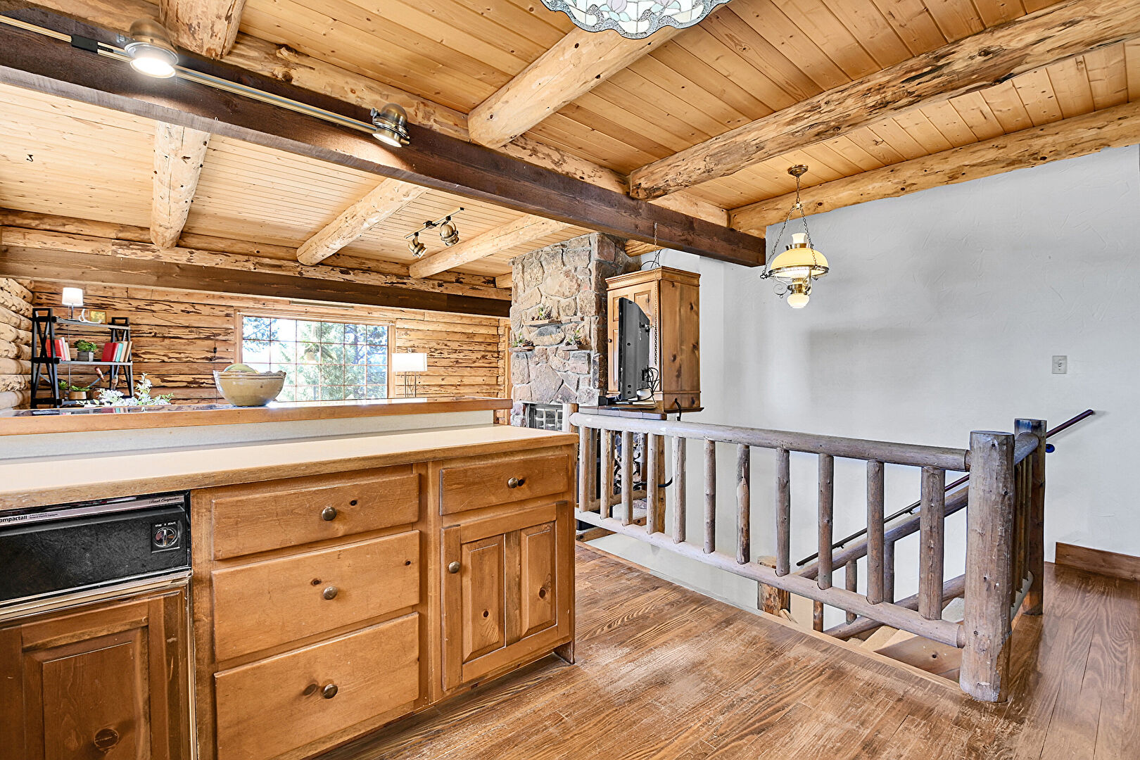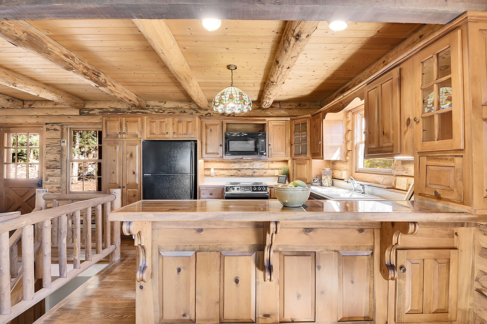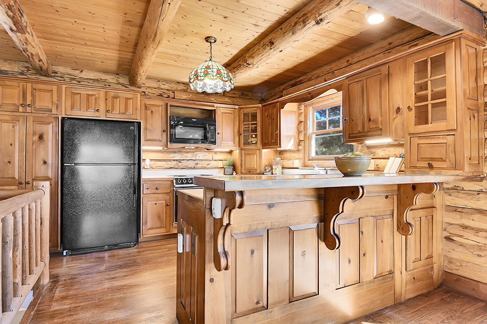 Beamed Ceiling, Log Wall, Medium Brown Cabinets, Natural Light, Pendant Lighting, Raised Cabinets, Wood Ceiling, Wood Finish Floor, Glass Insert Cabinets
