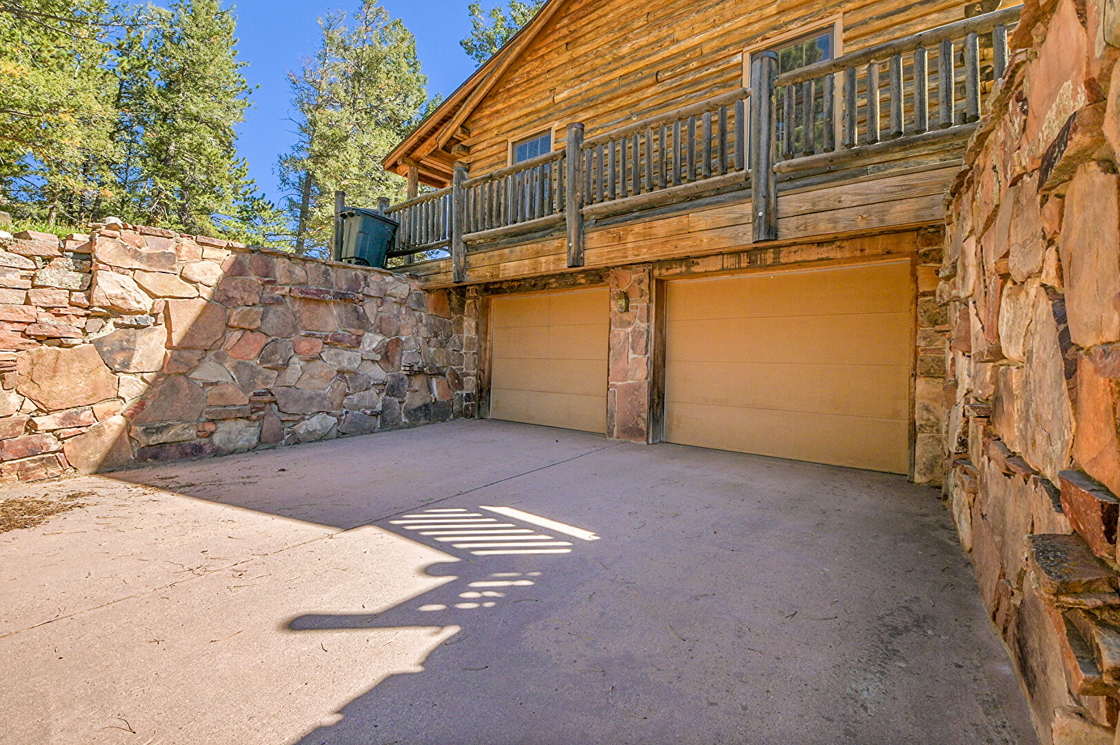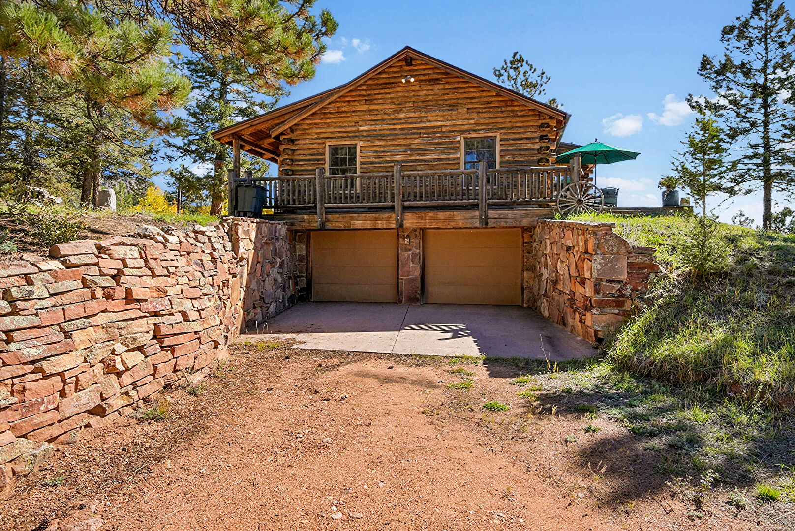 Basement Garage, Built In Garage, Chimney, Deck, Downspout, Driveway, Gutters, Horizontal Siding, Lawn, Log Siding, Outdoor Dining Area, Patio, Porch, Stone Siding, Log Siding, Satellite Dish, Wood Siding