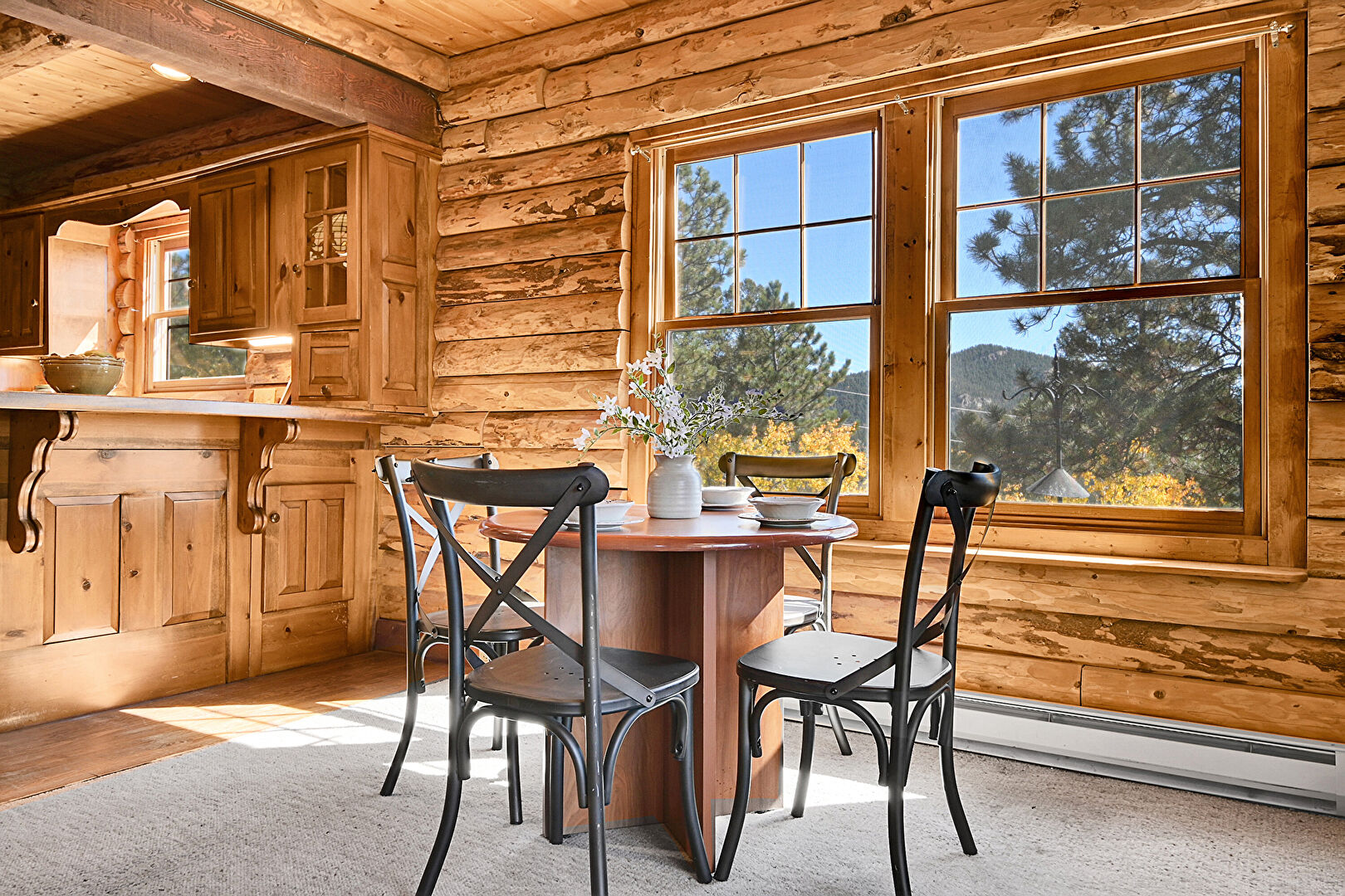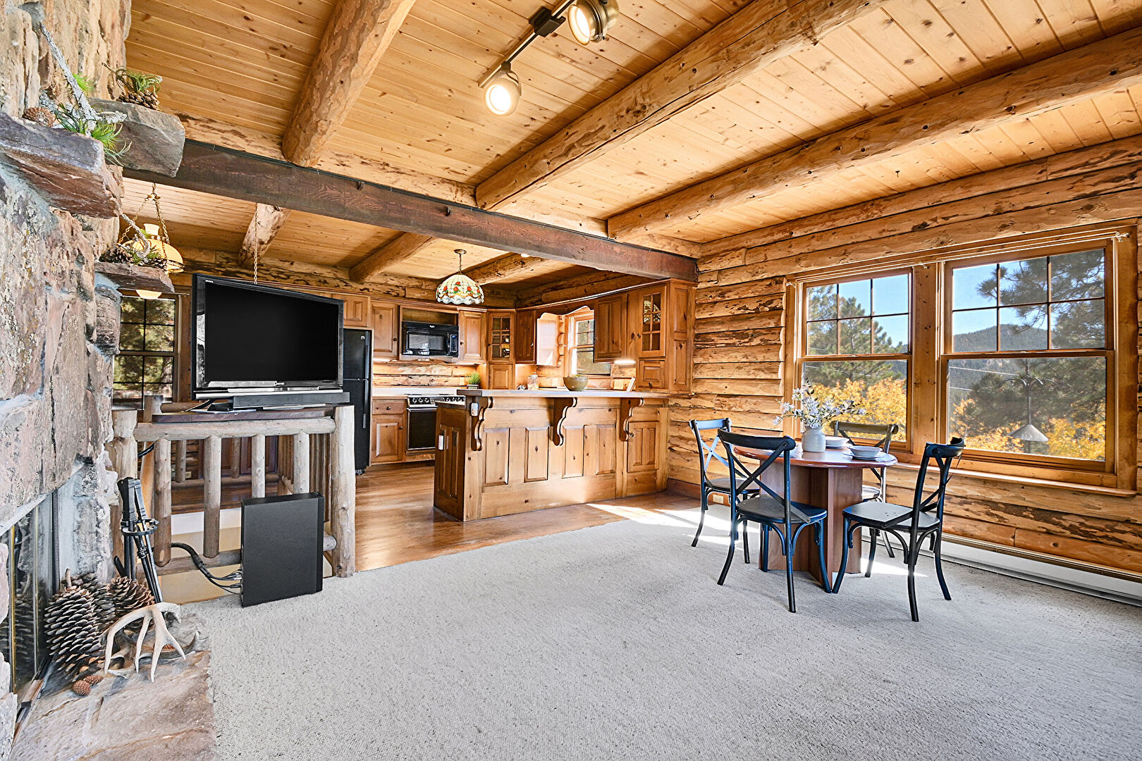 Baseboard Radiator, Beamed Ceiling, Carpet, Fireplace, Log Wall, Mountain View, Natural Light, Track Lighting, U Shaped Kitchen, Wood Ceiling, Wood Finish Floor, Beamed Ceiling, Carpet, Wood Ceiling
