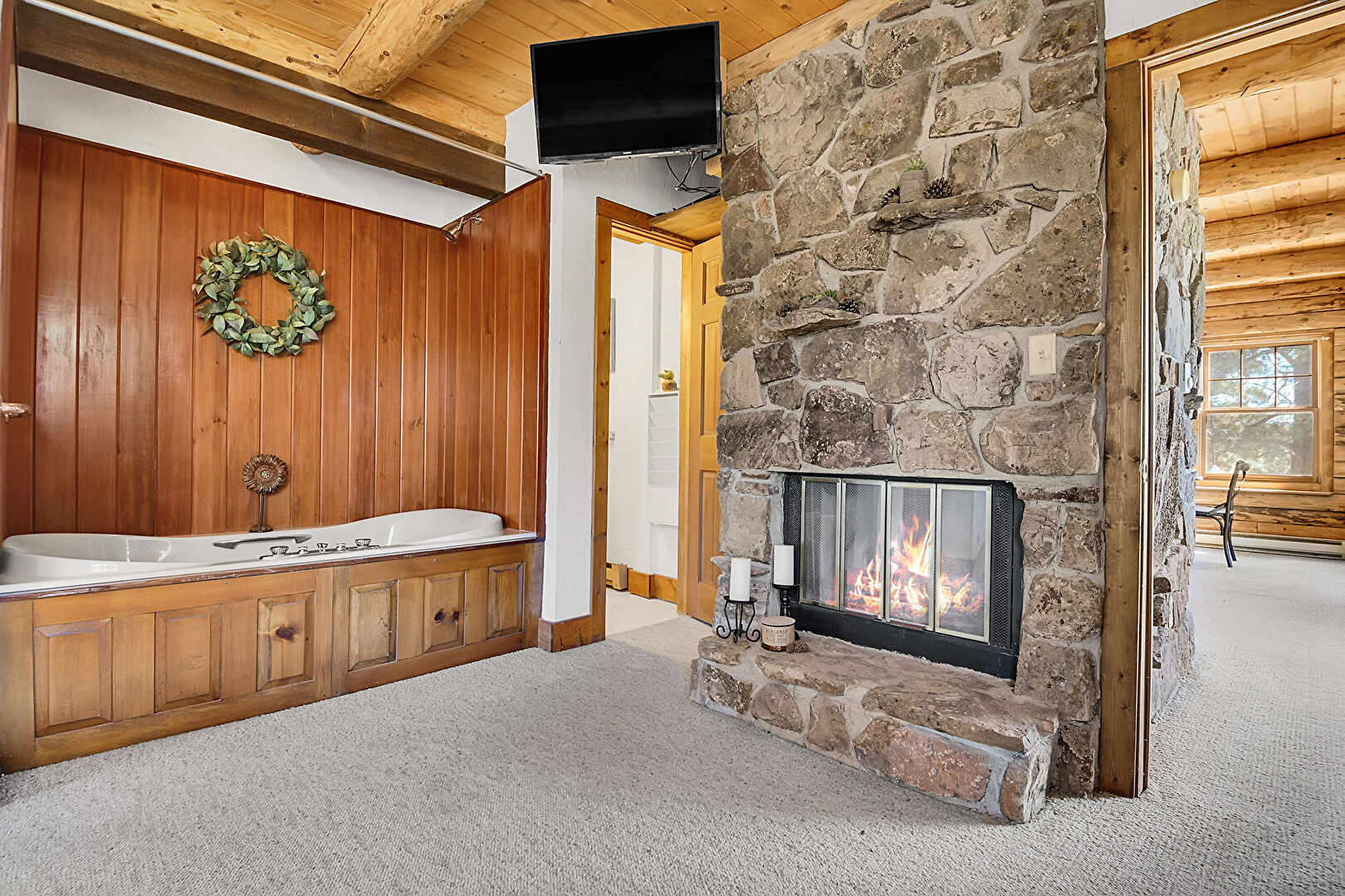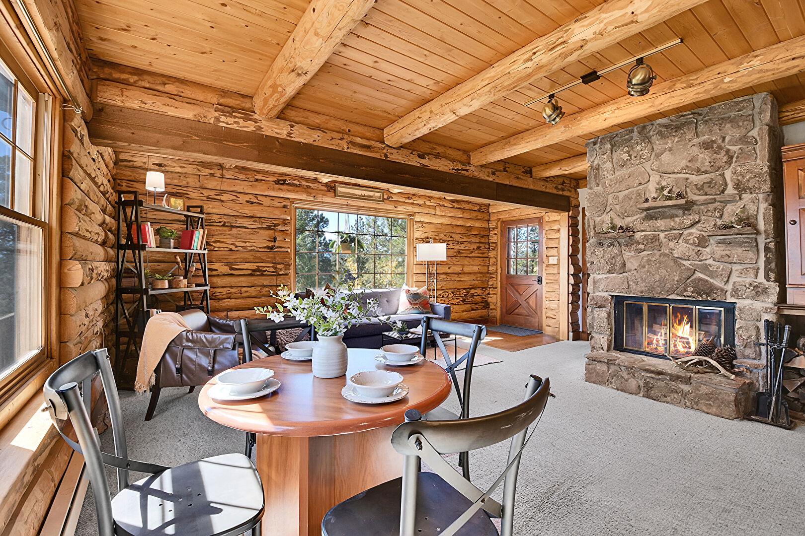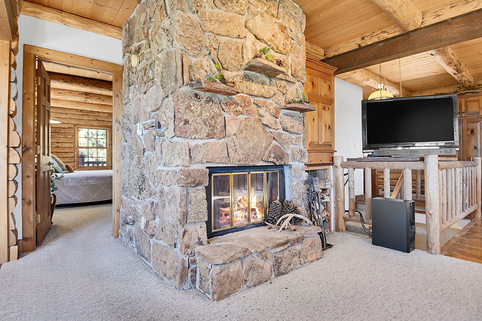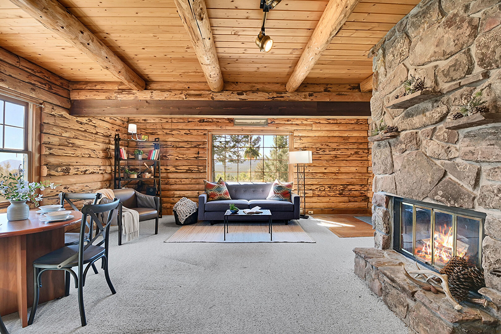 Beamed Ceiling, Carpet, Fireplace, Log Wall, Natural Light, Wood Ceiling, Beamed Ceiling, Carpet, Fireplace