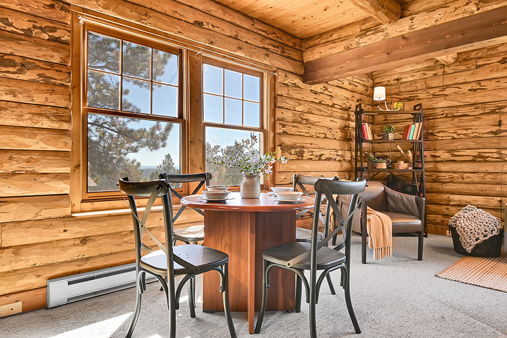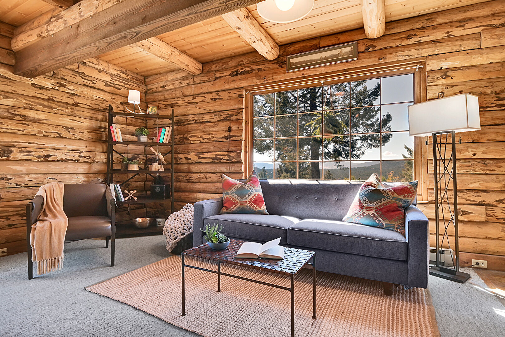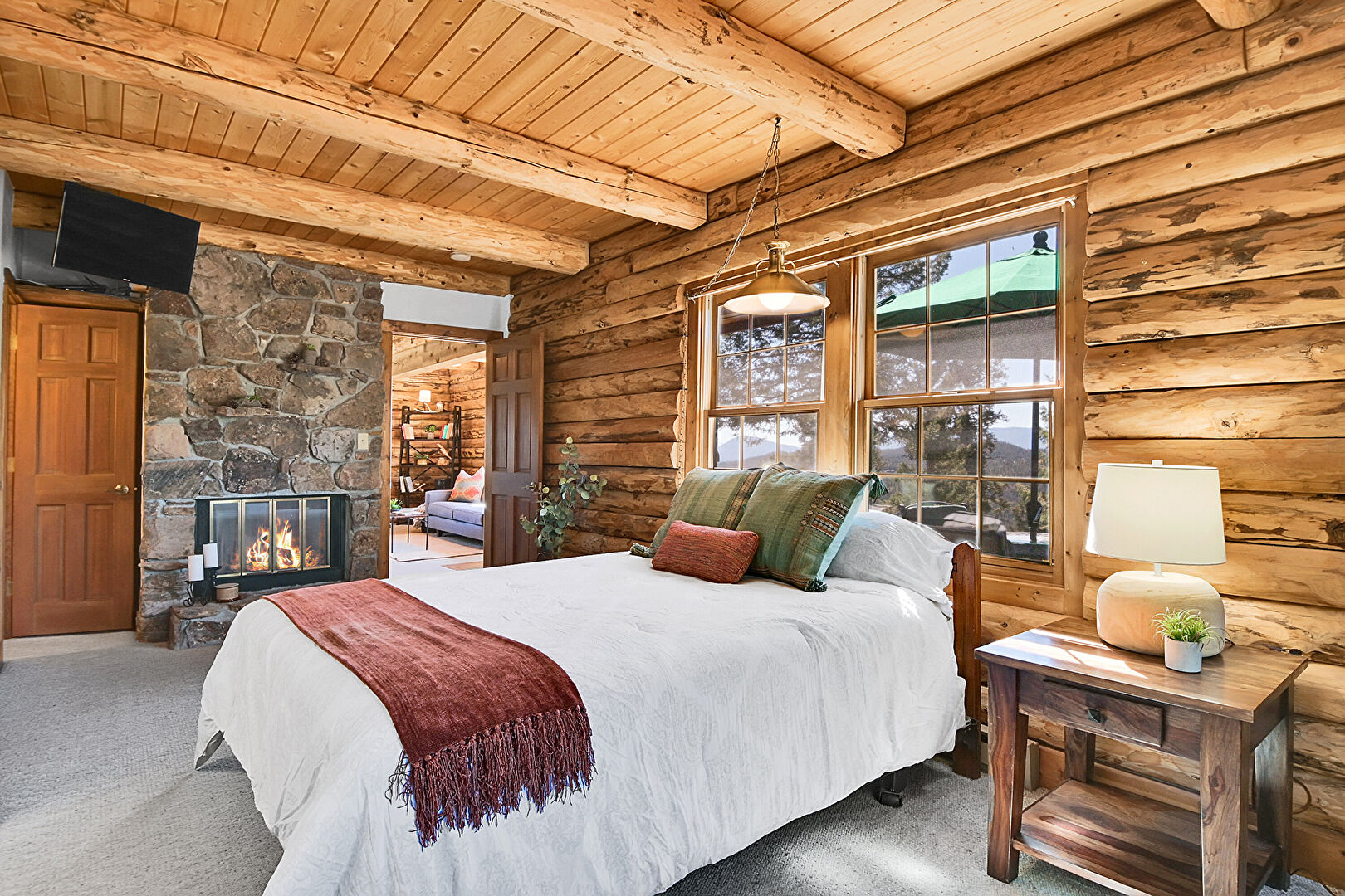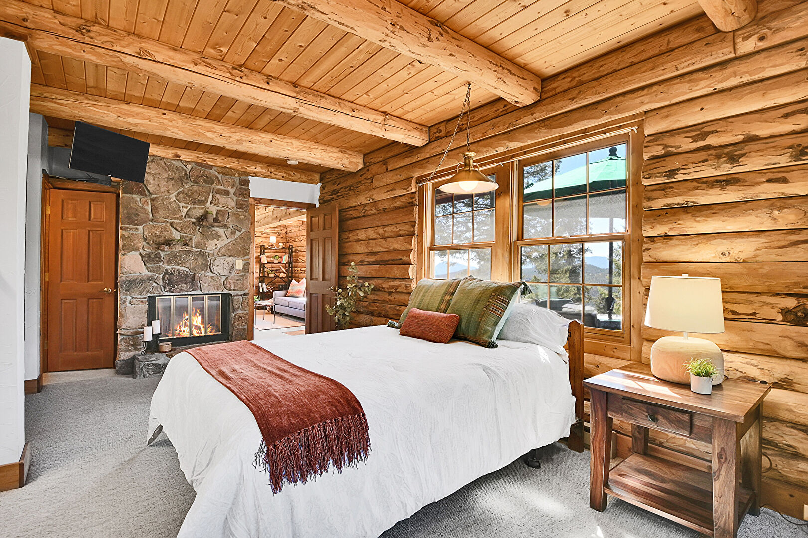 Beamed Ceiling, Carpet, Fireplace, Log Wall, Natural Light, Wood Ceiling, Beamed Ceiling, Carpet, Fireplace