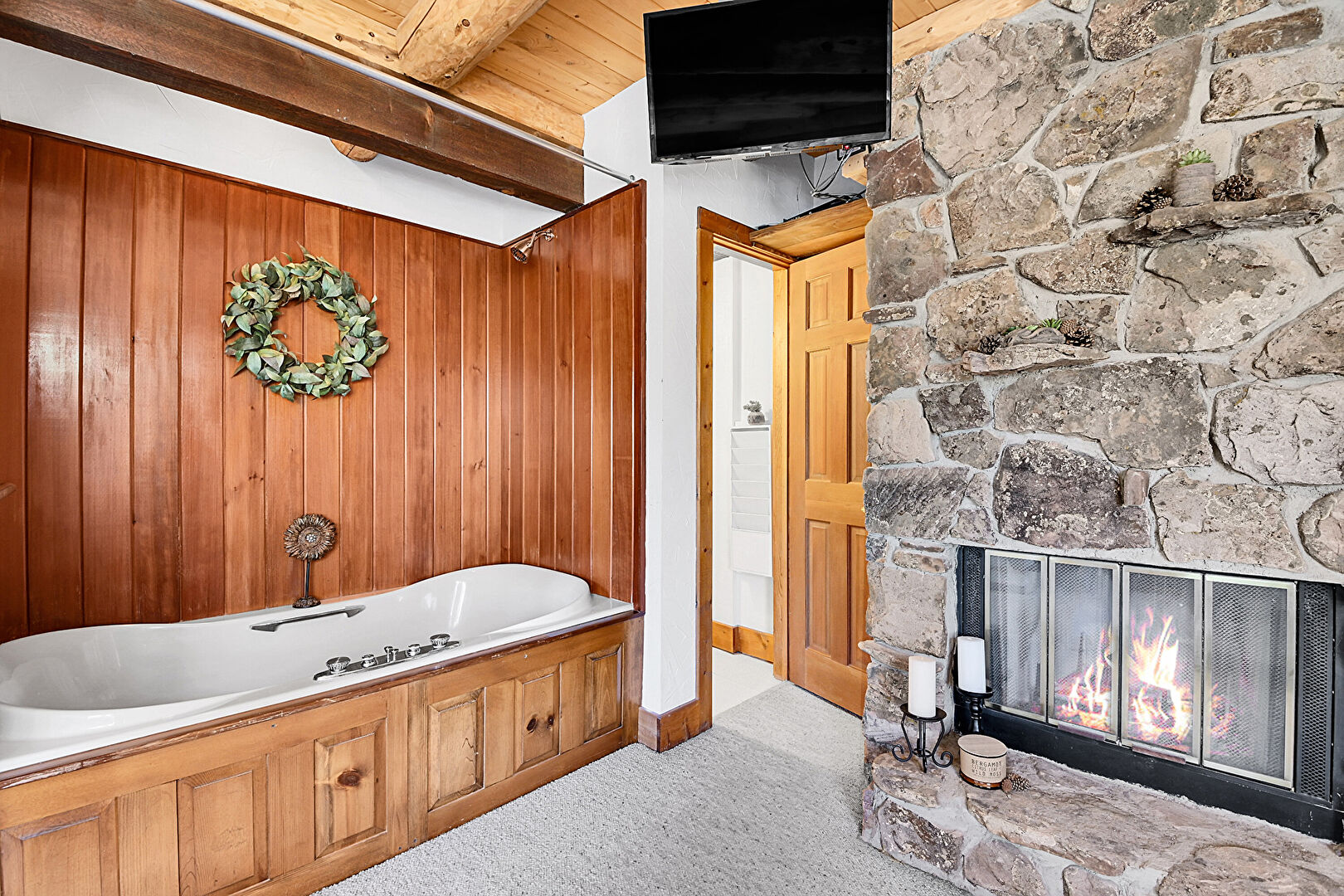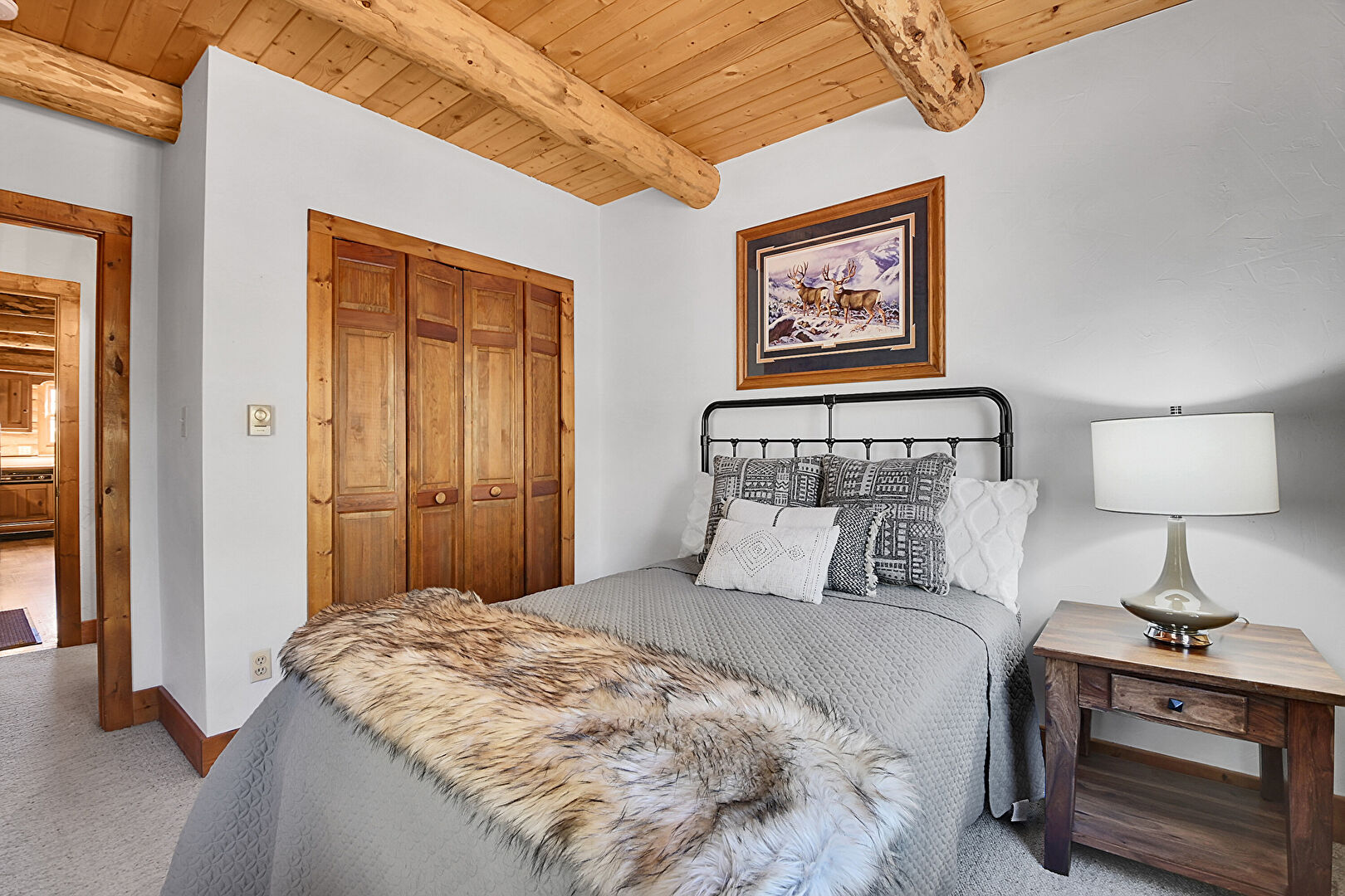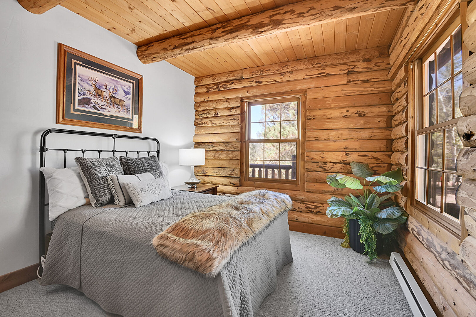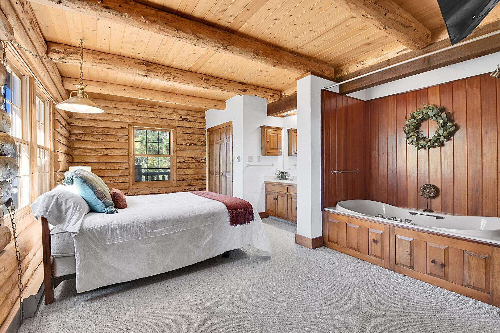 Baseboards Wall, Beamed Ceiling, Carpet, Drywall, Ensuite Bathroom, Fireplace, Log Wall, Natural Light, Wood Ceiling, Wood Wall, Baseboard Radiator, Closet, Drywall, Natural Light, Wood Ceiling