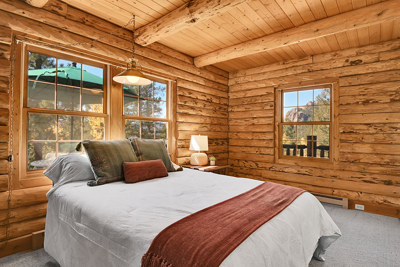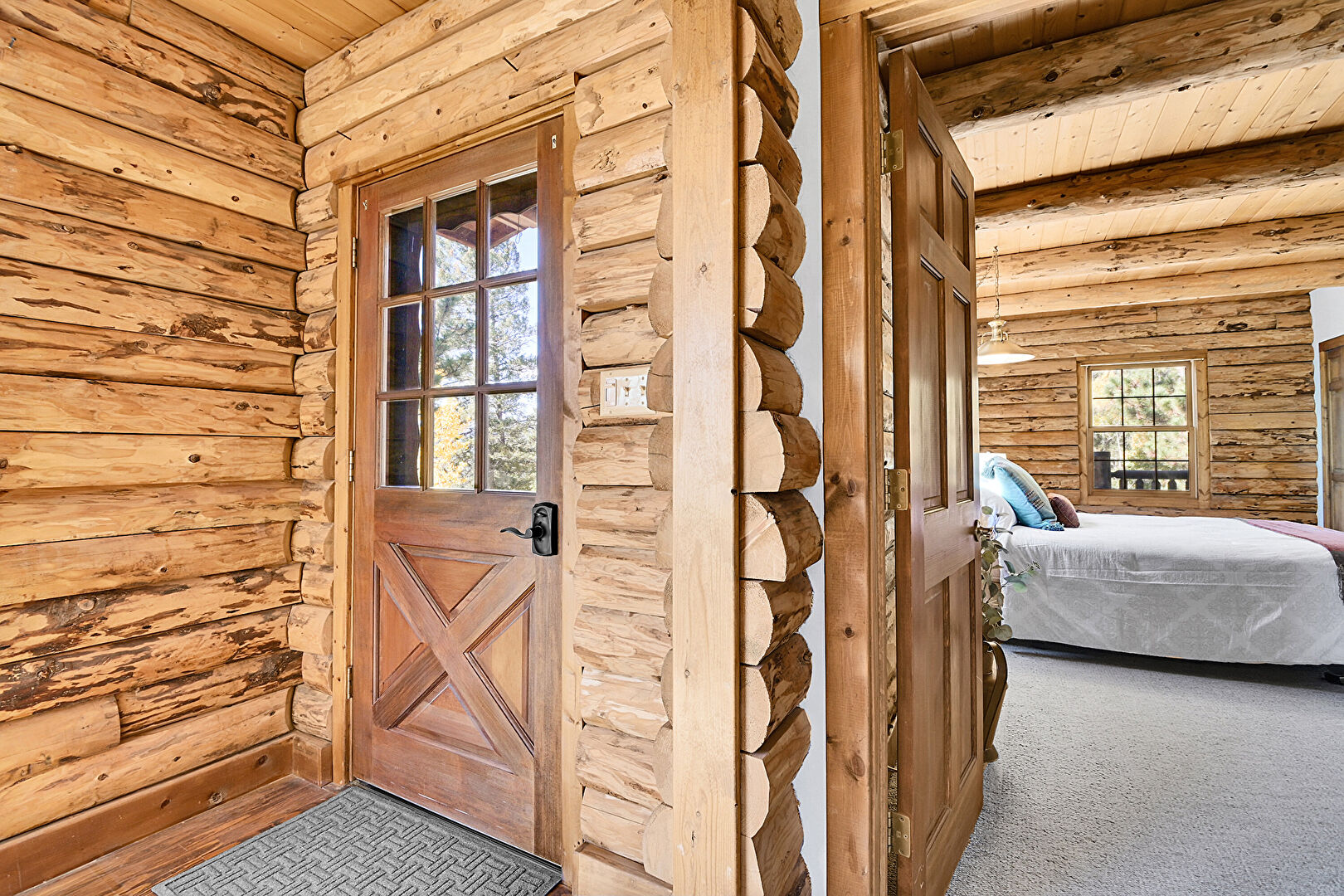 Baseboard Radiator, Baseboards Wall, Beamed Ceiling, Carpet, Closet, Drywall, Log Wall, Natural Light, Wood Ceiling, Baseboards Wall, Beamed Ceiling