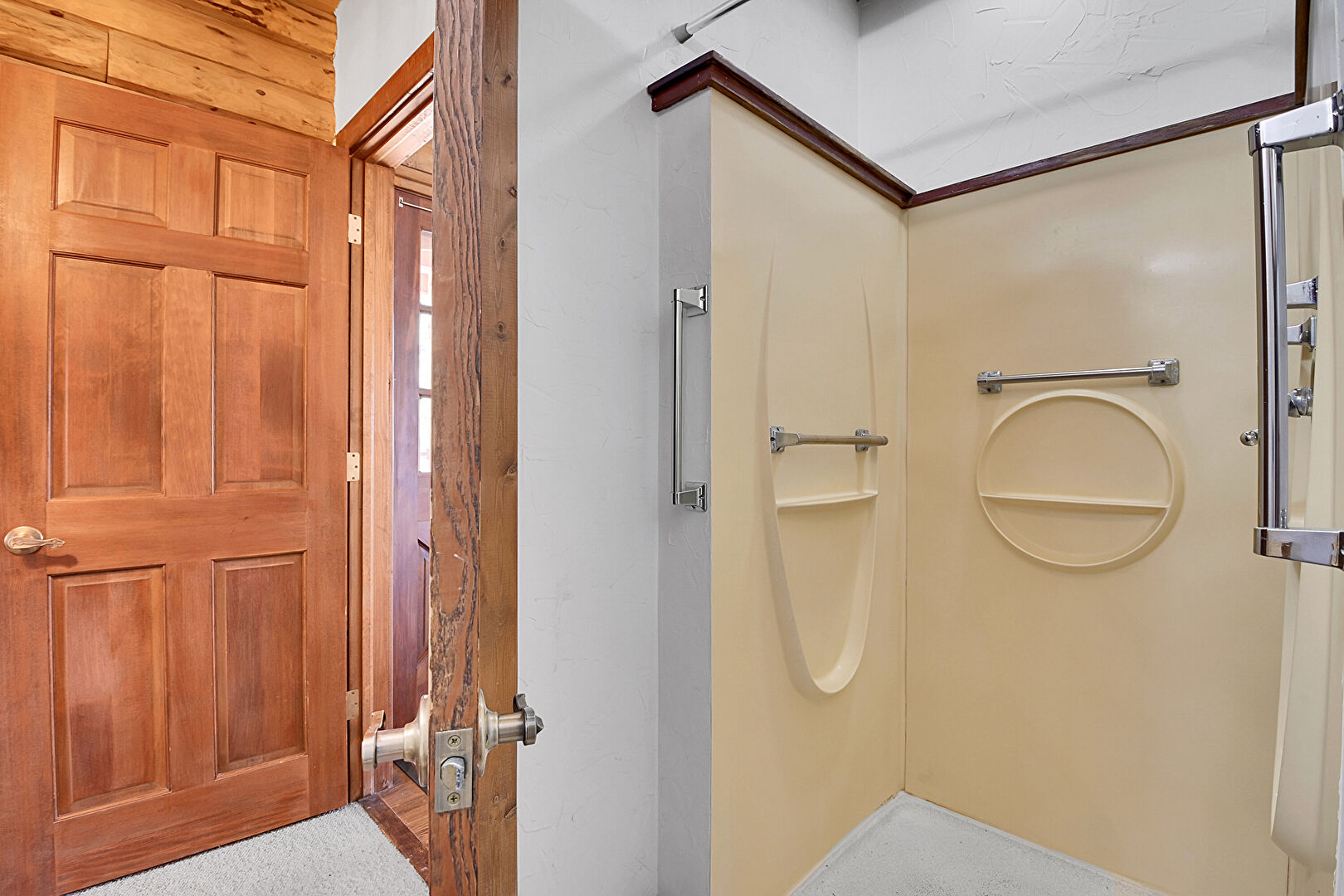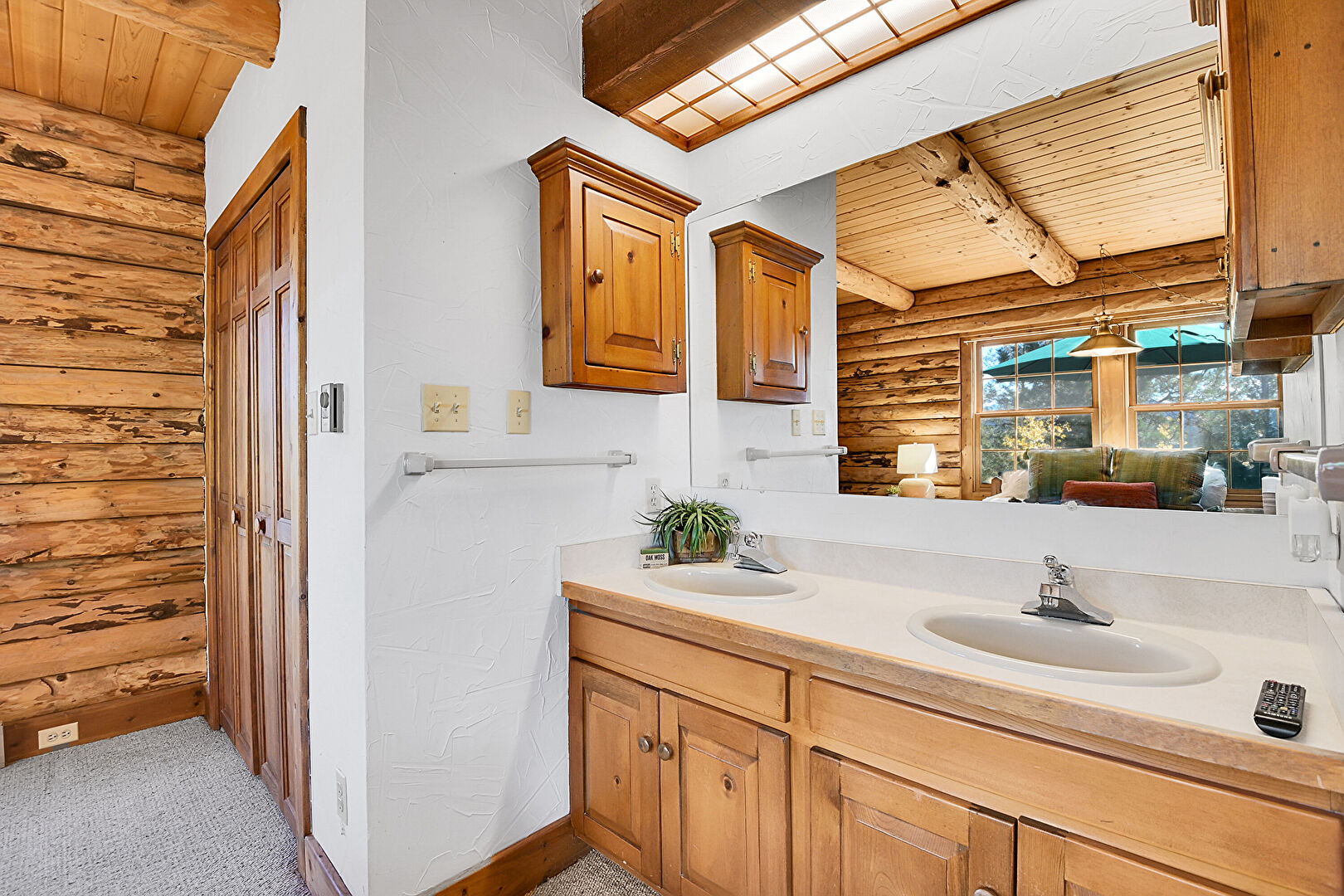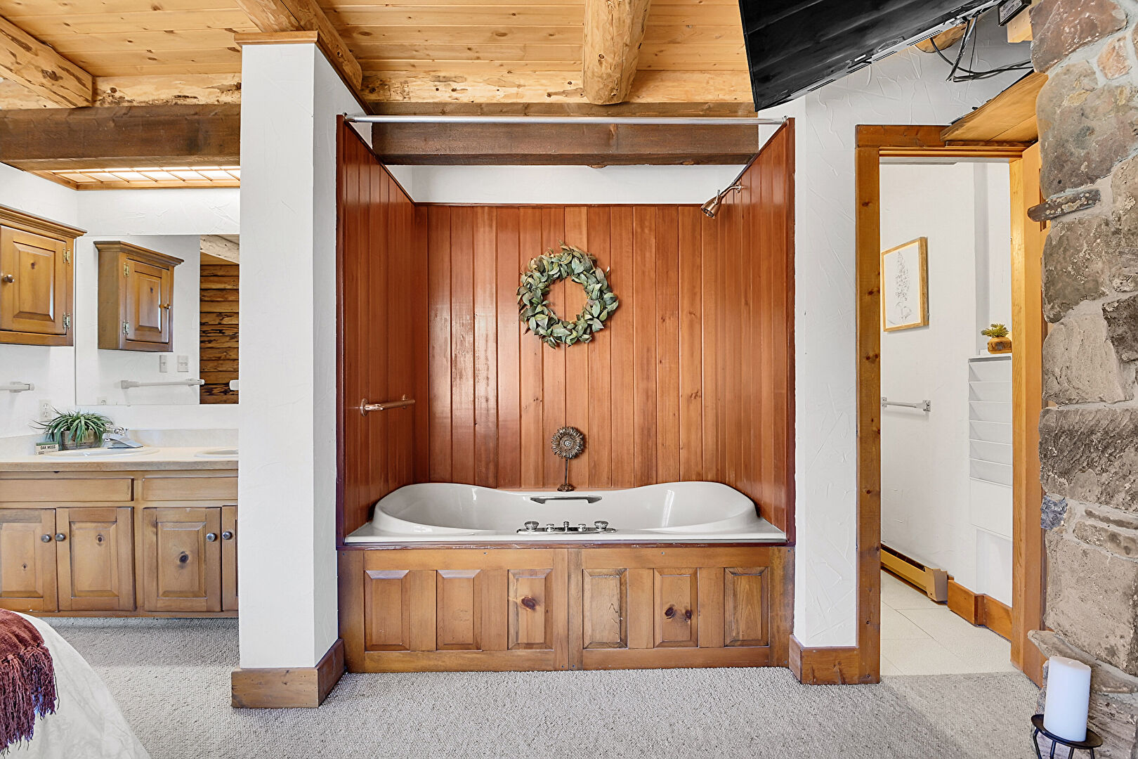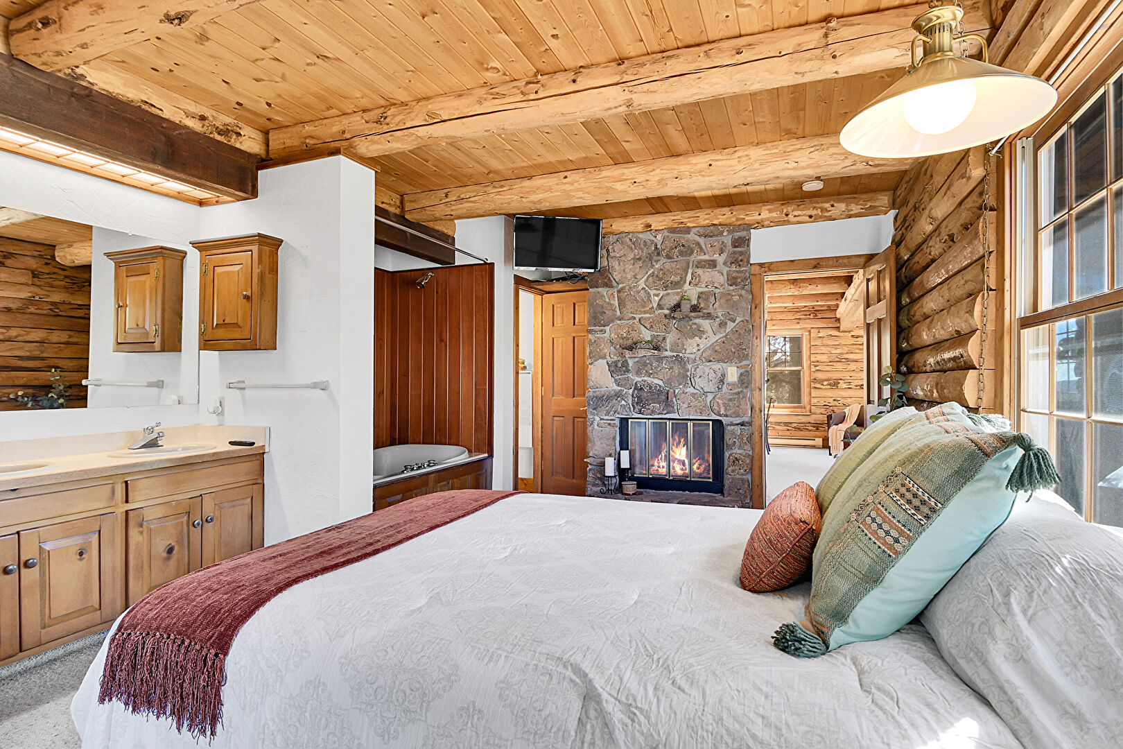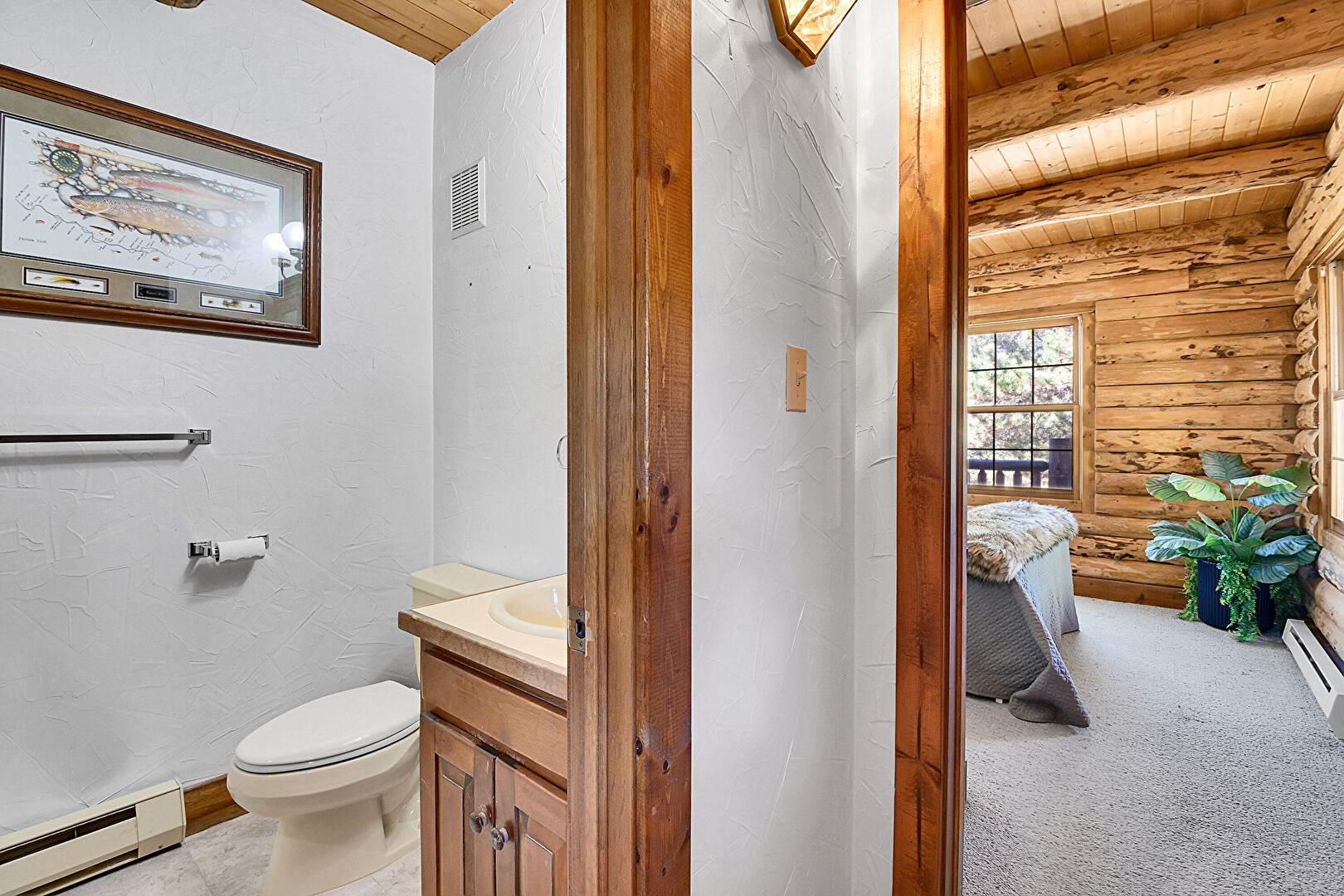 Baseboard Radiator, Baseboards Wall, Beamed Ceiling, Carpet, Double Vanity, Drywall, Fireplace, Full Bathroom, Log Wall, Natural Light, Tile Floor, Vanity, Wood Ceiling, Wood Wall, Baseboard Radiator, Carpet, Drywall, Full Bathroom