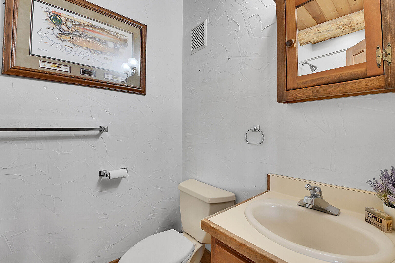 Baseboard Radiator, Baseboards Wall, Beamed Ceiling, Carpet, Drywall, Half Bathroom, Log Wall, Natural Light, Textured Wall, Vanity, Vent, Carpet, Vanity, Wood Ceiling