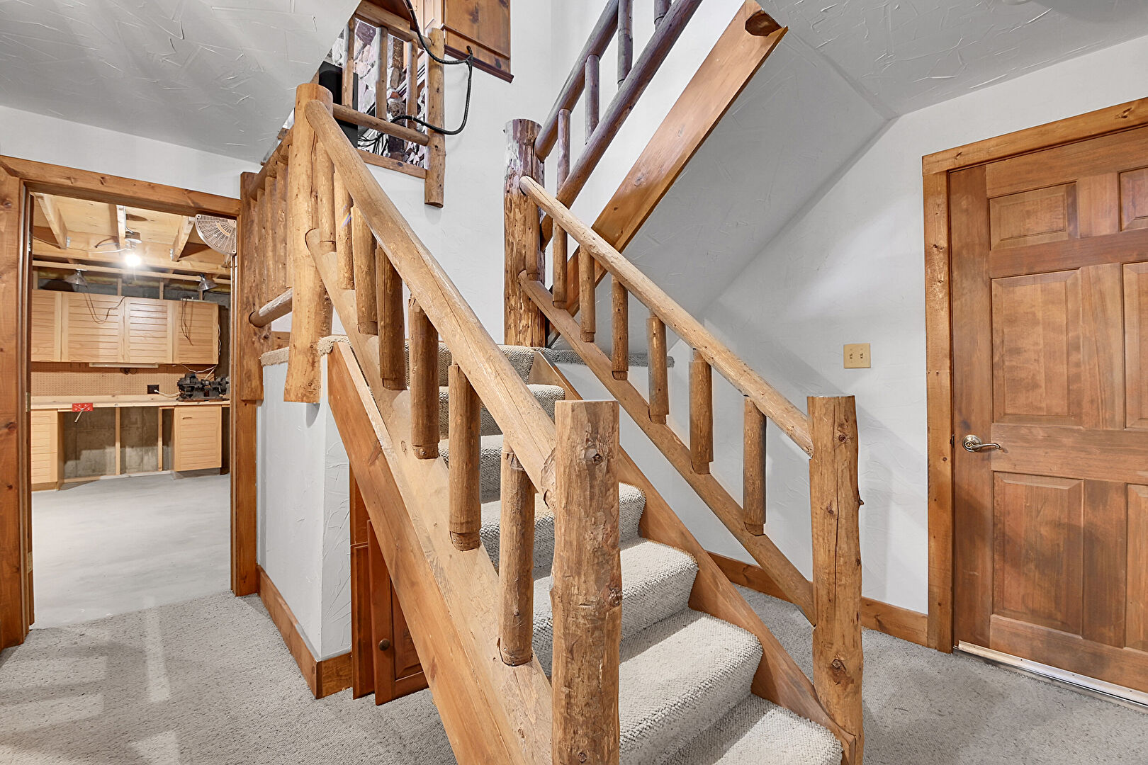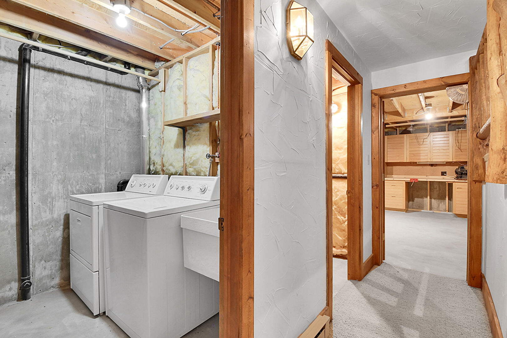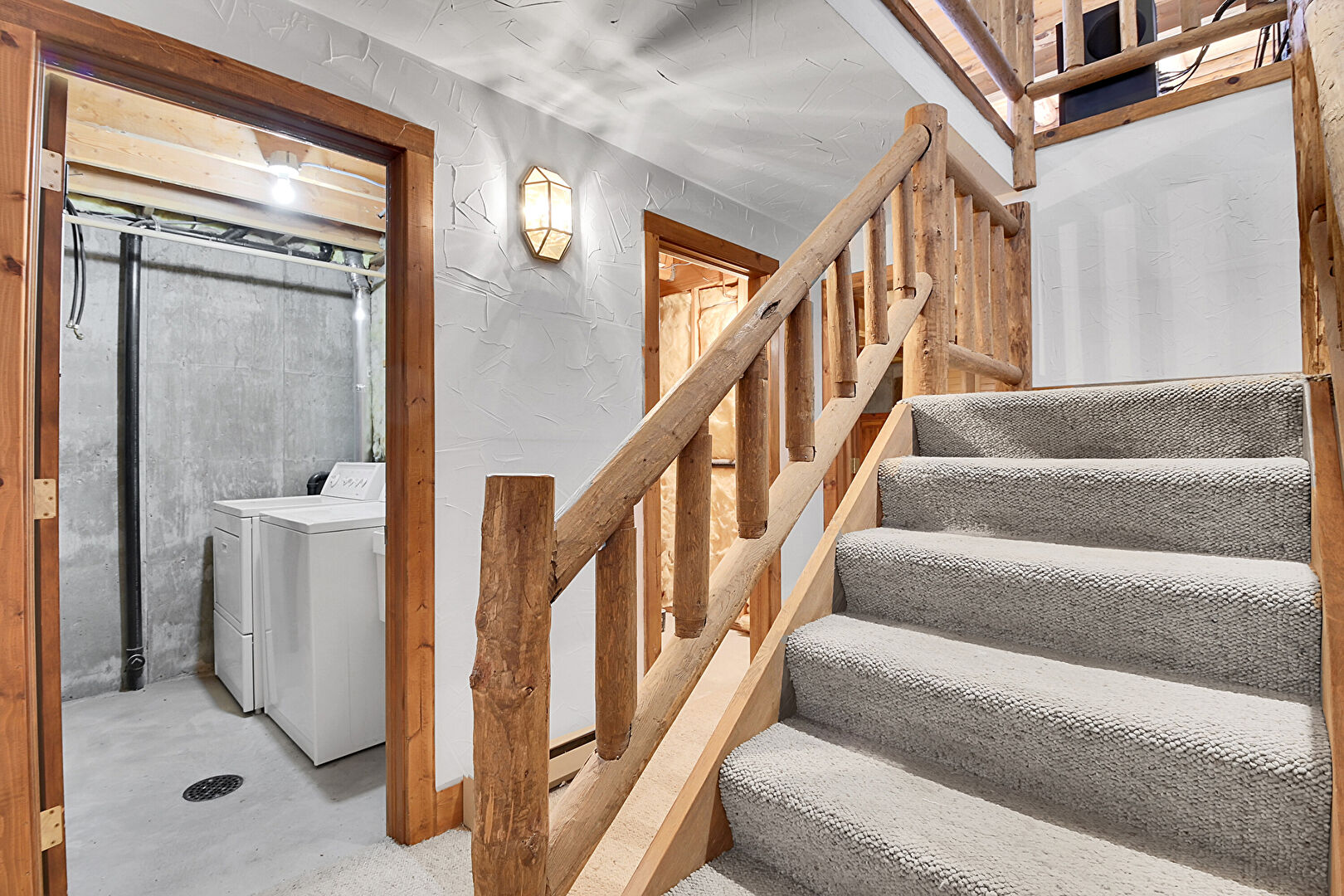 Baseboards Wall, Basement, Carpet, Concrete Floor, Concrete Wall, Drywall, Laundry, Stairs, Stairs, Vaulted Ceiling