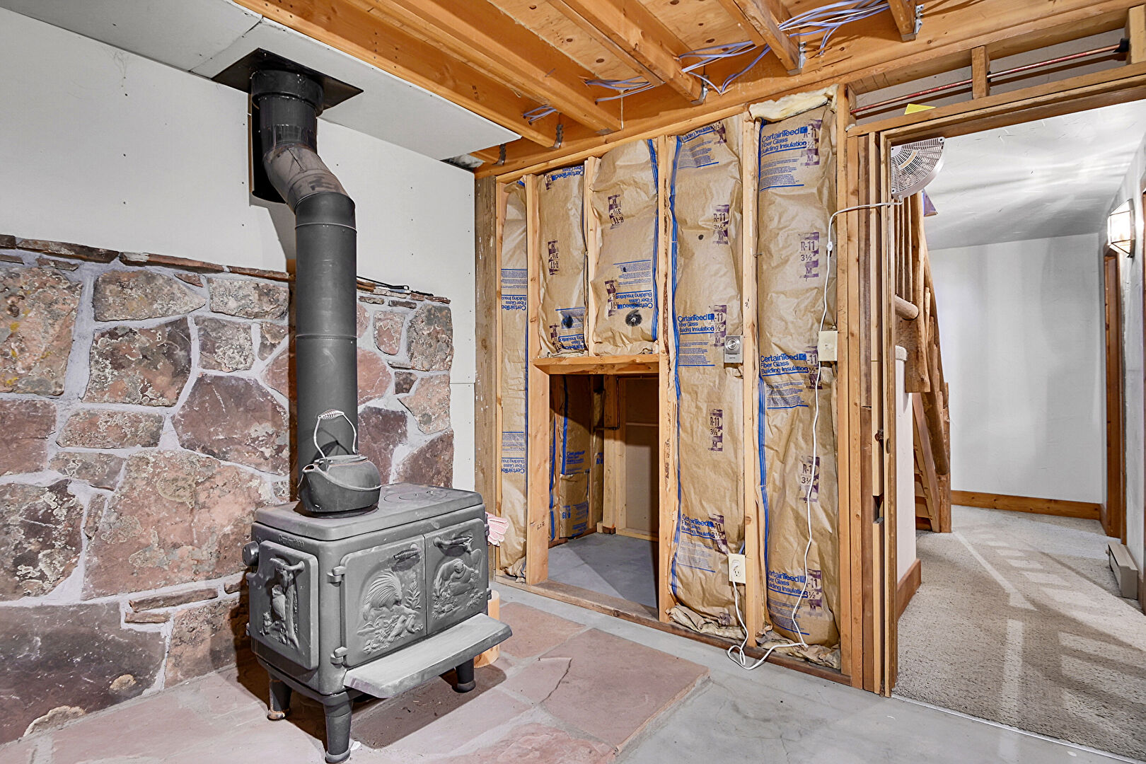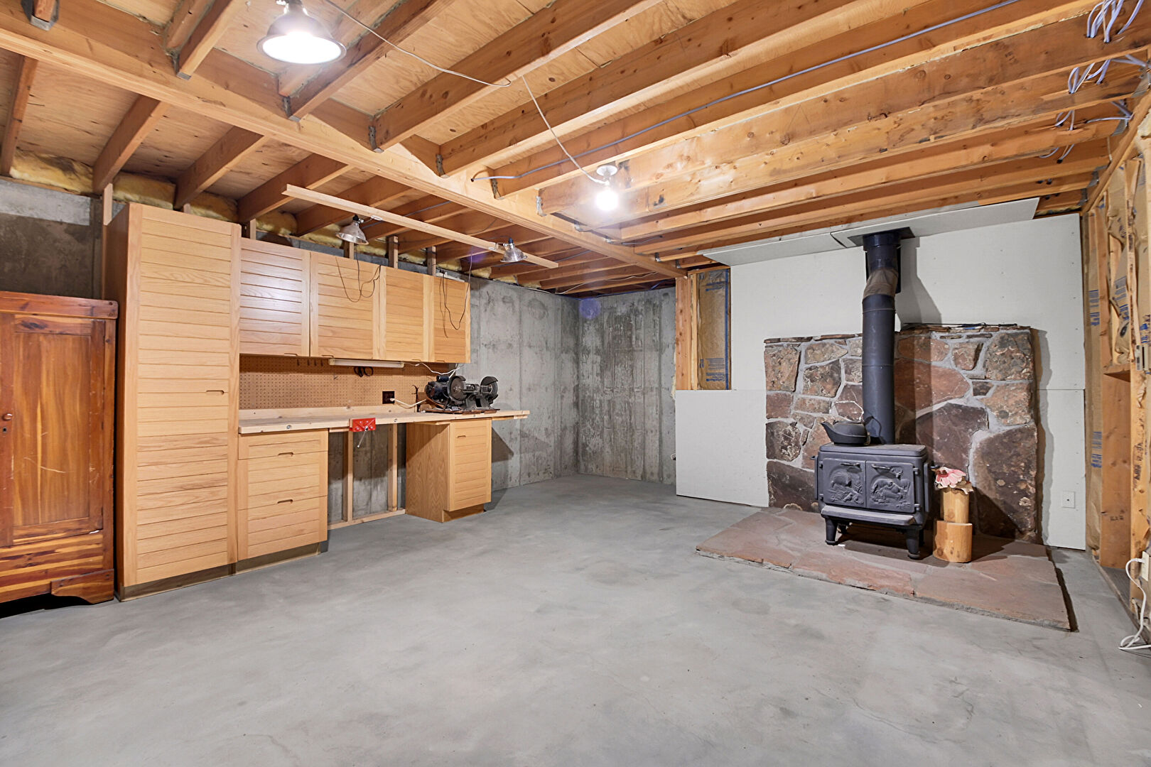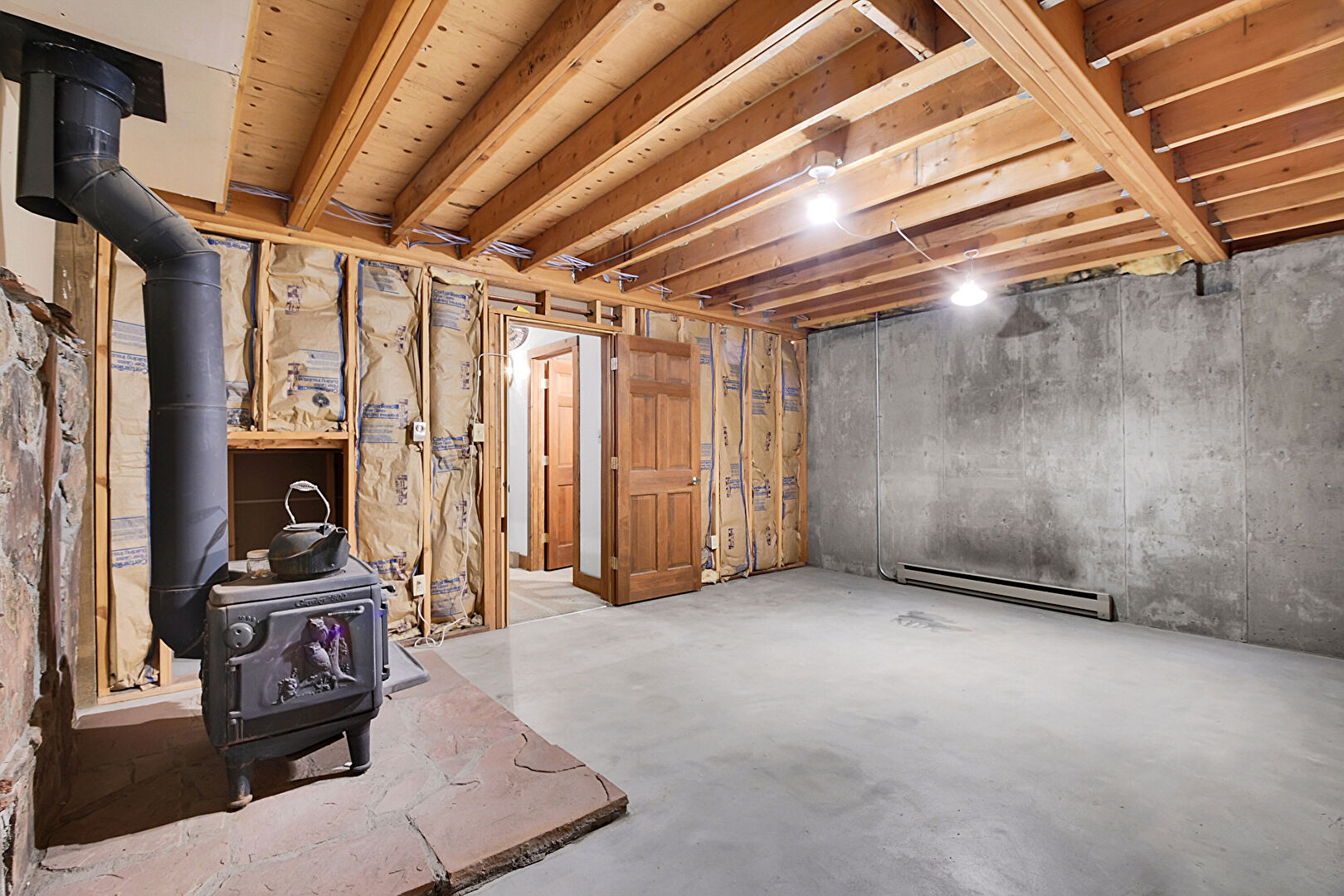Baseboard Radiator, Basement, Concrete Wall, Wood Stove, Workshop, Concrete Foundation, Drywall, Wood Stove