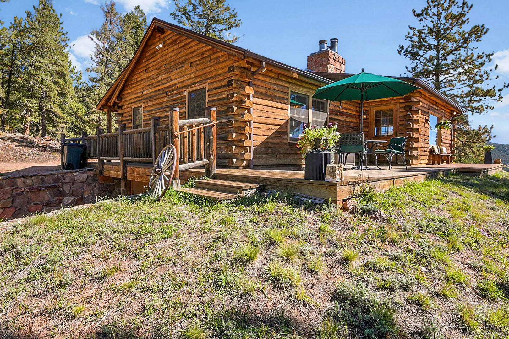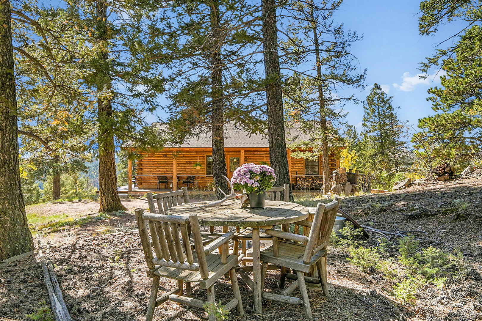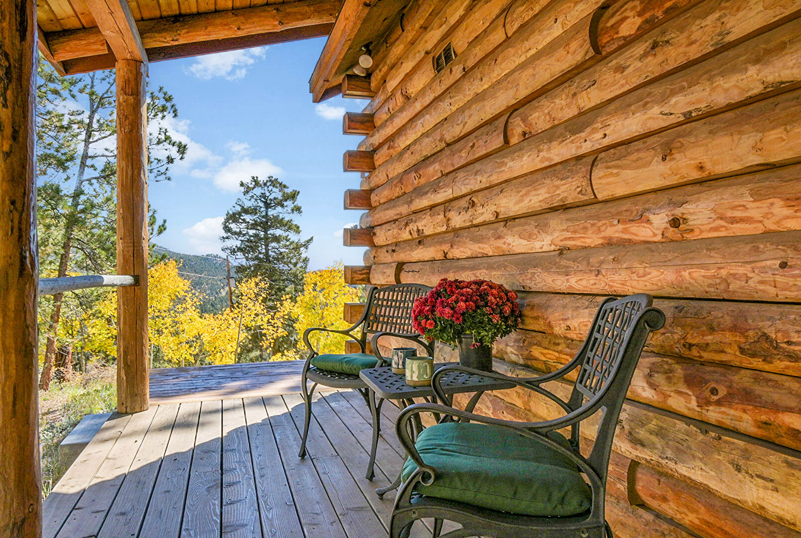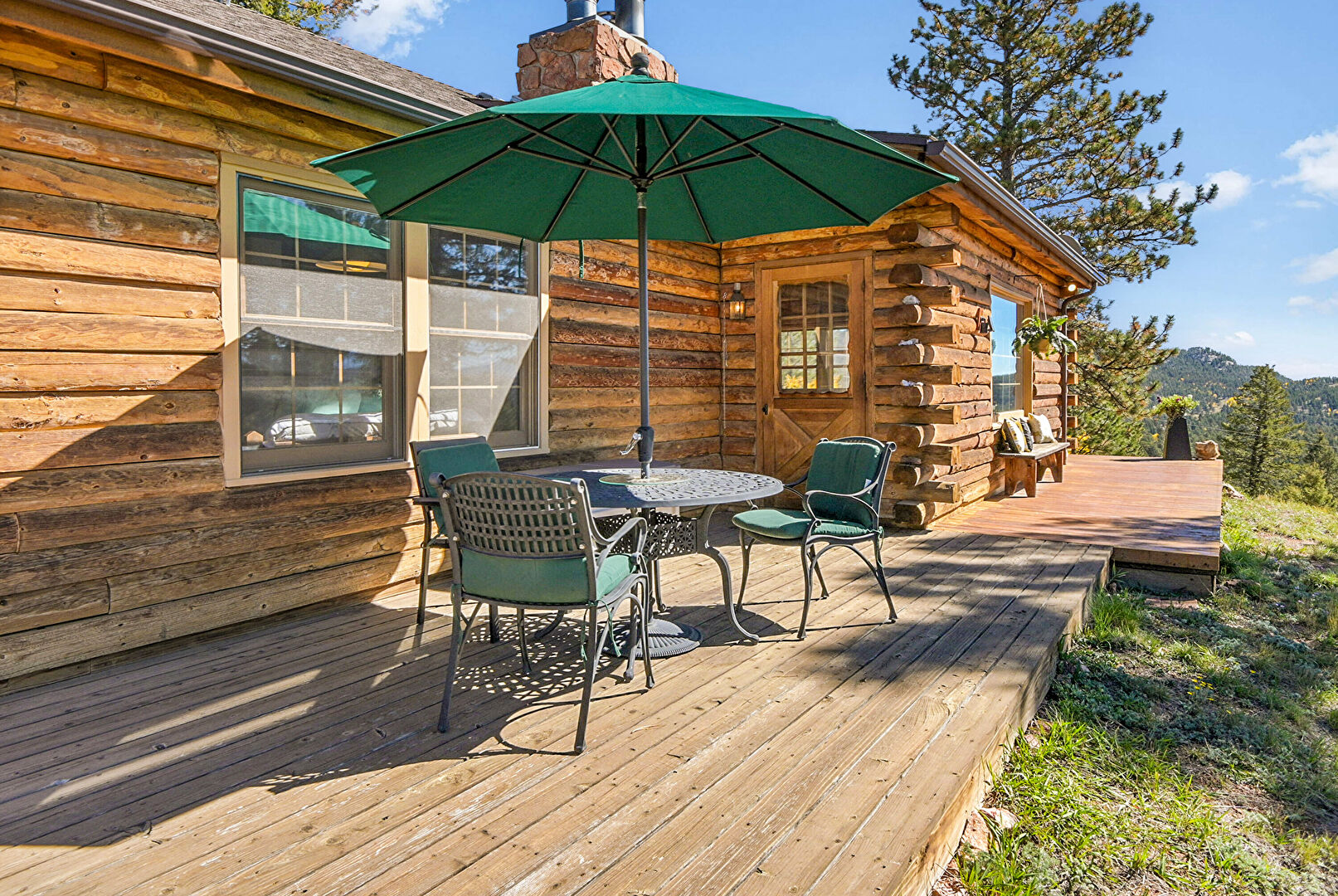 Chimney, Deck, Downspout, Gutters, Horizontal Siding, Outdoor Dining Area, Log Siding