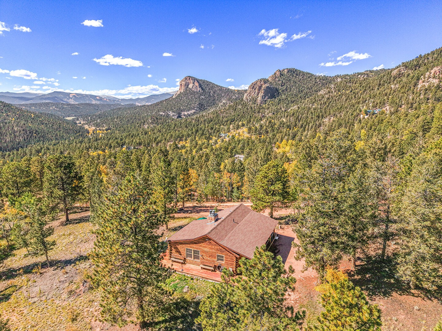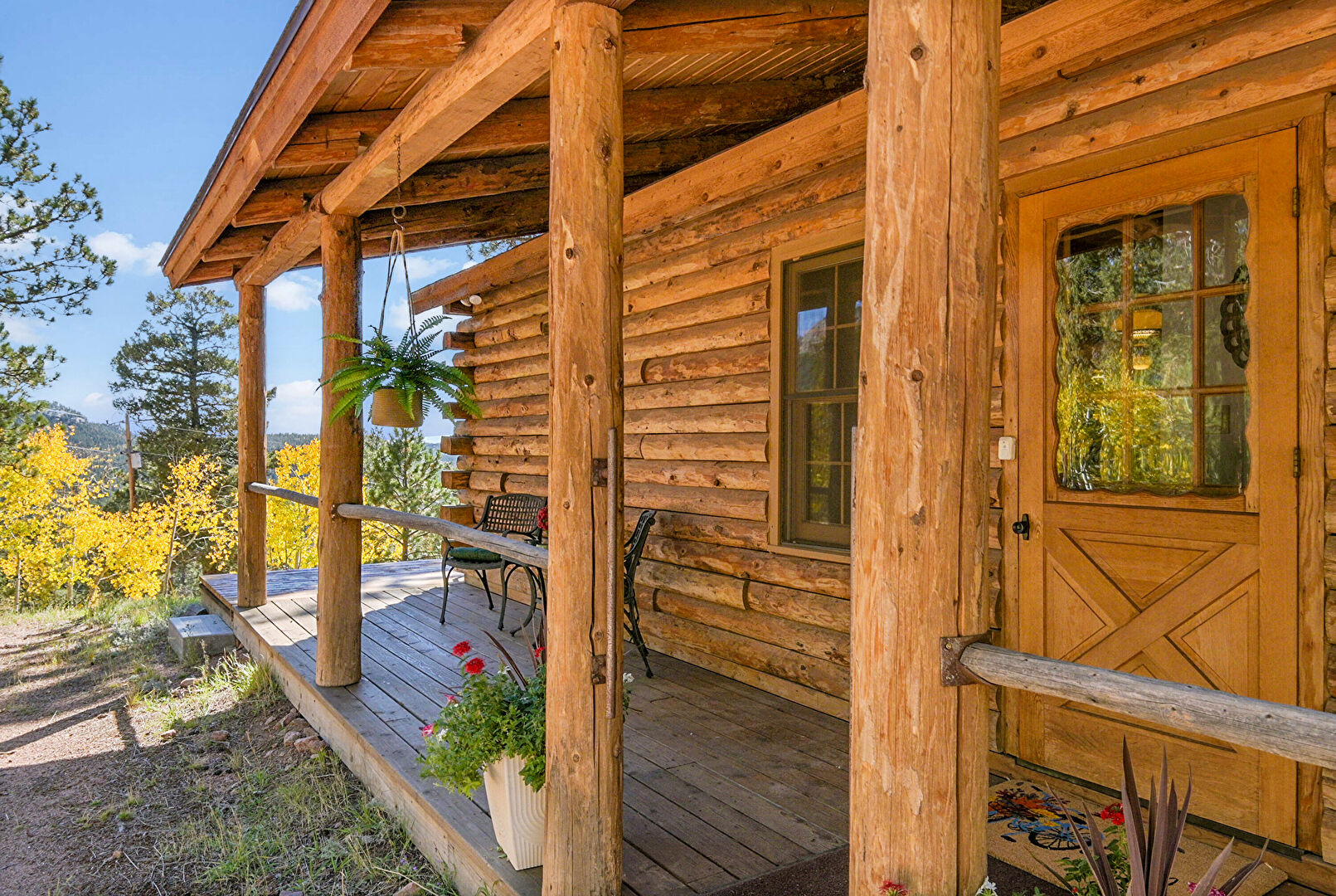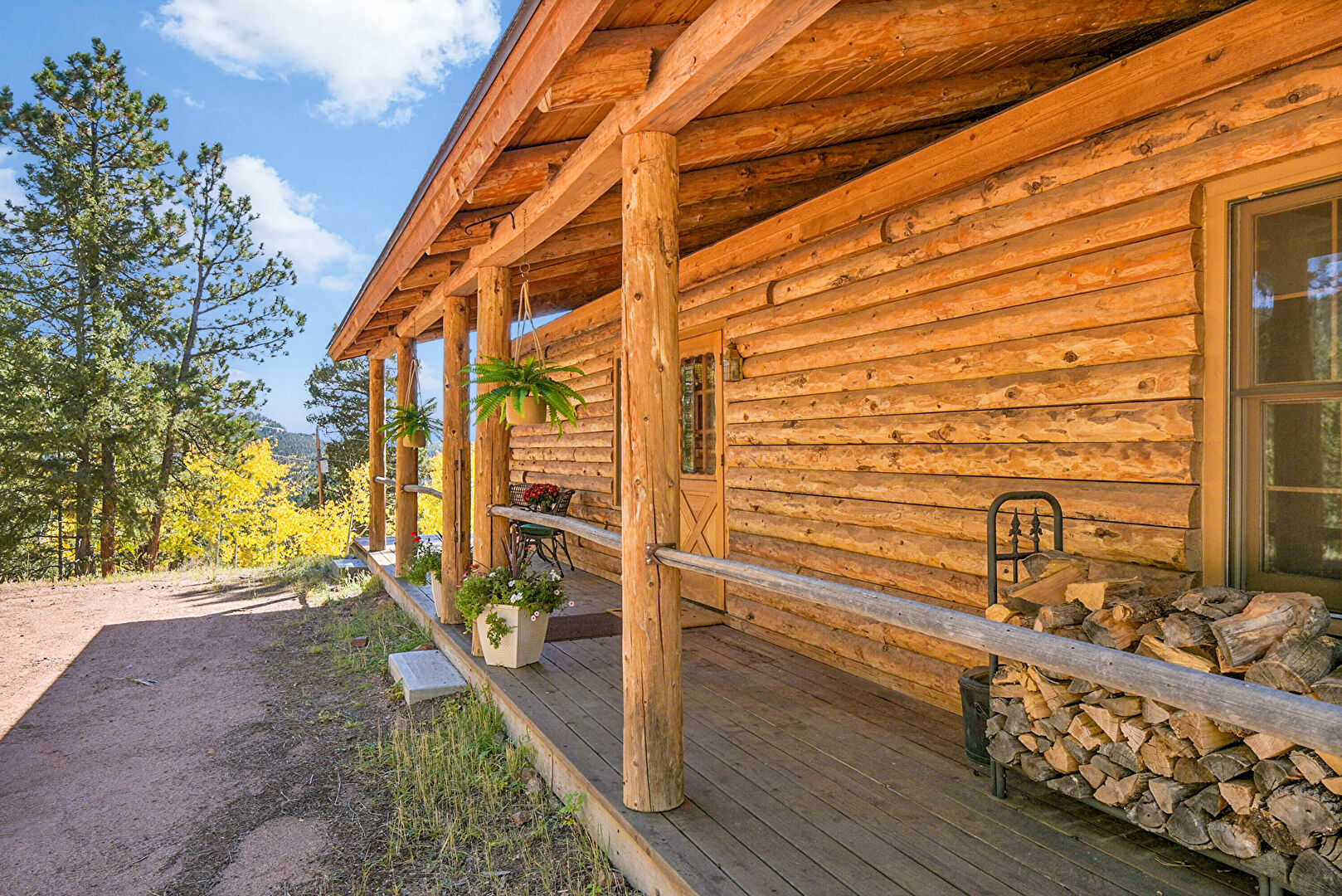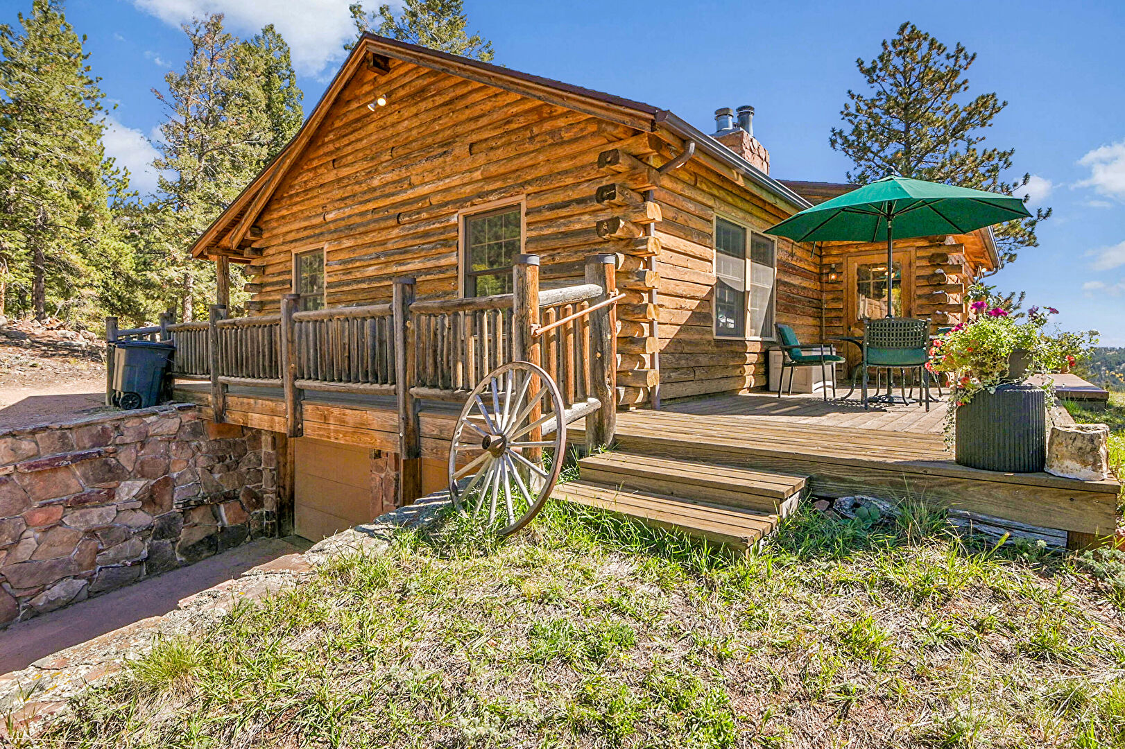 Chimney, Deck, Downspout, Gutters, Horizontal Siding, Outdoor Dining Area, Log Siding