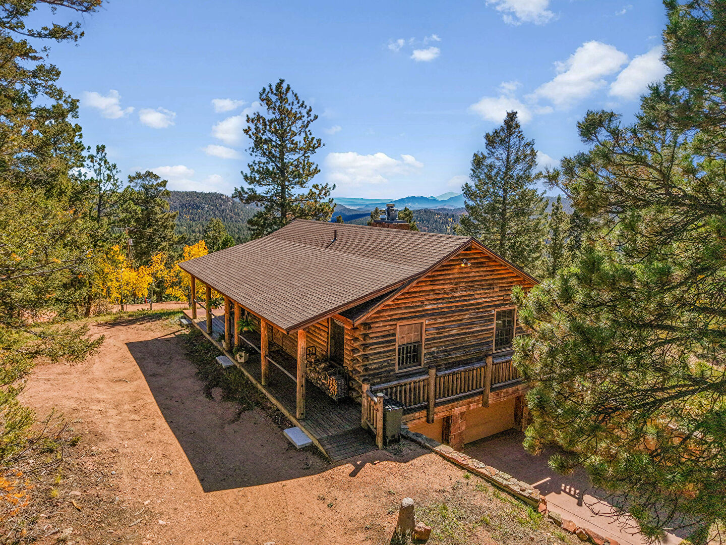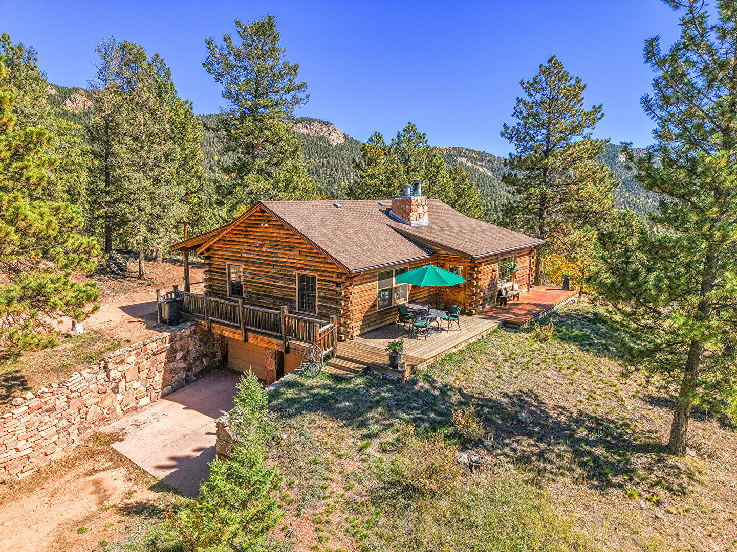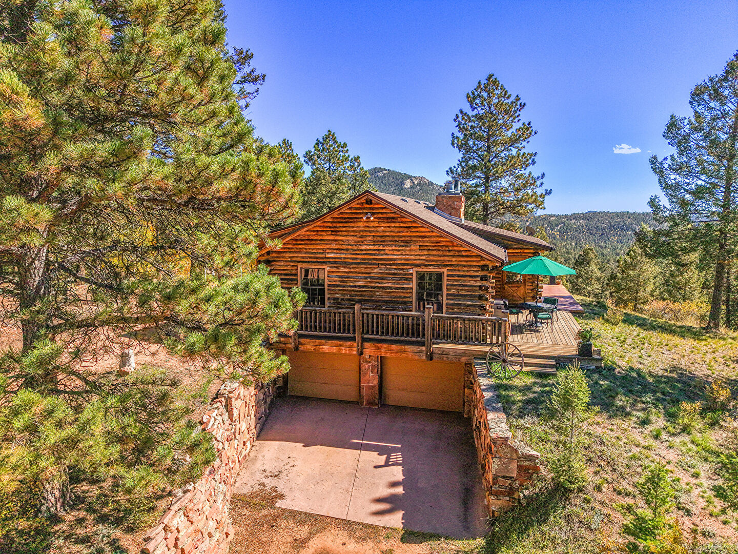 Basement Garage, Built In Garage, Chimney, Deck, Downspout, Driveway, Forest View, Horizontal Siding, Lawn, Log Siding, Mountain View, Parking Pad, Patio, Porch, Shingle Roof, Wood Siding, Basement Garage, Built In Garage, Deck, Gutters, Horizontal Siding, Log Siding