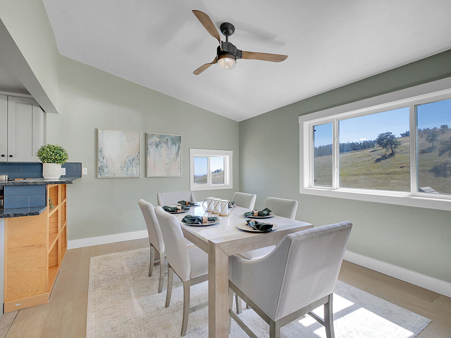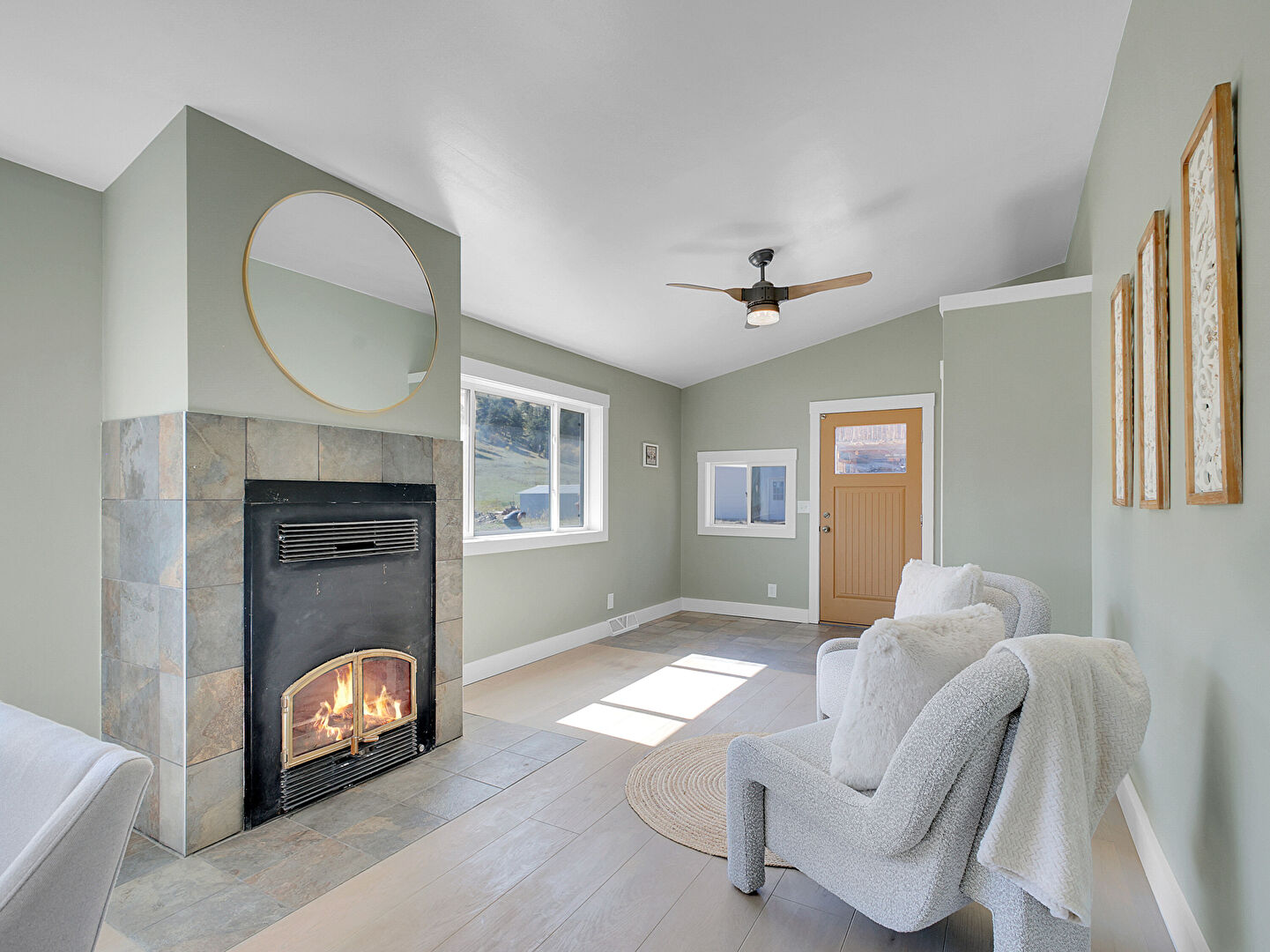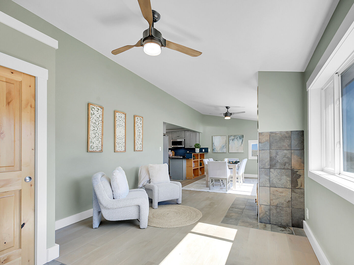 Baseboards Wall, Ceiling Fan, Drywall, Fireplace, Natural Light, Tile Floor, U Shaped Kitchen, Vaulted Ceiling, Vent, Wood Finish Floor, Baseboards Wall, Ceiling Fan, Drywall, Vaulted Ceiling