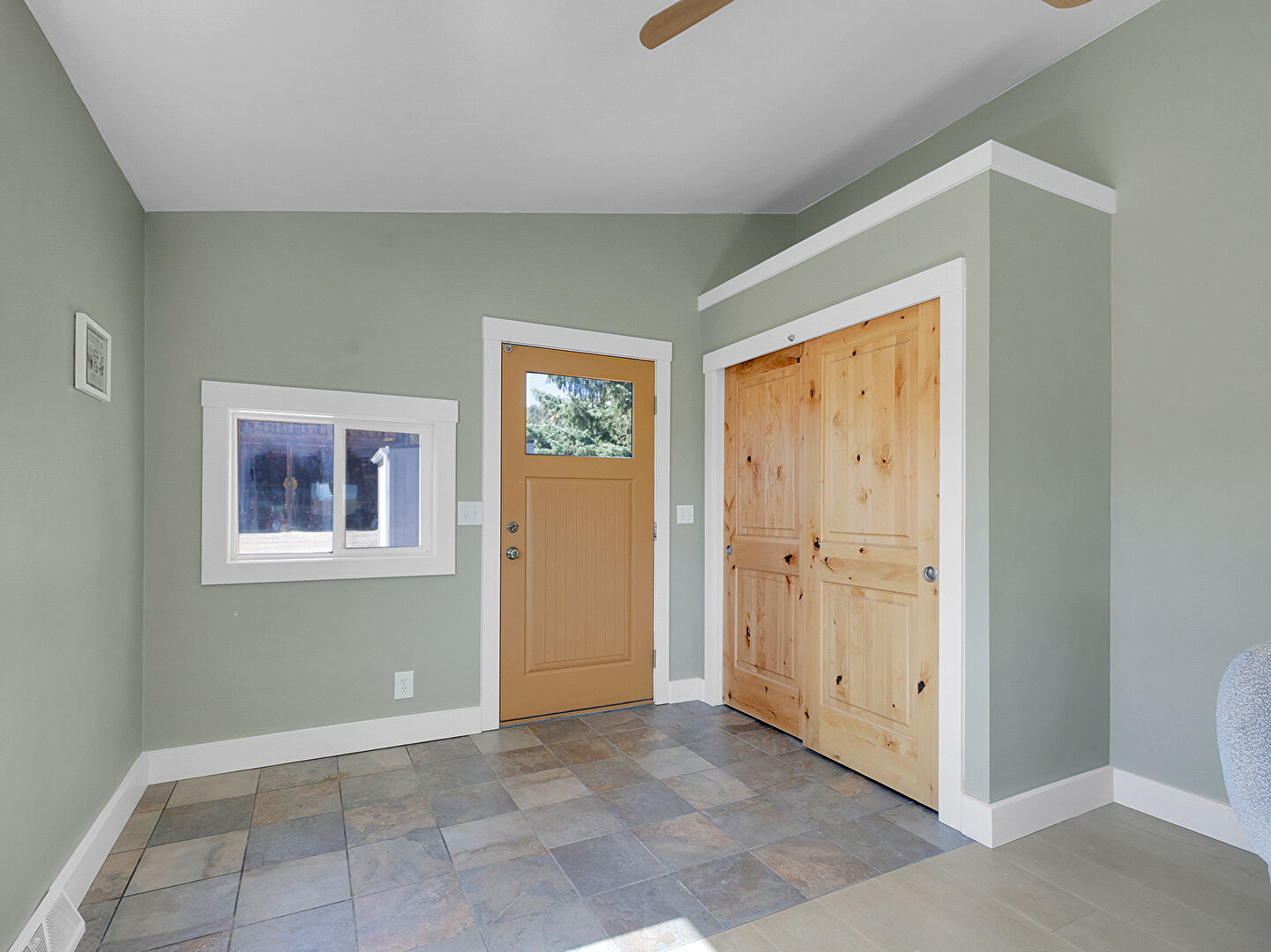 Baseboards Wall, Drywall, Natural Light, Stone Finish Floor, Vaulted Ceiling, Vent, Ceiling Fan
