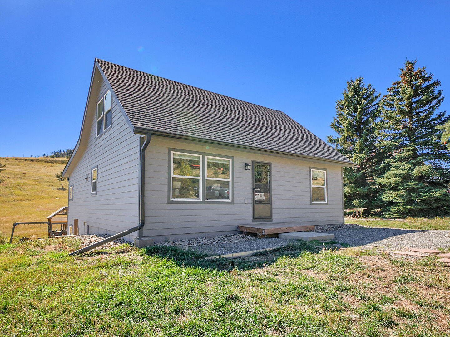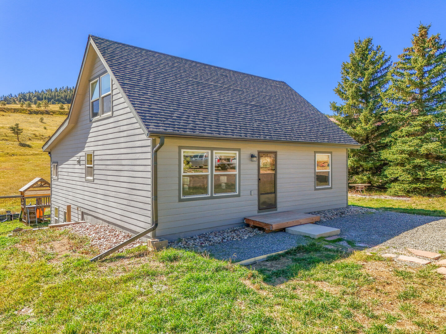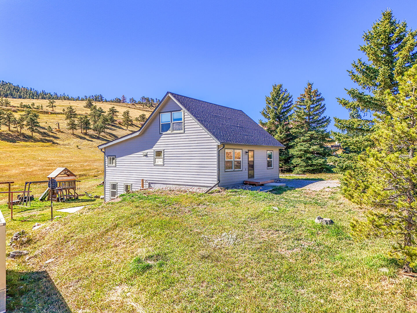 Concrete Foundation, Downspout, Gutters, Horizontal Siding, Playground, Shingle Roof, Lawn