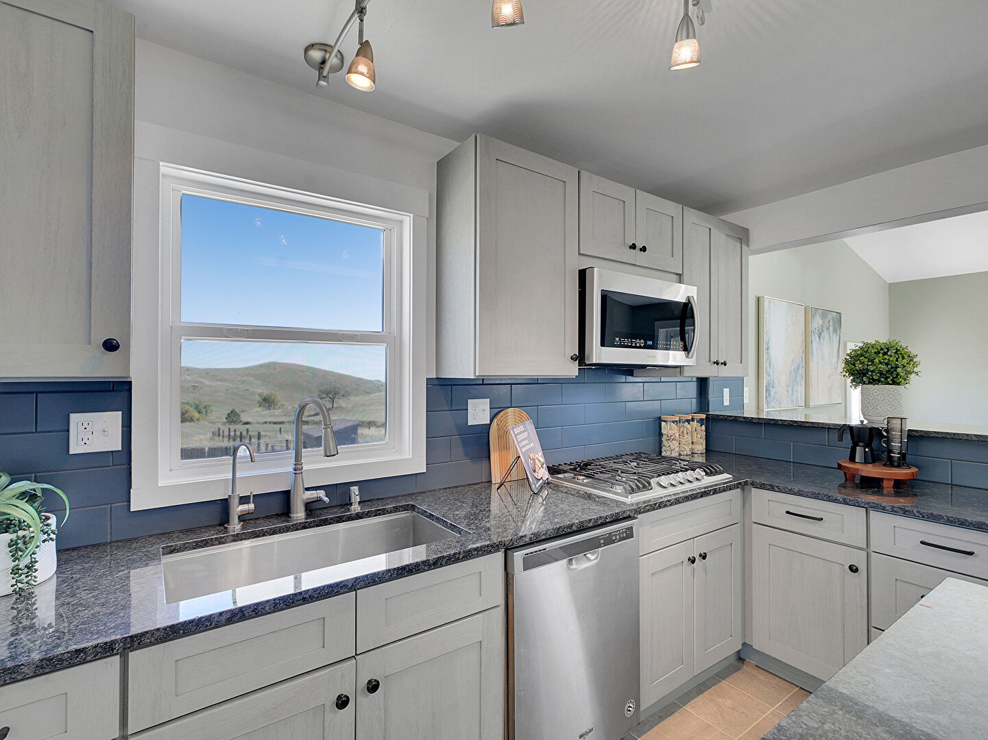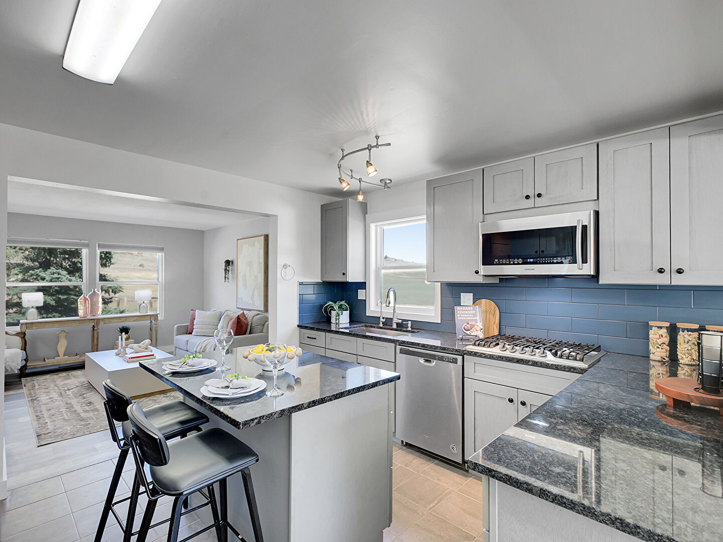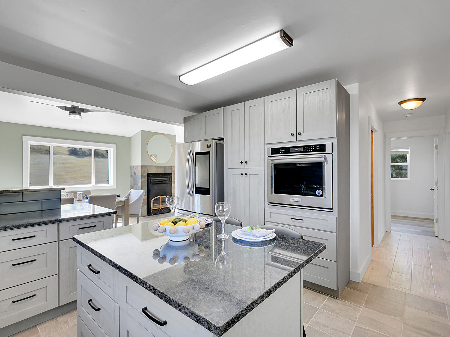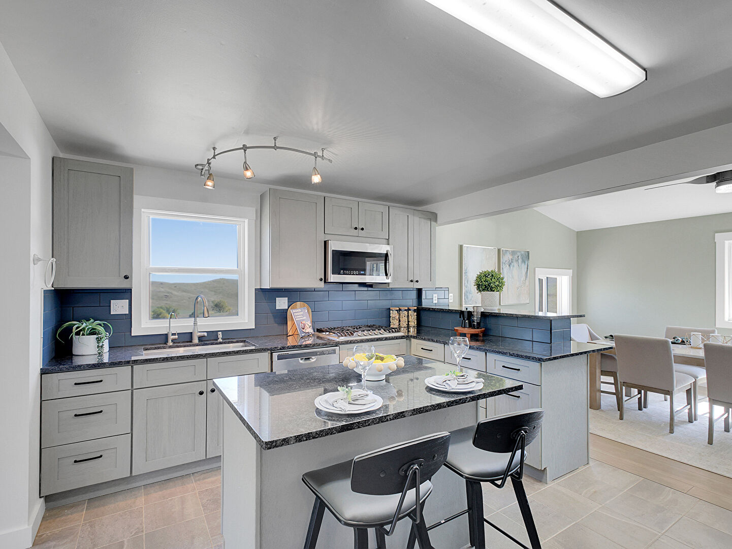 Baseboards Wall, Drywall, Fireplace, Gray Cabinets, Kitchen Bar, Kitchen Island, Kitchen Peninsula, Mountain View, Natural Light, Opens To Living Area, Pendant Lighting, Shaker Cabinets, Stone Countertops, Tile Floor, Track Lighting, Kitchen Bar, Kitchen Island, Natural Light, Pendant Lighting, Shaker Cabinets, Stone Countertops, Tile Floor, Wood Finish Floor