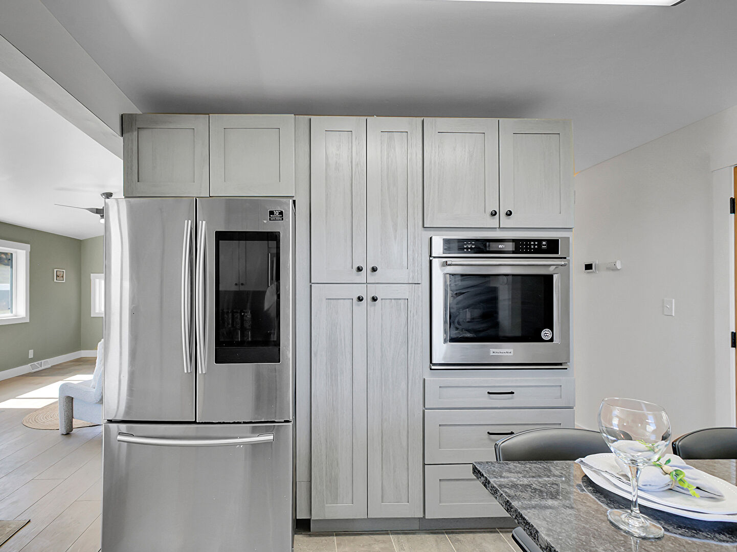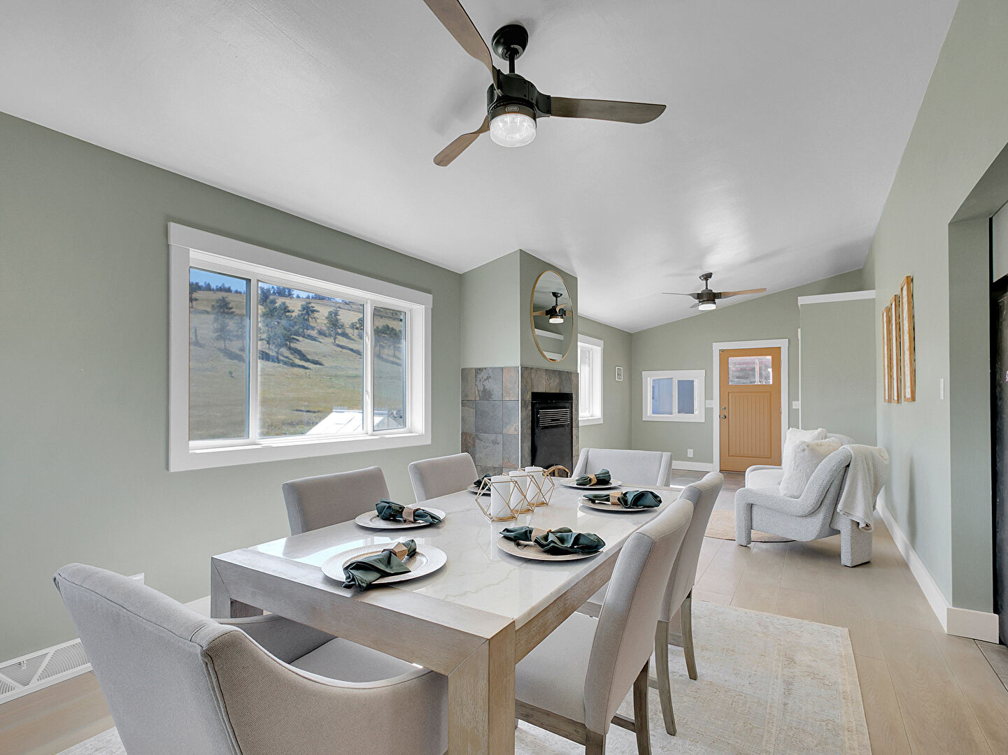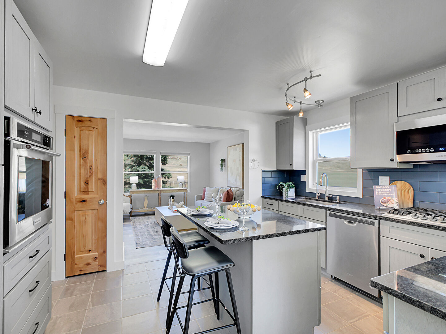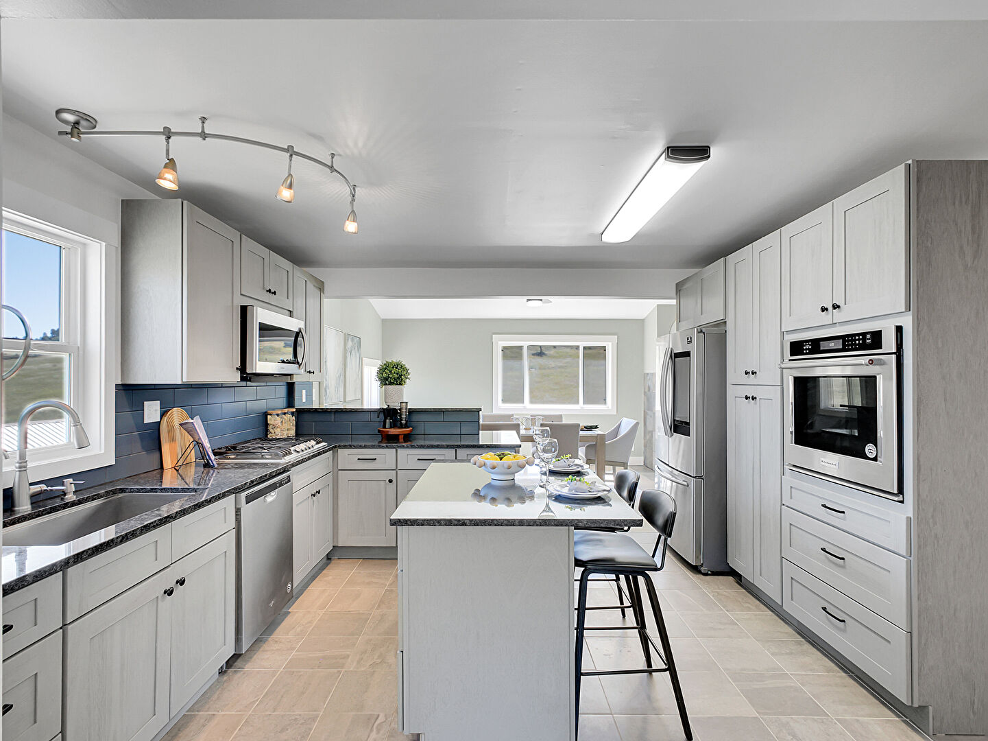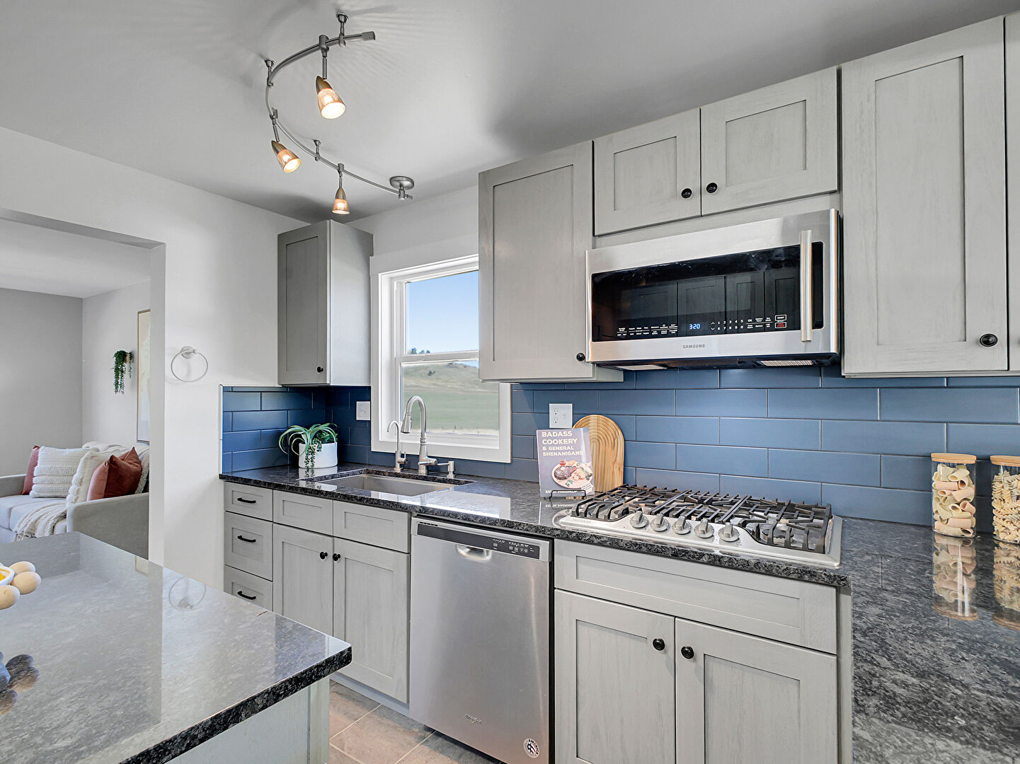 Baseboards Wall, Drywall, Fireplace, Gray Cabinets, Kitchen Bar, Kitchen Island, Kitchen Peninsula, Mountain View, Natural Light, Opens To Living Area, Pendant Lighting, Shaker Cabinets, Stone Countertops, Tile Floor, Track Lighting, Kitchen Bar, Kitchen Island, Natural Light, Pendant Lighting, Shaker Cabinets, Stone Countertops, Tile Floor, Wood Finish Floor