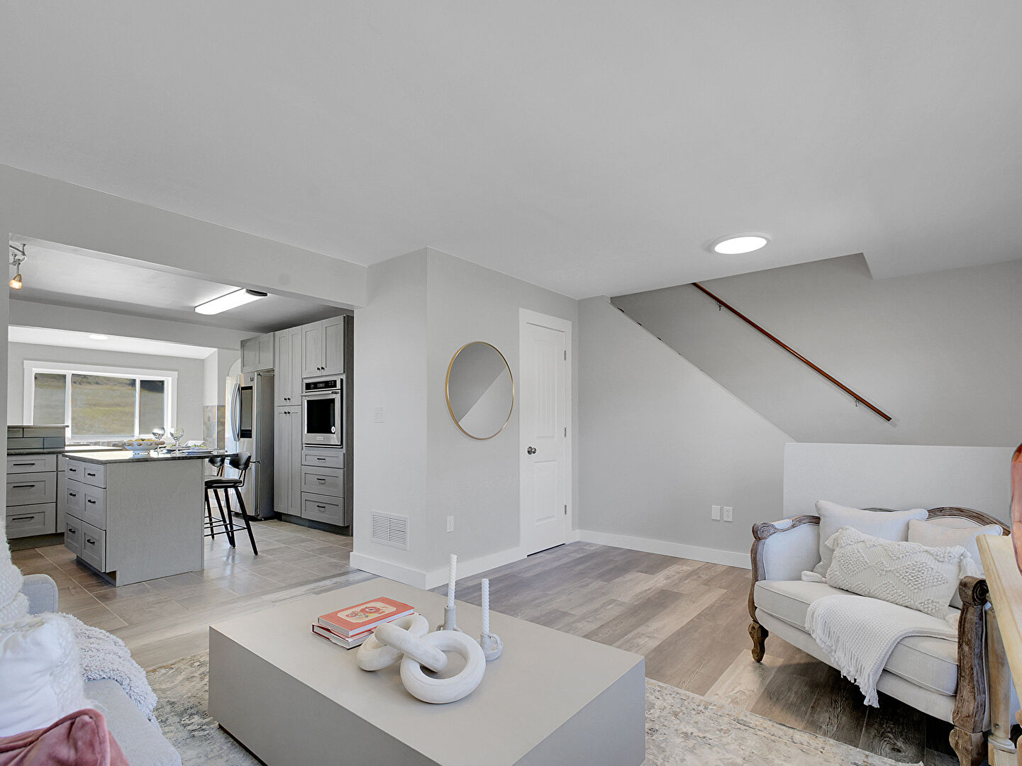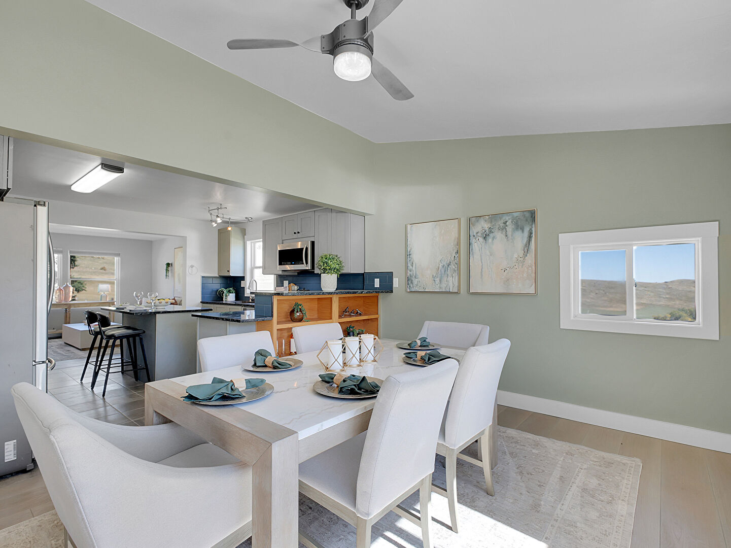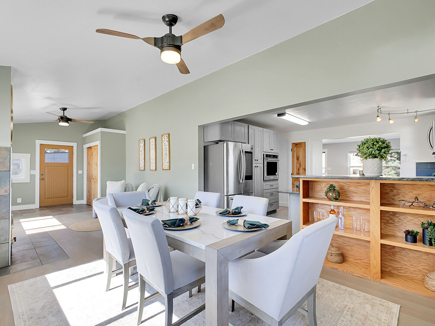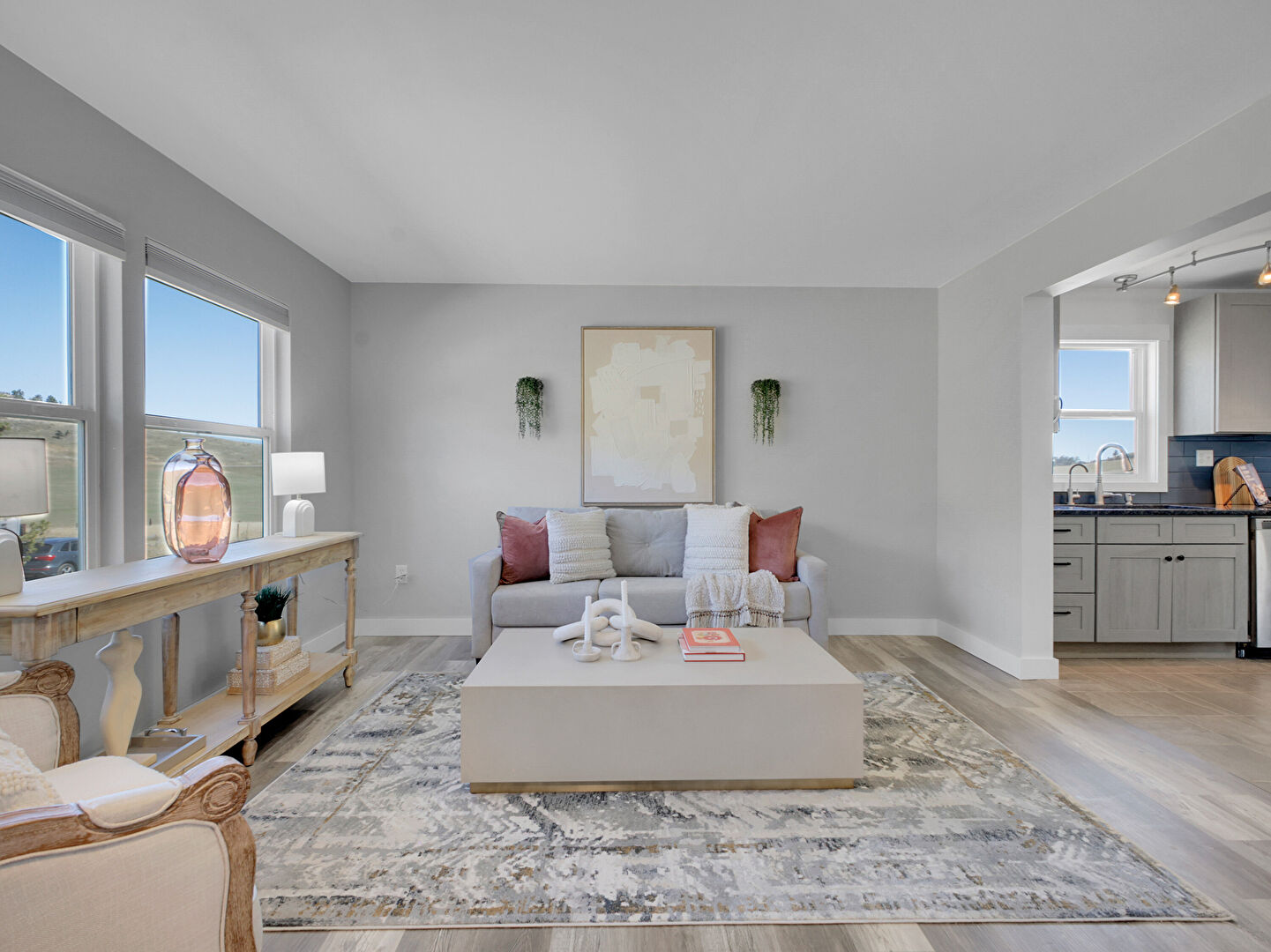 Baseboards Wall, Drywall, Fireplace, Gray Cabinets, Kitchen Bar, Kitchen Island, Kitchen Peninsula, Mountain View, Natural Light, Opens To Living Area, Pendant Lighting, Shaker Cabinets, Stone Countertops, Tile Floor, Track Lighting, Kitchen Bar, Kitchen Island, Natural Light, Pendant Lighting, Shaker Cabinets, Stone Countertops, Tile Floor, Wood Finish Floor
